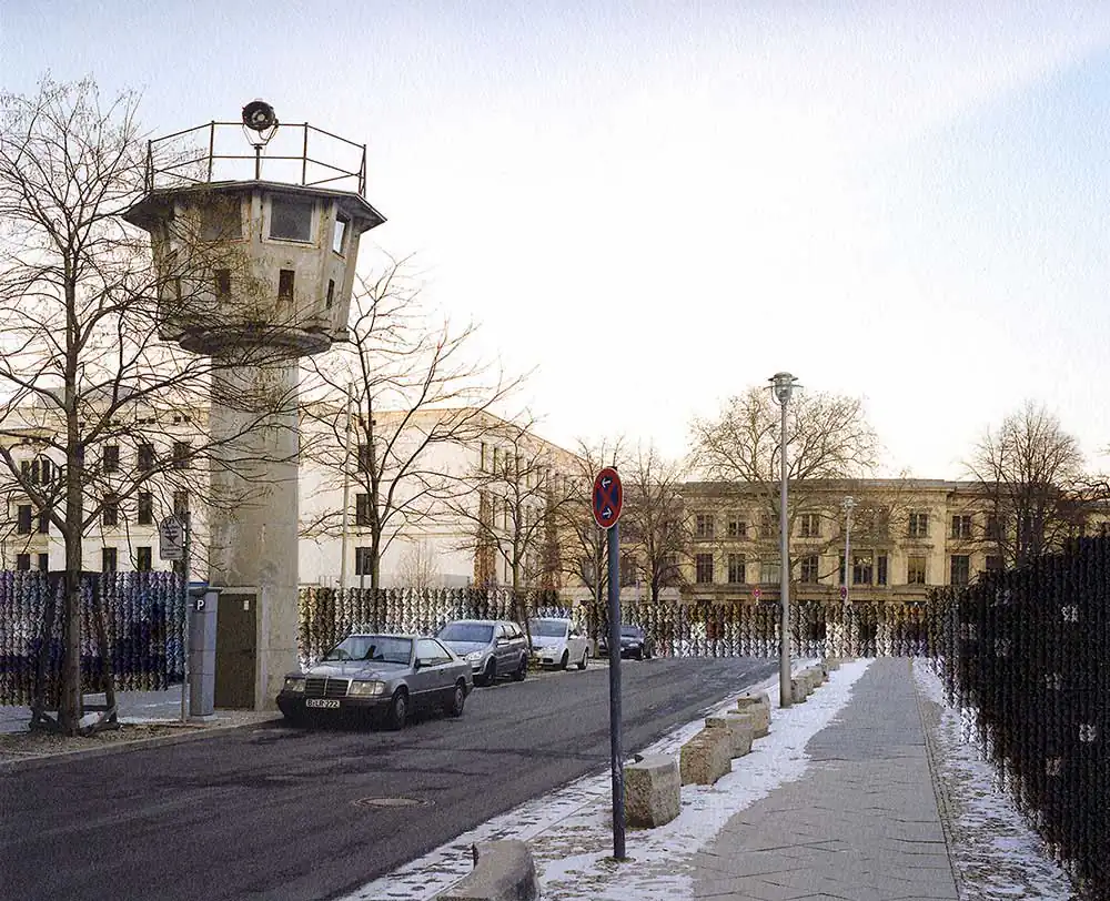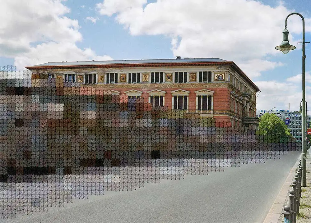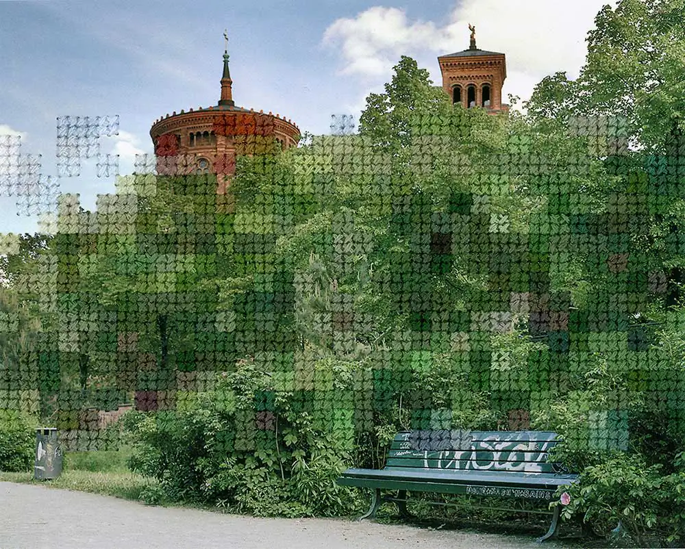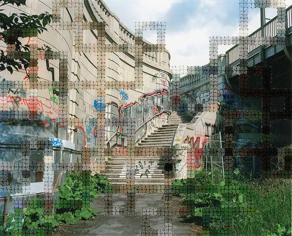Sections of the photographs have been obscured by cross-stitch embroidery sewn directly into the photograph. The embroidery is made to resemble pixels and borrows the visual language of digital imaging in an analog, tactile process. In many images, the embroidered sections represent the exact scale and location of the former Wall offering a pixelated view of what lies behind. In this way, the embroidery appears as a translucent trace in the landscape of something that no longer exists but is a weight on history and memory. I am interested in the porous nature of memory as well the means by which photography transforms history into nostalgic objects that obscure objective understandings of the past.