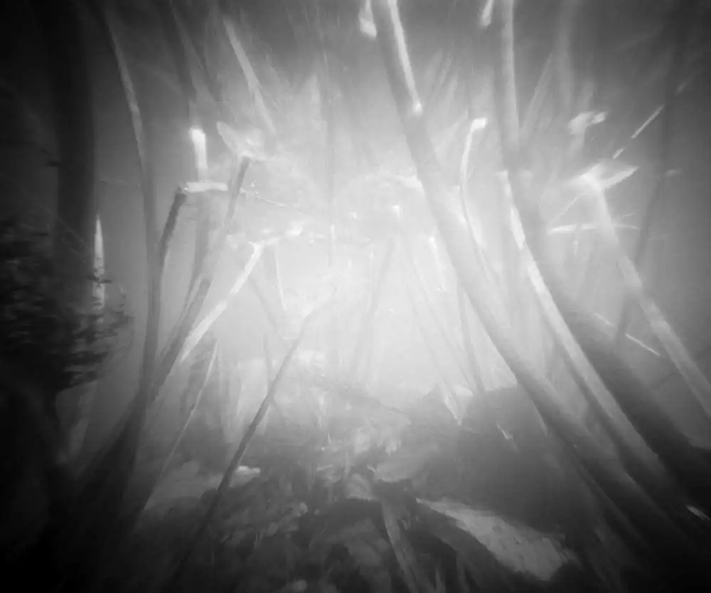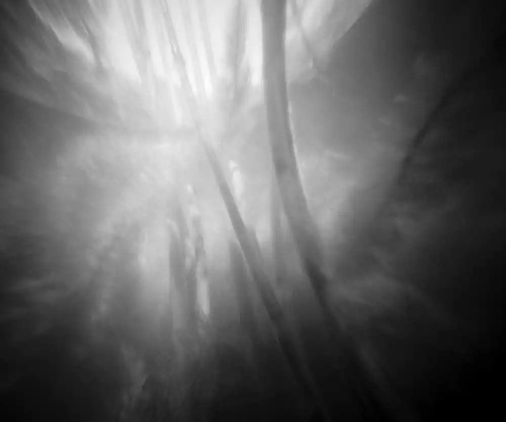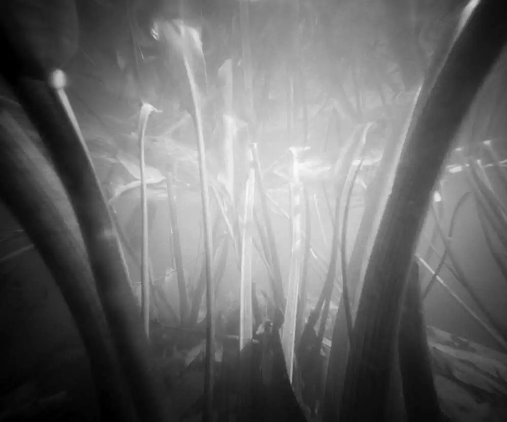 A silent space where the vertical growths of the plants crosses the horizontal flow of the water. An endless movement between different aggregate states. A space that reduces painting with light into painting with remaining light and requires longtime exposures under water. Especially with a pinhole camera, the exposures endure up to 20 minutes. The resulting images appear like drawings, even like dropped out of our world, but are nothing more than the longtime exposures of a reality, that we often do not even are aware of. [Official Website]