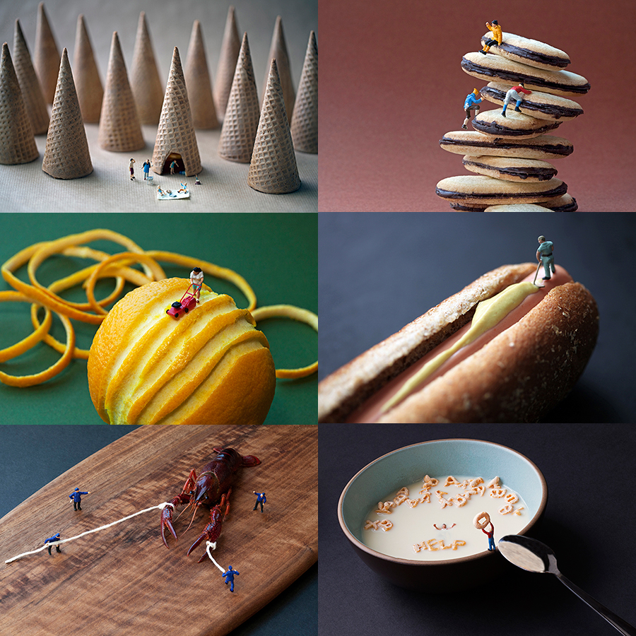 Big Appetites (2003-present) is a a series of fine art photographs that features tiny, meticulously hand-painted figures photographed against real food environments.