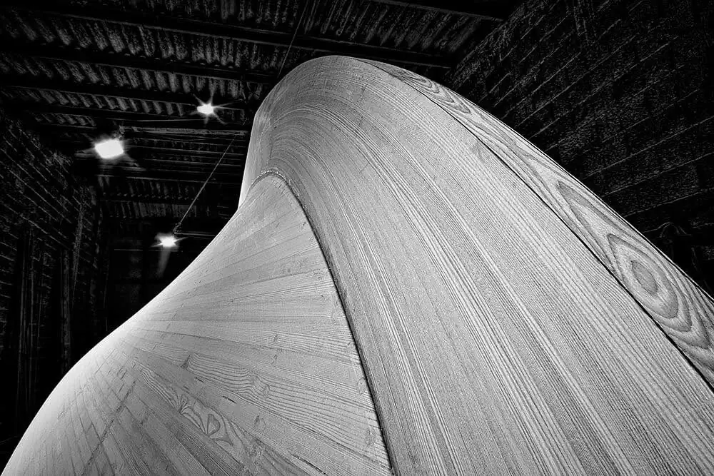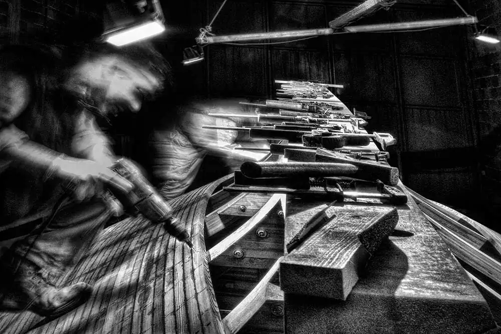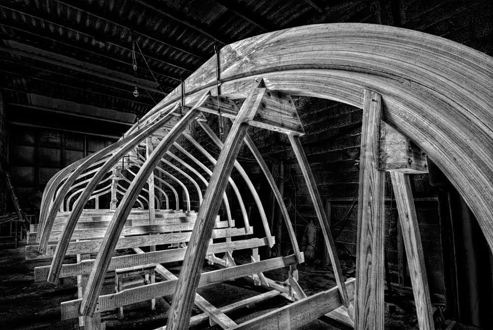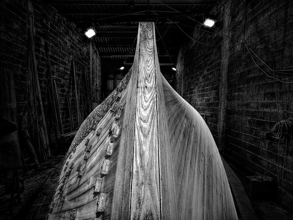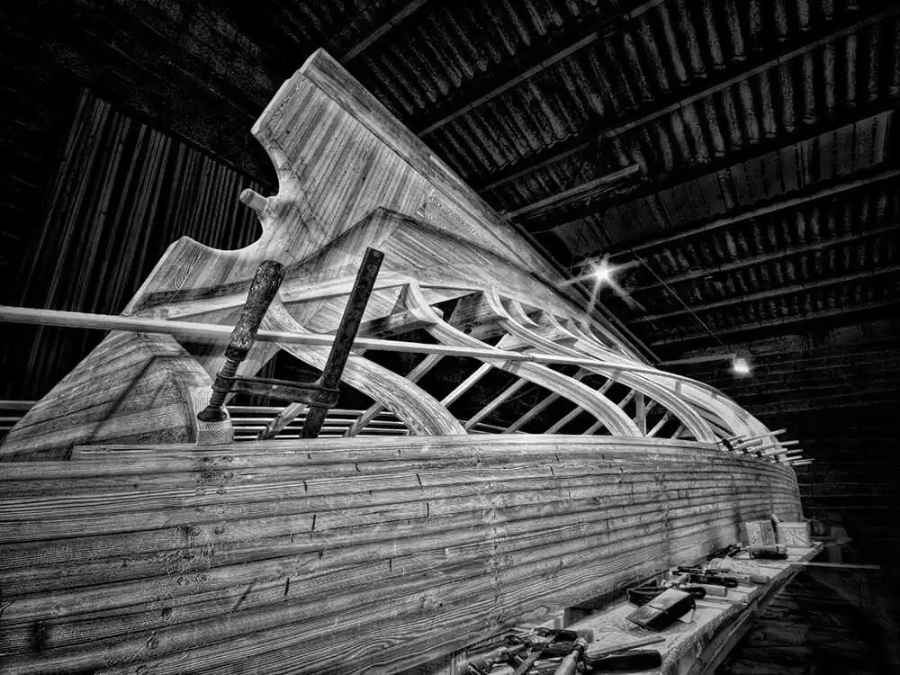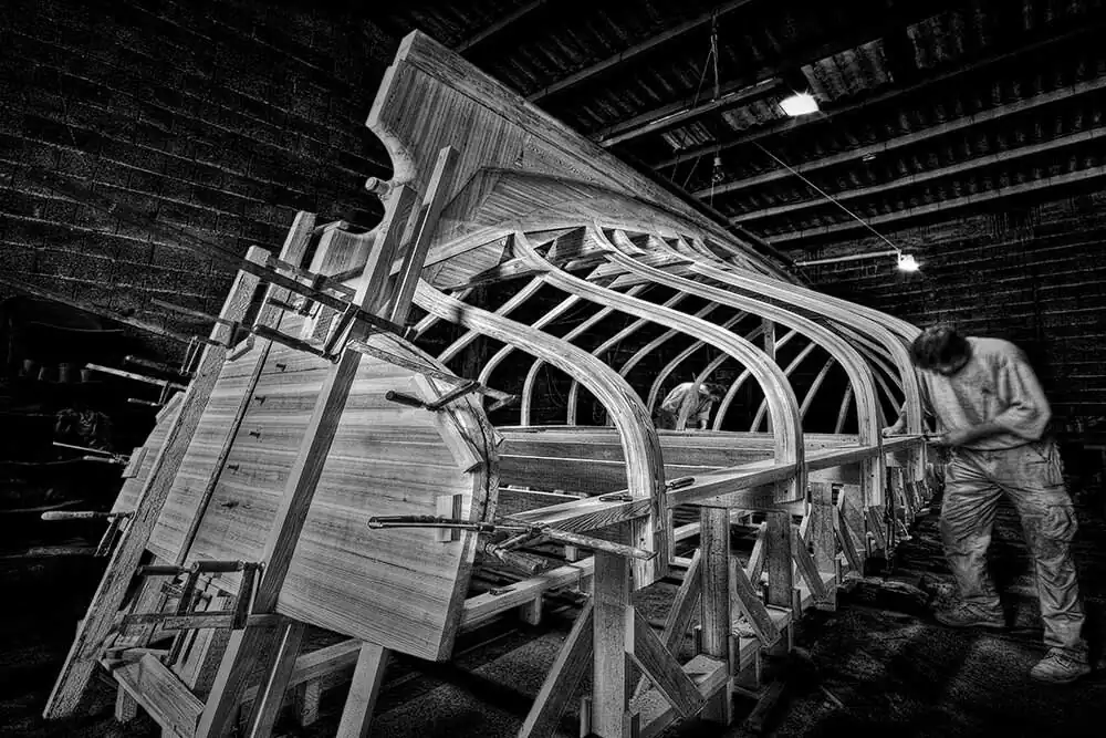 The ugly hangar progressively turned into place of worship almost like a church, where people came to pay their respect and admiration to a man who chose larch and iroko instead of plastics; the place like a concert hall radiating background echo of the sounds made by the tools, whispers, conversations, jokes and the thoughts of the boat builder and every spectator and bystander. All the pessimism had gone.