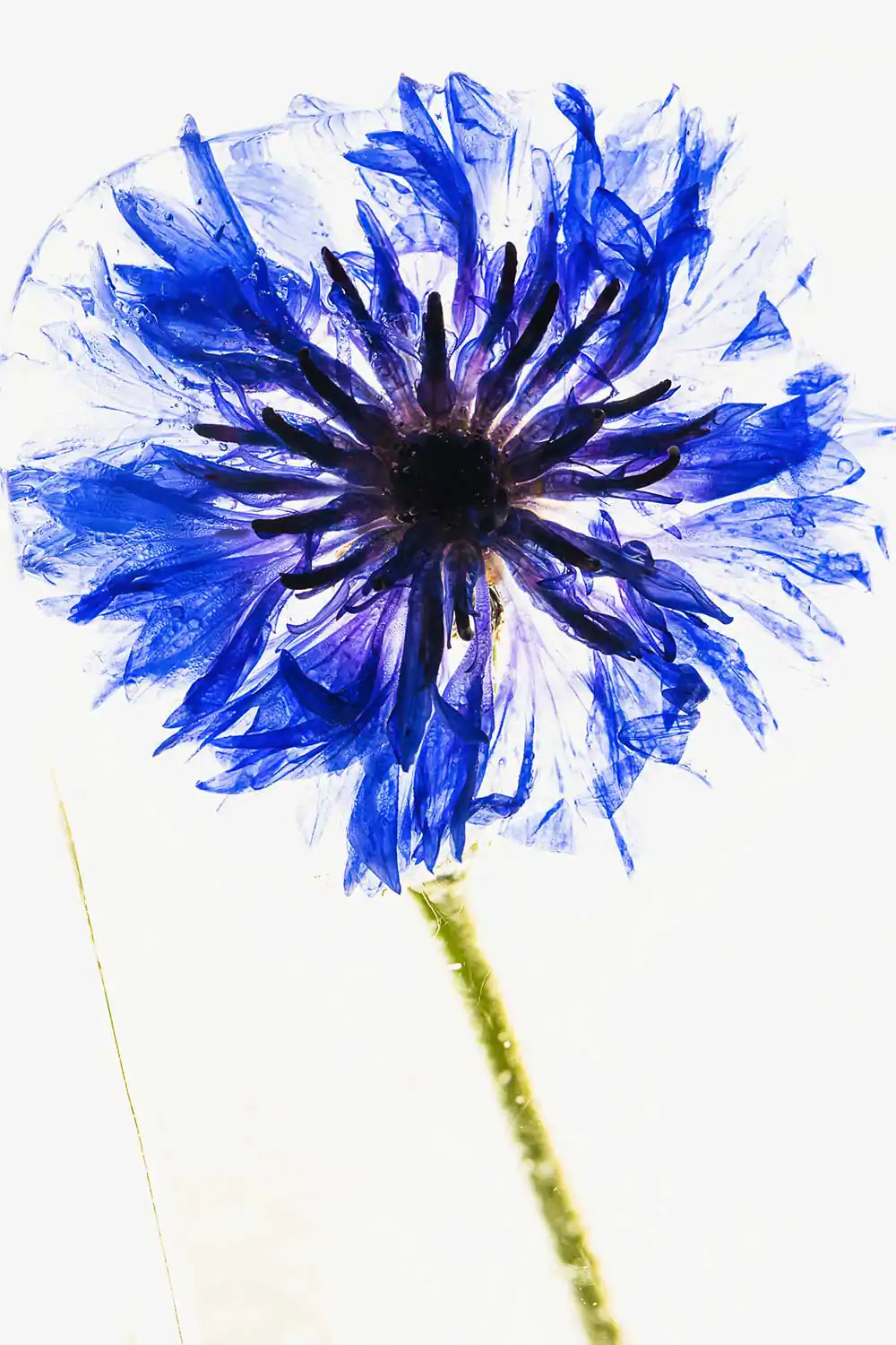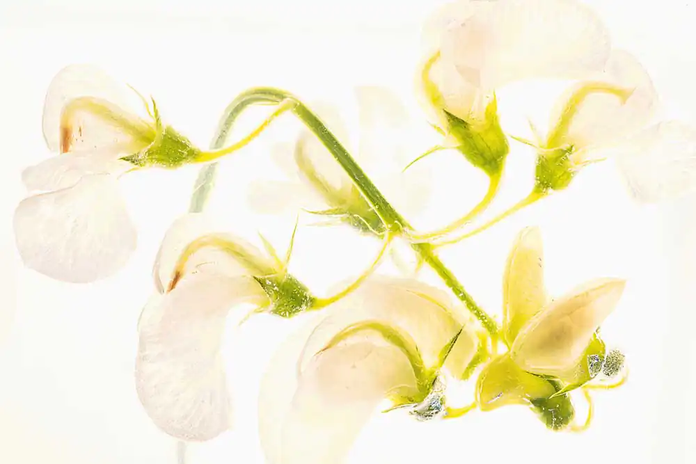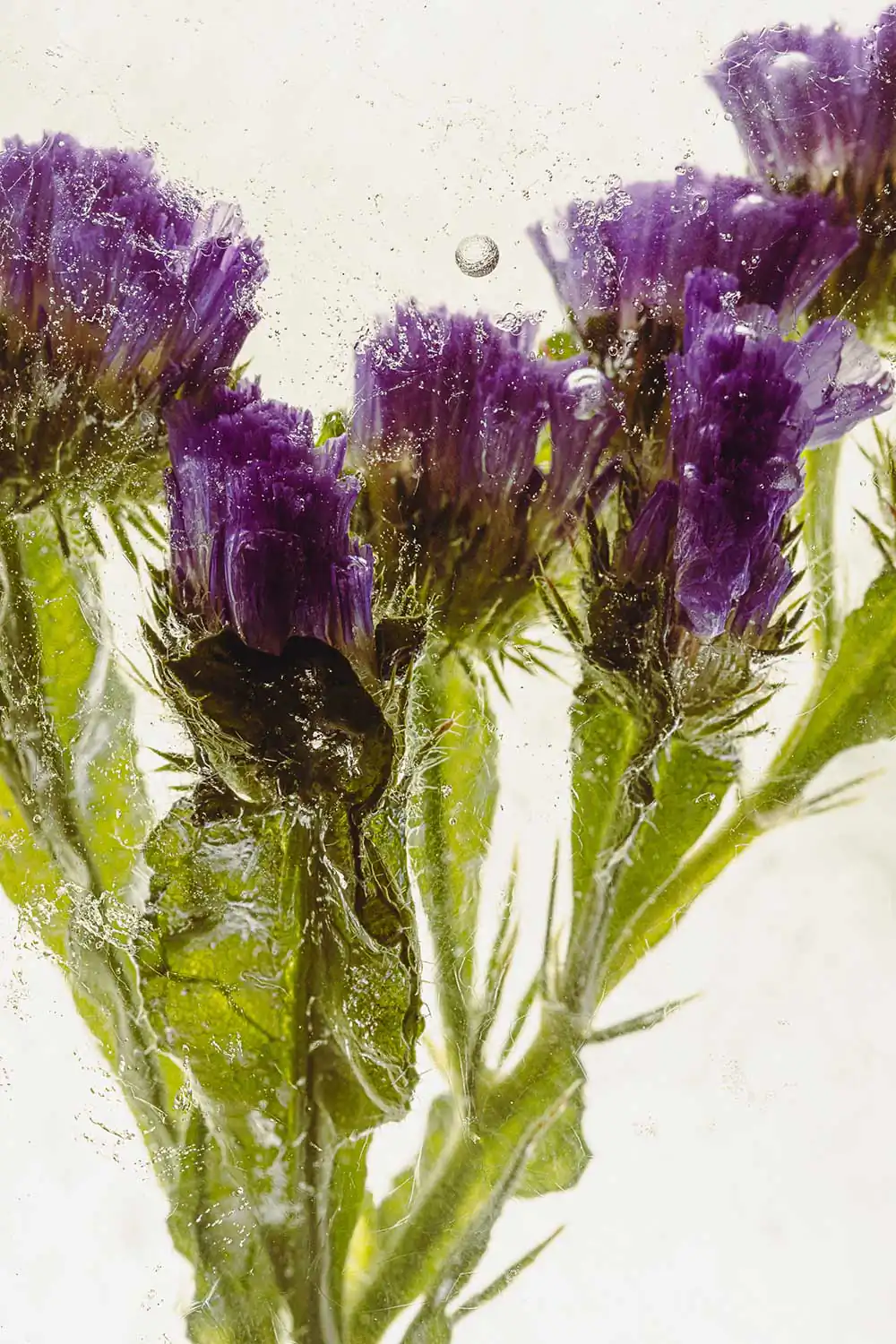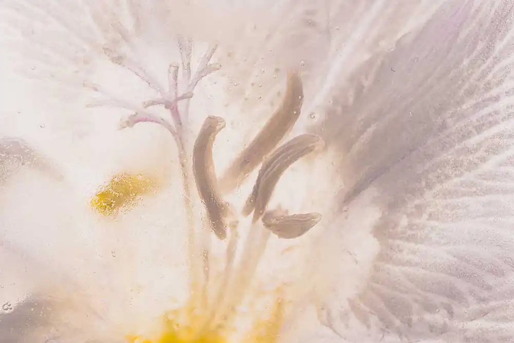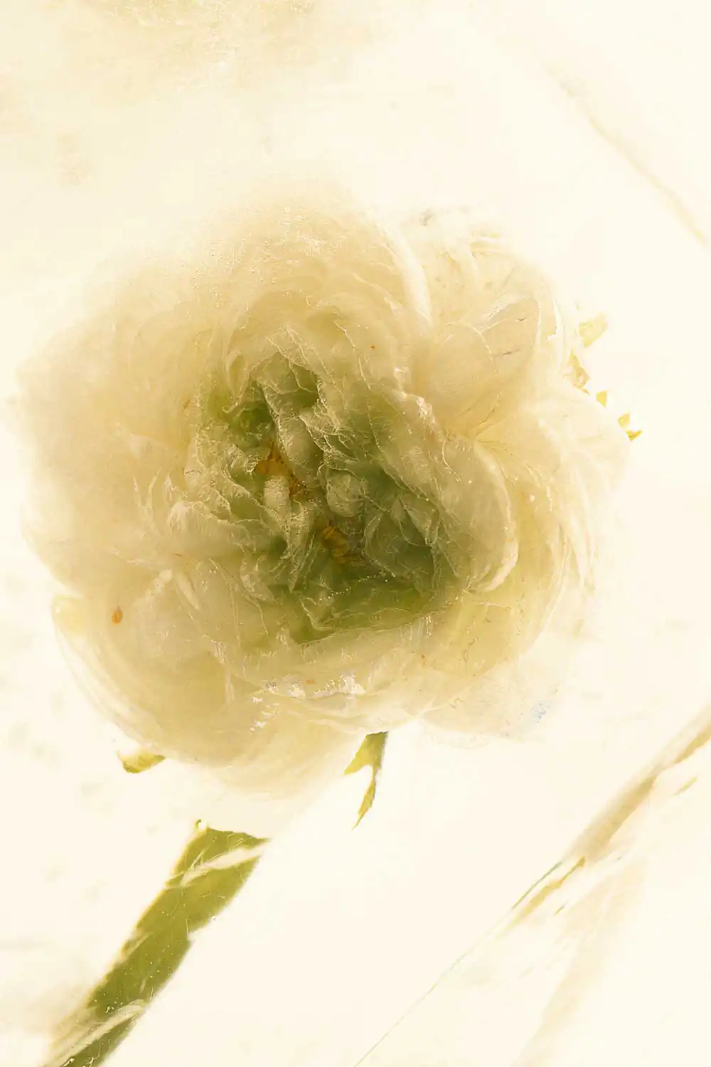 The project started with ice cubes in my fridge, but now, over time, I am using a deep freezer, and I can freeze larger blossoms than at the beginning of the project. At first, I didn’t want to work with white blossoms, but white blossoms always have a very special look in the ice. So now I like them most in the ice. [Official Website]