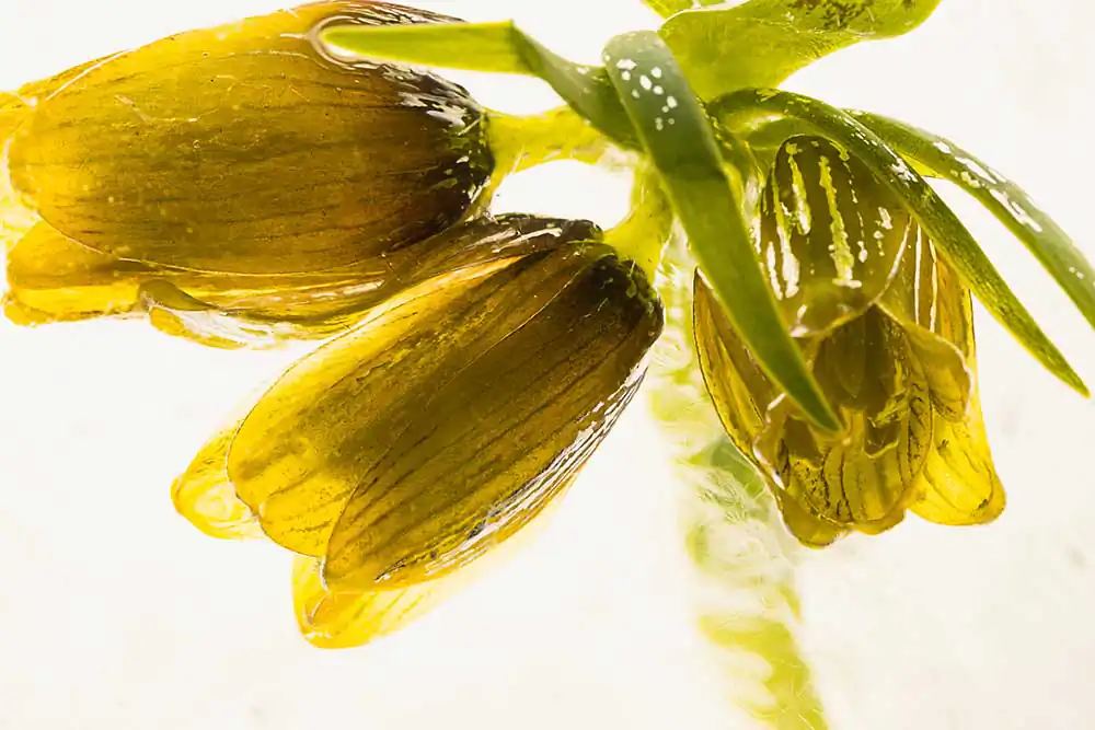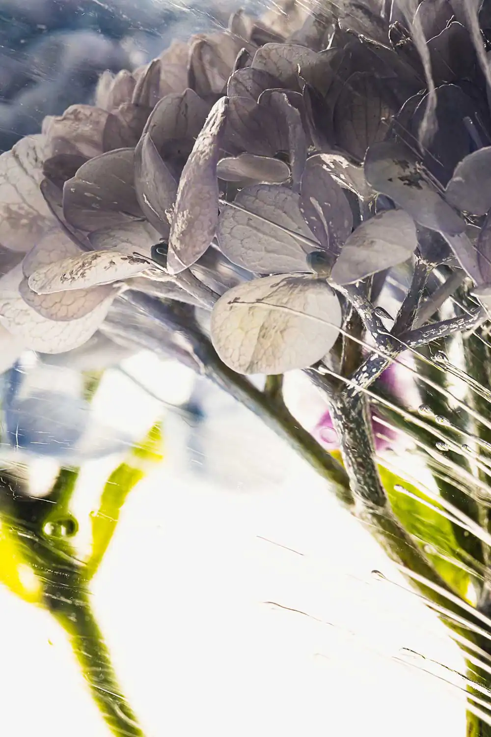 At first, I was fascinated by things that are enclosed in amber. So, I thought about how I could enclose things in a solid and transparent container. That year, we had a cold winter with lots of ice on the rivers here in Hamburg. My florist always told me how to handle the flowers I bought, so that they would last a long time. Then, one day, I dared to tell him what I used the flowers for. I showed him some photos, and since then, he has often had flowers for me that he can no longer sell because they have blossomed too far. For me, of course, they are just right.
