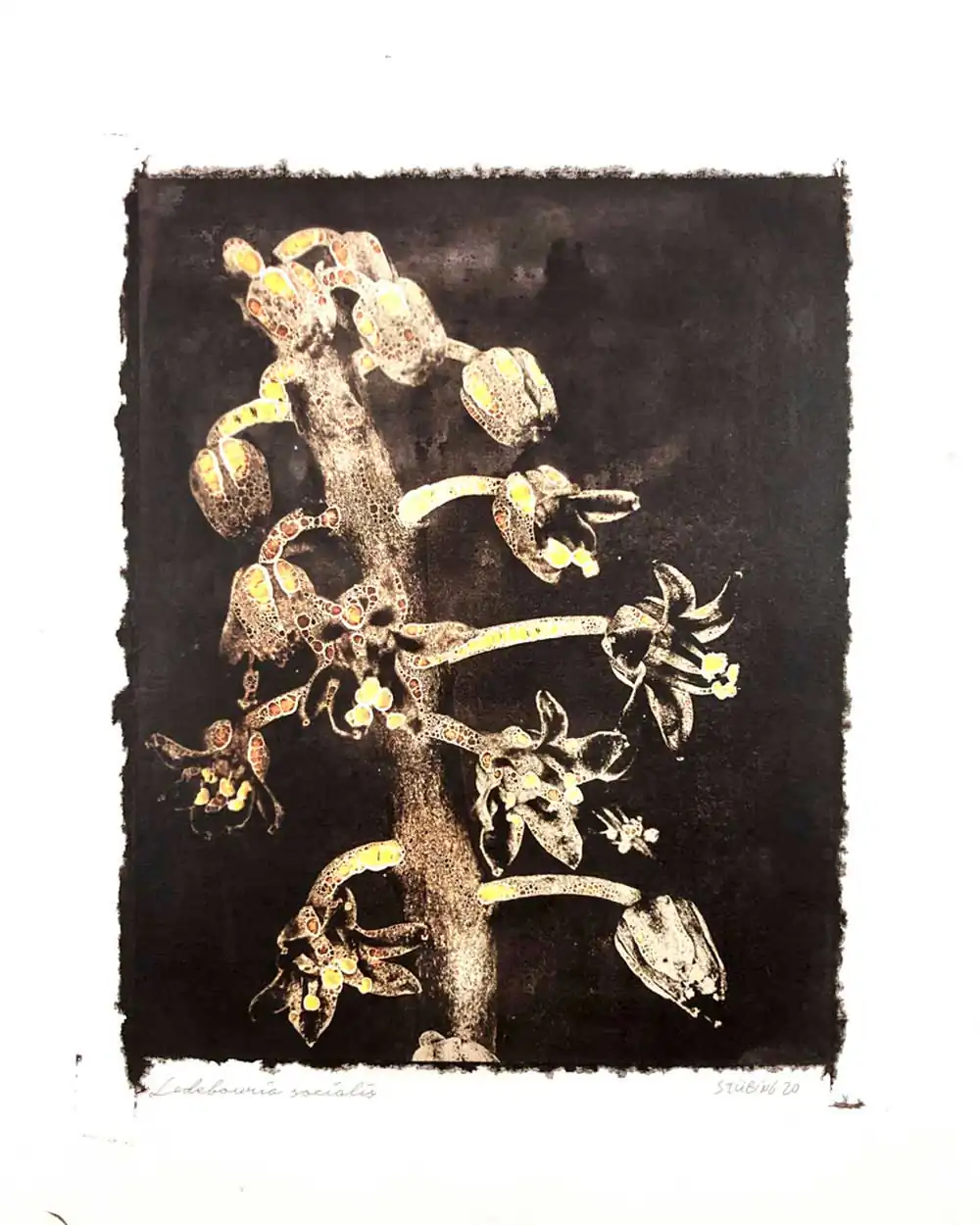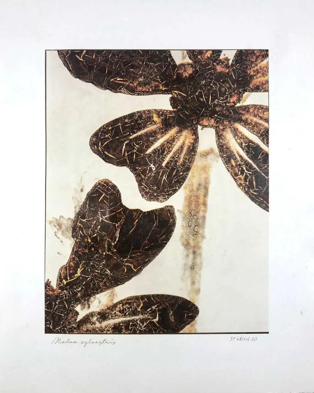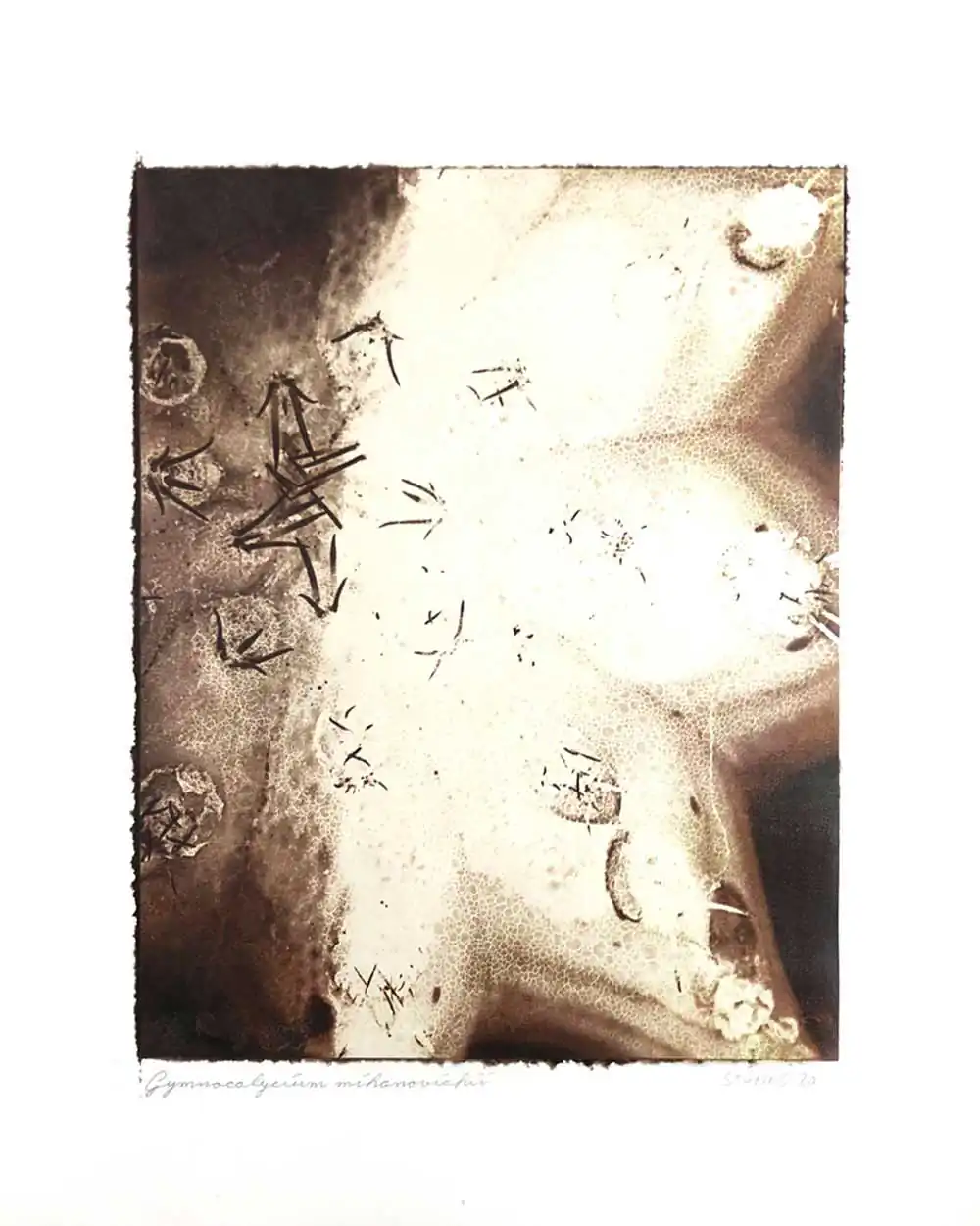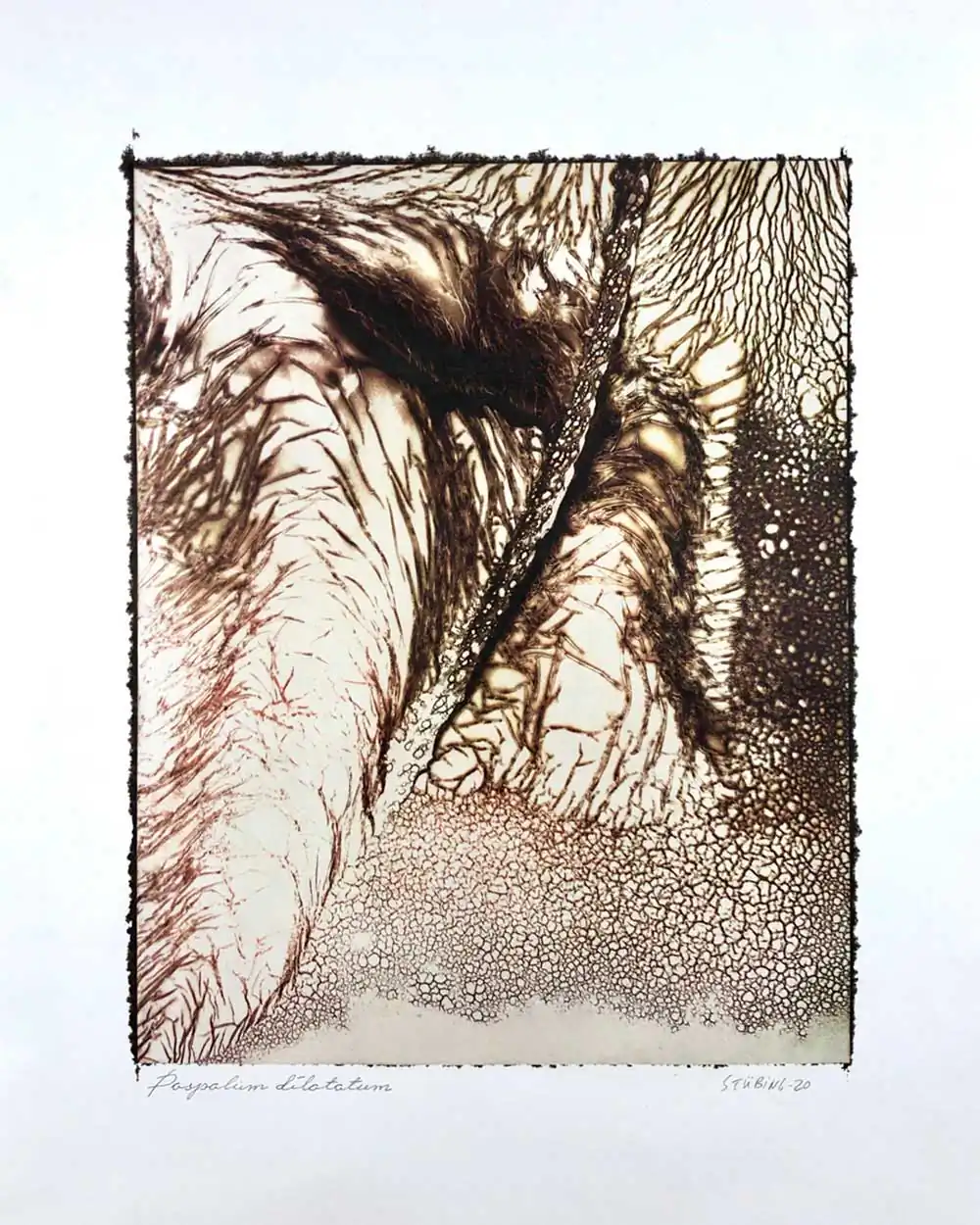 The degradative process (mordancage) to which the negatives are damaged reveals structures that recall the behavior of the soil and plants when subjected to the effects of excessive drought and heat, both main consequences of the desertification originated by the climatic change. I start from macro photographs made with an old Polaroid CU-5 “hand” loaded with 4×5 B&W film (Ilford Delta 100 or Fomapan 100). The negatives are treated with an adapted (softer as for gelatin silver prints) mordancage formula. The resulting altered and partiallly destroyed negative is scanned and used as base for the final print. On one side I print a xerography on a transparency from the CMY channels, and after this I transfer it on paper using solvent and an etching press. With the K channel a contact negative is printed on a transparency and is contact printed overlayed using the argyrotype technique.