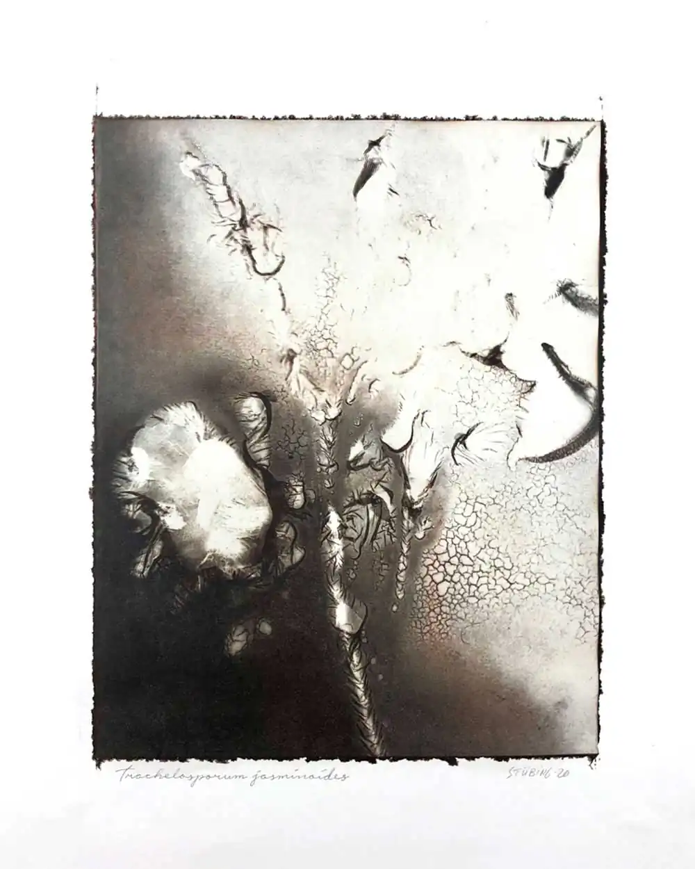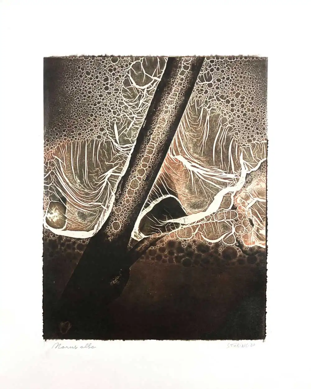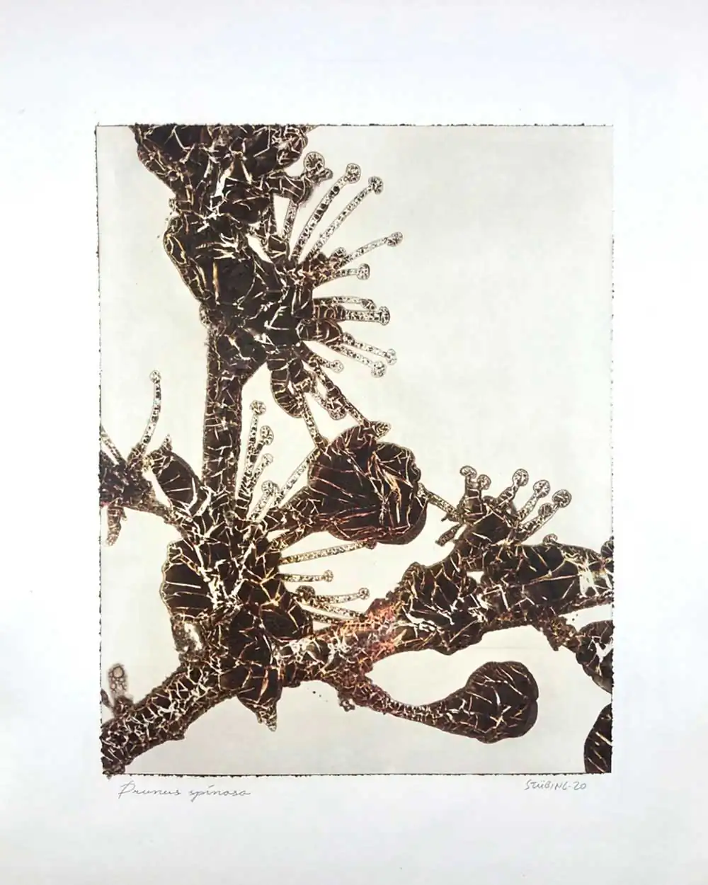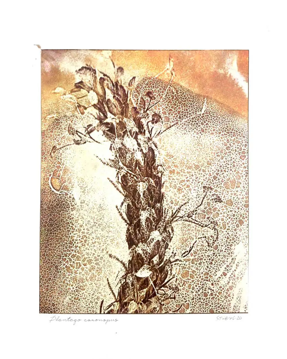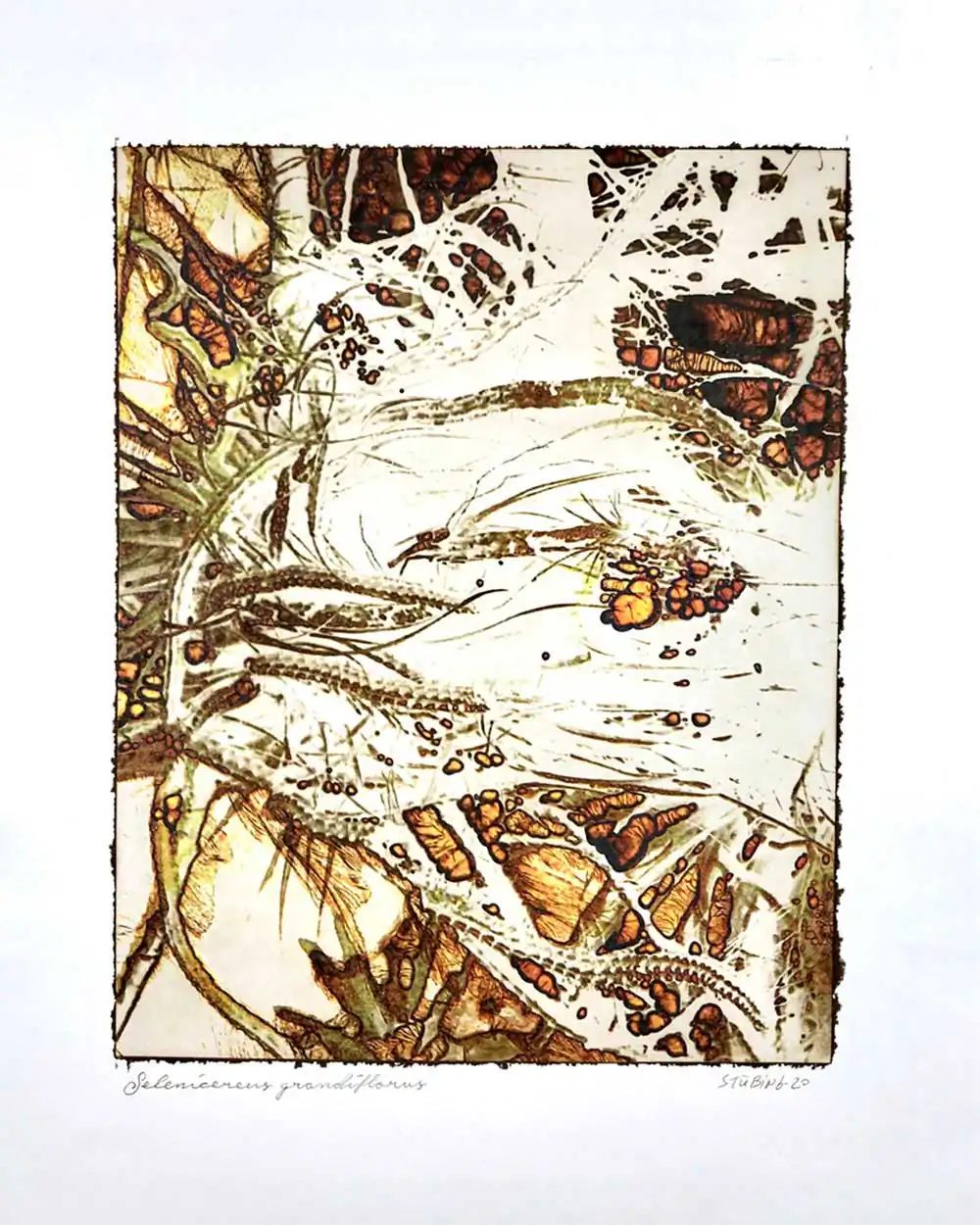 The degradative process (mordancage) to which the negatives are damaged reveals structures that recall the behavior of the soil and plants when subjected to the effects of excessive drought and heat, both main consequences of the desertification originated by the climatic change. I start from macro photographs made with an old Polaroid CU-5 “hand” loaded with 4×5 B&W film (Ilford Delta 100 or Fomapan 100). The negatives are treated with an adapted (softer as for gelatin silver prints) mordancage formula. The resulting altered and partiallly destroyed negative is scanned and used as base for the final print. On one side I print a xerography on a transparency from the CMY channels, and after this I transfer it on paper using solvent and an etching press. With the K channel a contact negative is printed on a transparency and is contact printed overlayed using the argyrotype technique.