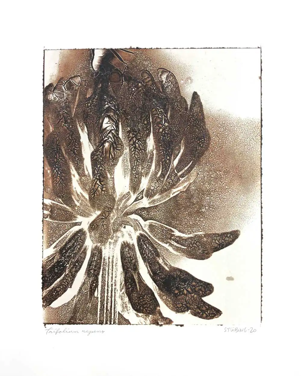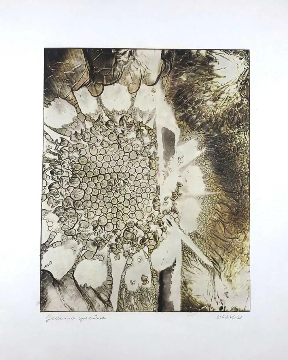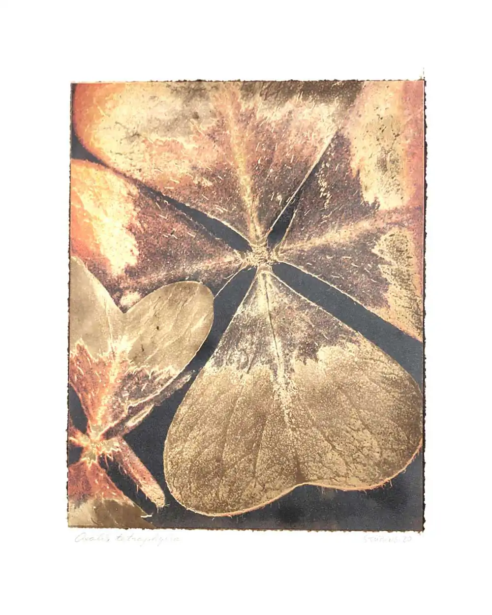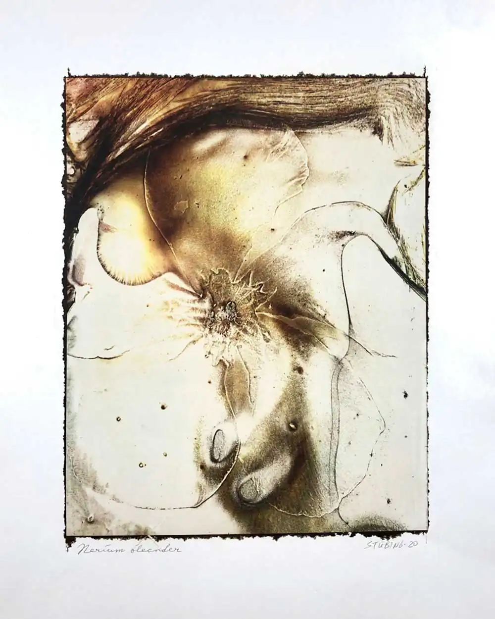 The degradative process (mordancage) to which the negatives are damaged reveals structures that recall the behavior of the soil and plants when subjected to the effects of excessive drought and heat, both main consequences of the desertification originated by the climatic change. I start from macro photographs made with an old Polaroid CU-5 “hand” loaded with 4×5 B&W film (Ilford Delta 100 or Fomapan 100). The negatives are treated with an adapted (softer as for gelatin silver prints) mordancage formula. The resulting altered and partiallly destroyed negative is scanned and used as base for the final print. On one side I print a xerography on a transparency from the CMY channels, and after this I transfer it on paper using solvent and an etching press. With the K channel a contact negative is printed on a transparency and is contact printed overlayed using the argyrotype technique.
