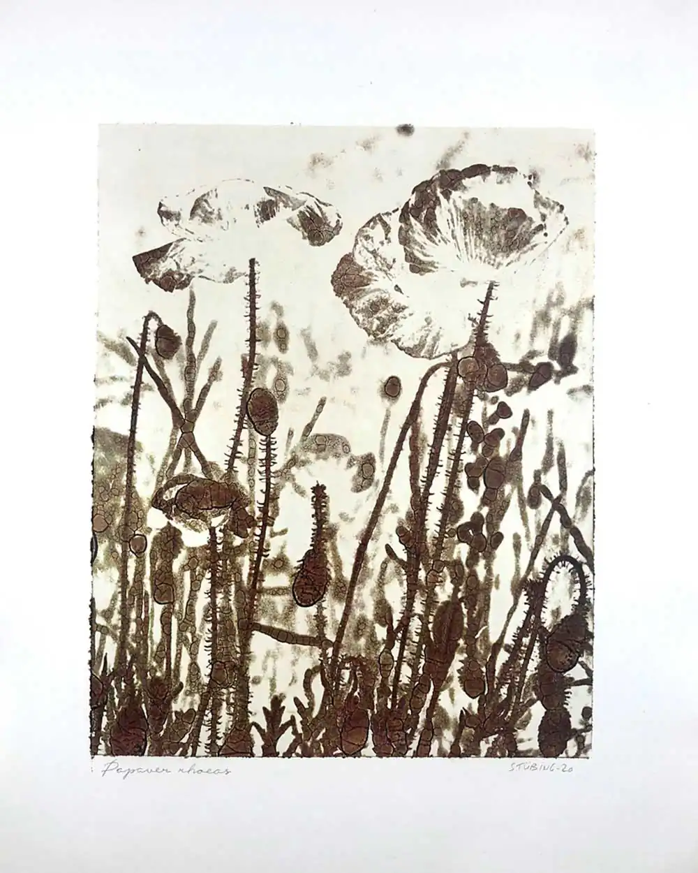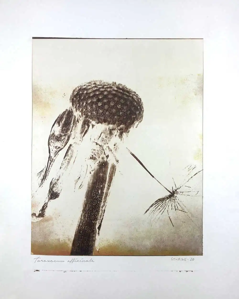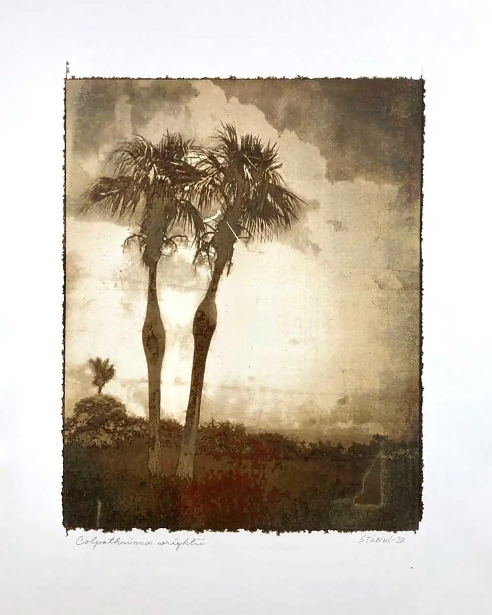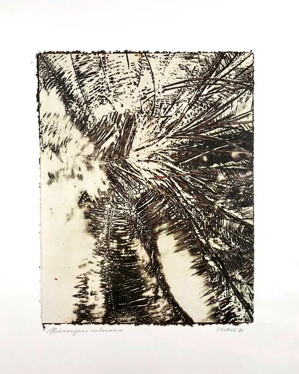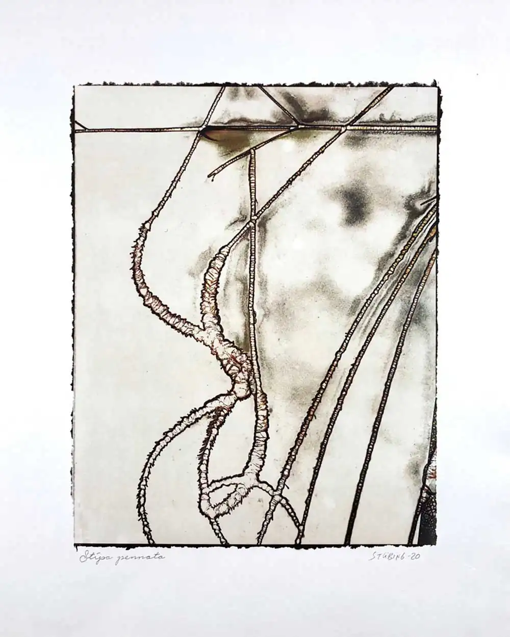 The degradative process (mordancage) to which the negatives are damaged reveals structures that recall the behavior of the soil and plants when subjected to the effects of excessive drought and heat, both main consequences of the desertification originated by the climatic change. I start from macro photographs made with an old Polaroid CU-5 “hand” loaded with 4×5 B&W film (Ilford Delta 100 or Fomapan 100). The negatives are treated with an adapted (softer as for gelatin silver prints) mordancage formula. The resulting altered and partiallly destroyed negative is scanned and used as base for the final print. On one side I print a xerography on a transparency from the CMY channels, and after this I transfer it on paper using solvent and an etching press. With the K channel a contact negative is printed on a transparency and is contact printed overlayed using the argyrotype technique.