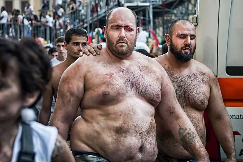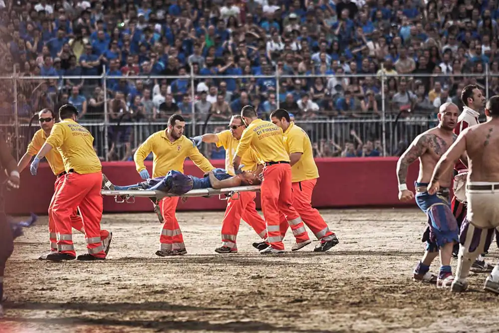 Four teams take part in the Florentine Calcio Storico, each representing a different neighborhoods of the city: Santa Maria Novella (red), Santa Croce (blue), Santo Spirito (white), and San Giovanni (green). Semi-finals take place early in June and the finals are held on June 24th, the feast day of Florence’s patron saint, John the Baptist.The winning team used to take home a butchered calf. There’s no official prizegiving or medal ceremony. The players play for glory.
