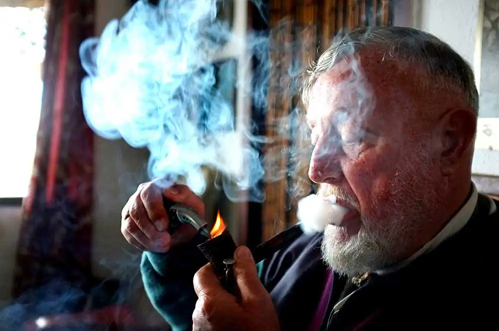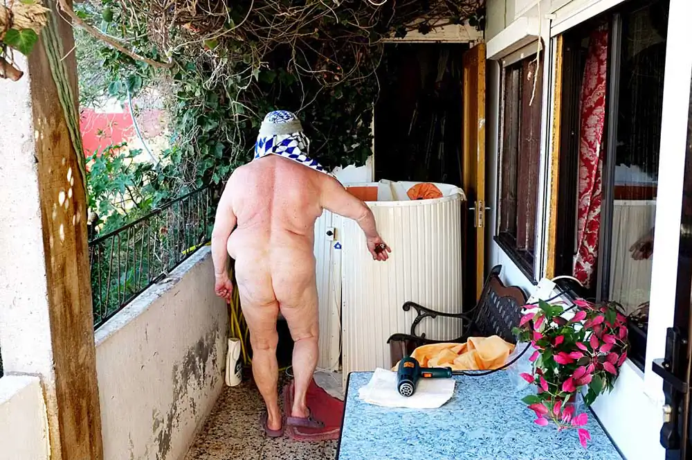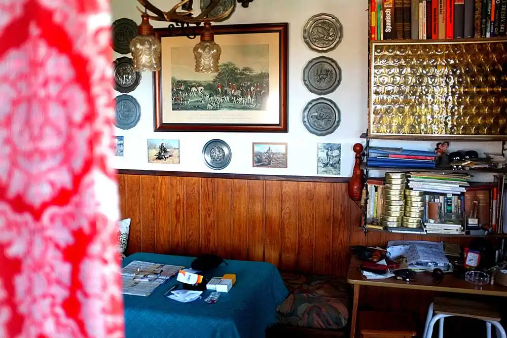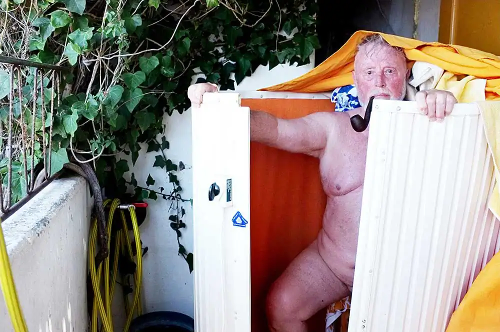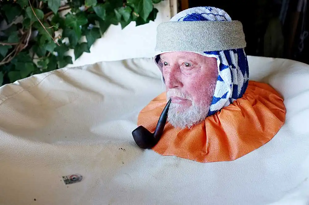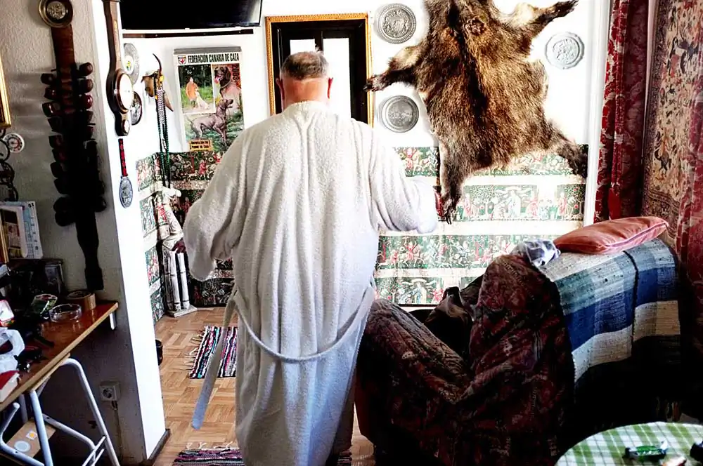 Little burn holes, caused by one of his about 120 pipes decorate his dressing gown. We stare together at the swell of the waves and listen to music of the 50s – old sailor songs. The windows are closed. Flint can’t bear draughts, and so the room gradually fills with his pipe smoke. He offers me a lukewarm beer. “You know?” he says and begins telling me about his past. His training in the German Democratic Republic as a preparator of corpses for medical students and his escape to the West in 1958, his unsuccessful first jobs until he finally found employment with the distinguished medical faculty of Tübingen University. He tells me of his love for one of his dogs who died a year ago. “He was my best friend” he murmurs with tears in his eyes. “All our lives we have had dogs. Always Weimaraner. They were our constant companions”. Flint loves hunting by stalking, thinks however, that he has now finished with all that. On the one hand he feels too old for it with his nearly 78 years of age and on the other hand he thinks the animals also have a right to life. During his weekly walks along the promenade with his wife and their little dog he is always dressed the same: a colonial style khaki drill outfit that reminds me of films about Africa and a practical transportable stool. Accessories include a matching hat and sunglasses.