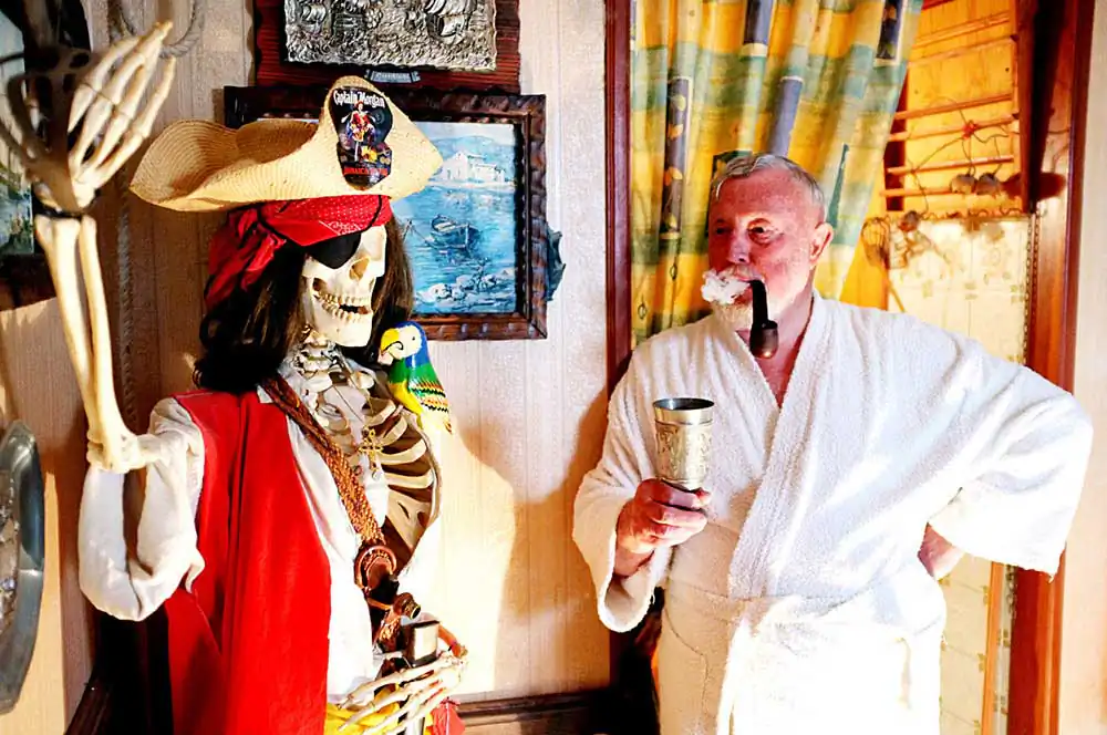 Around me furnishings in the style of “Rustic German” dating from the 1970s. Hunting trophies, a skeleton, a treasure chest, swords and books. I am not alone. With me is Captain Flint.