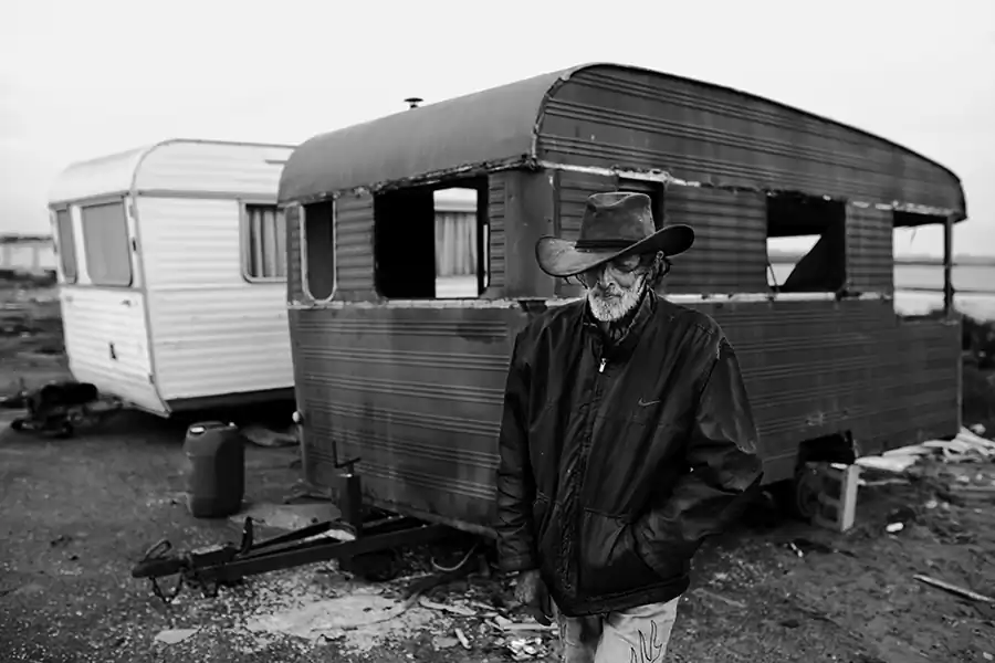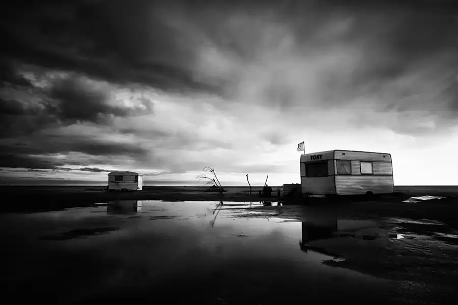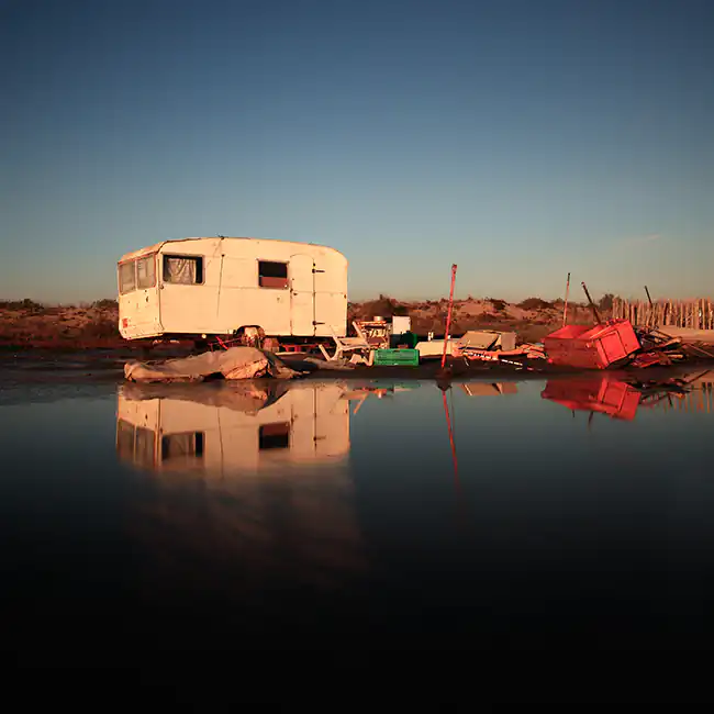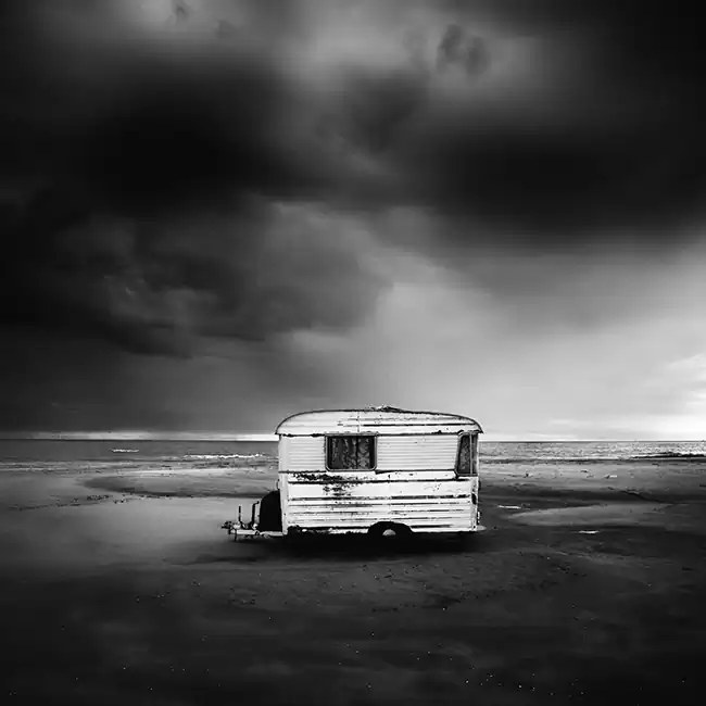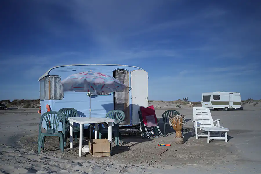 Season after season I walked the beach to devote a series of photographs. Because this place is unique : it is allowed to put his caravan there for five months of the year, from May to October. Past the frenzy of the summer, only the fiercest persist until the last minute, their isolated caravans in the middle of the huge beach, delivered to the elements. The early fall is the time I like to take pictures on the beach. The atmosphere is completely different because the blue sky sometimes gives way to a sky with clouds threatening. In addition, only the bravest remain with their caravan on the beach. There is very little photographer and can easily become acquainted with the people who eventually get to know you.