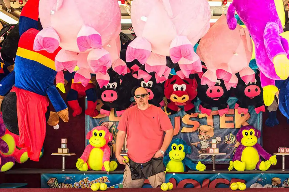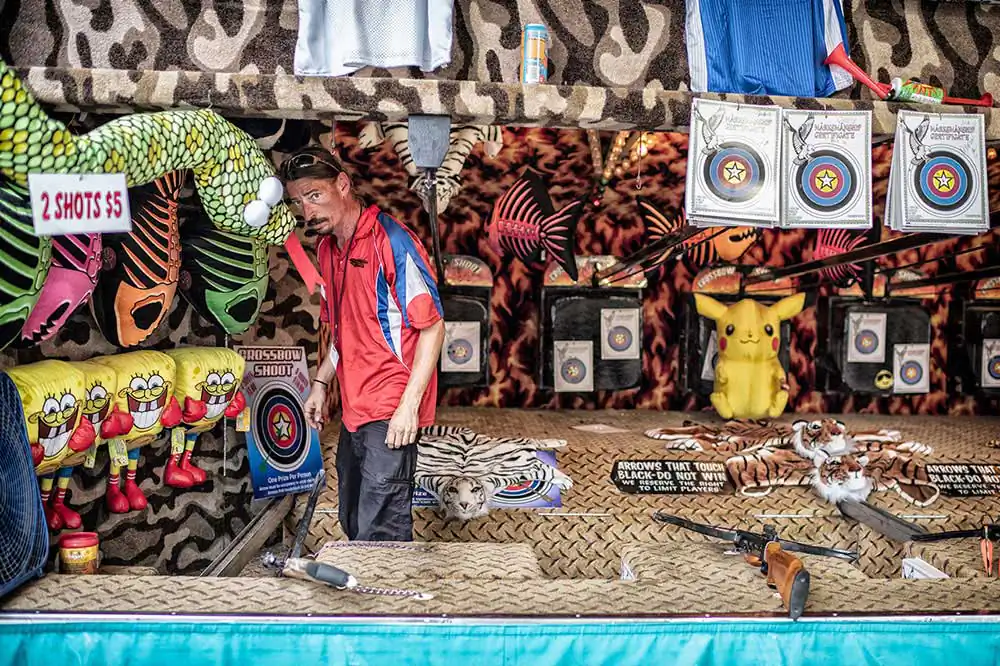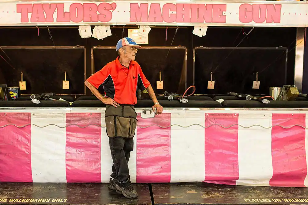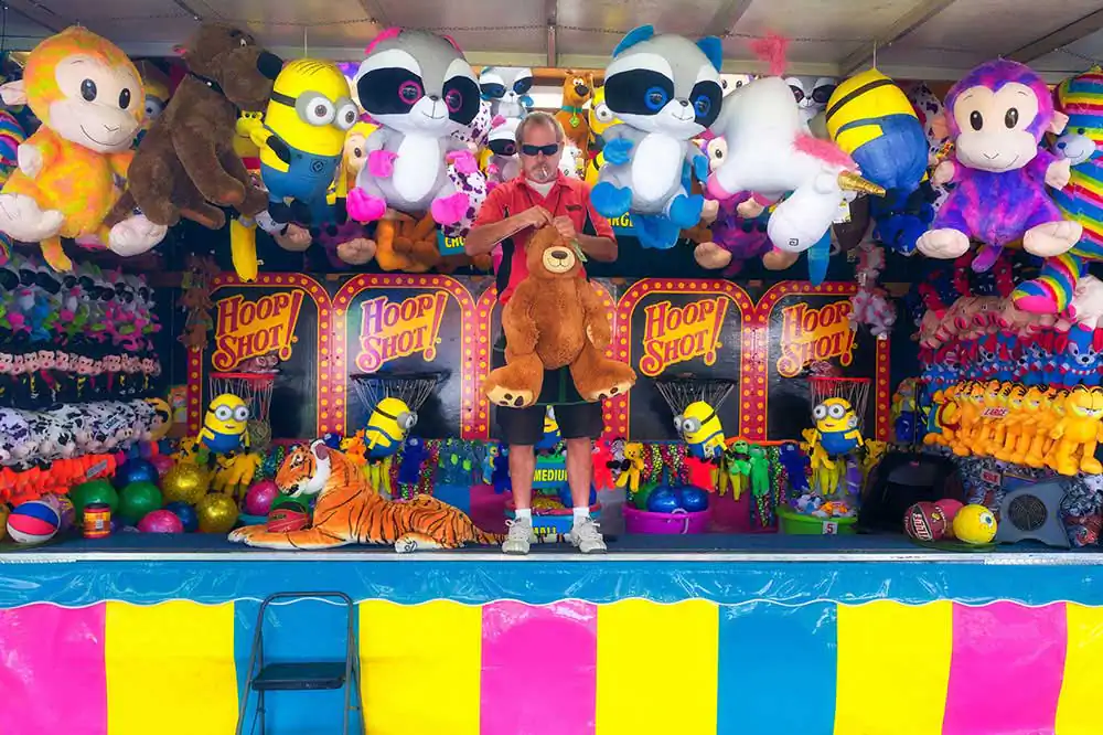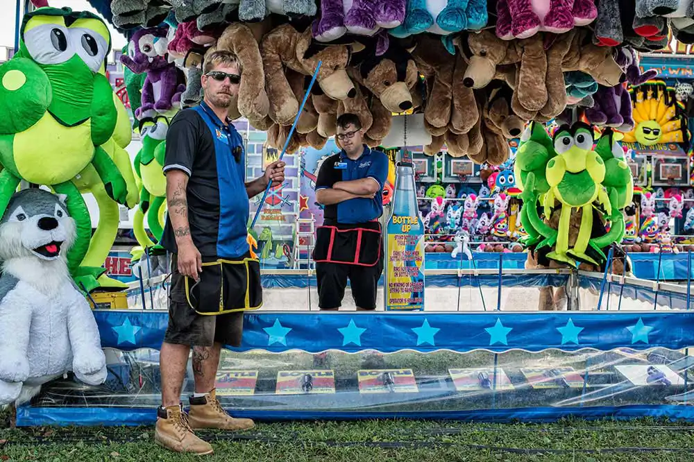 I am drawn to the extraordinary care and pride they take in their trade: the artful, extravagant design of their booths, their endless patter and rich jargon, how they camouflage themselves to vanish into a background of oversized and overstuffed prizes, how they cooperate subtly amongst themselves totarget their “marks” or customers. Many of them have been working these fairs for forty or fifty years; a grueling summer and fall schedule of state and county fairs that takes them the length and breadth of country. If you catch them in the early morning as they are setting up their joints, they are a warm and garrulous lot, generous with their stories, and overflowing with colorful language and opinions. These carneys represent a facet of America that endures in every state and almost every county in the country. It is untouched by fashion, politics, and technology and remains pure in its appeal to the simple lure of the game and the garish prize that “every child wins.”