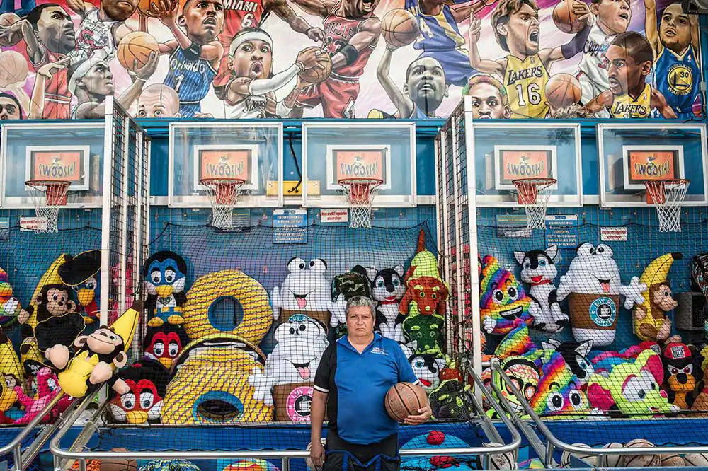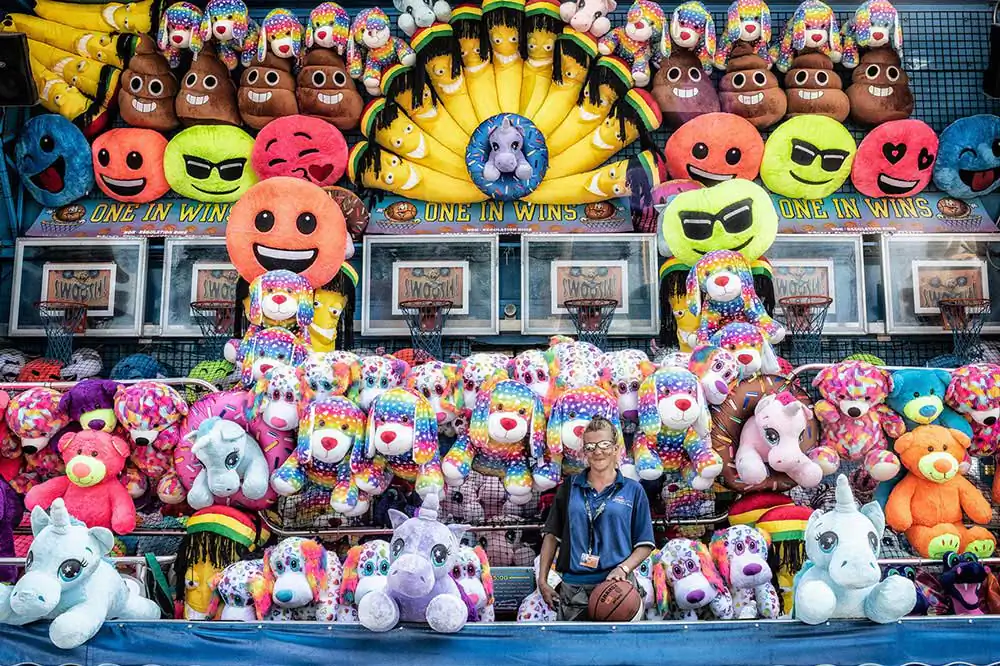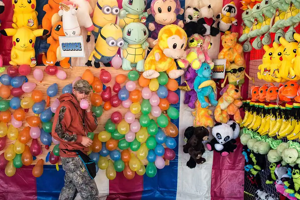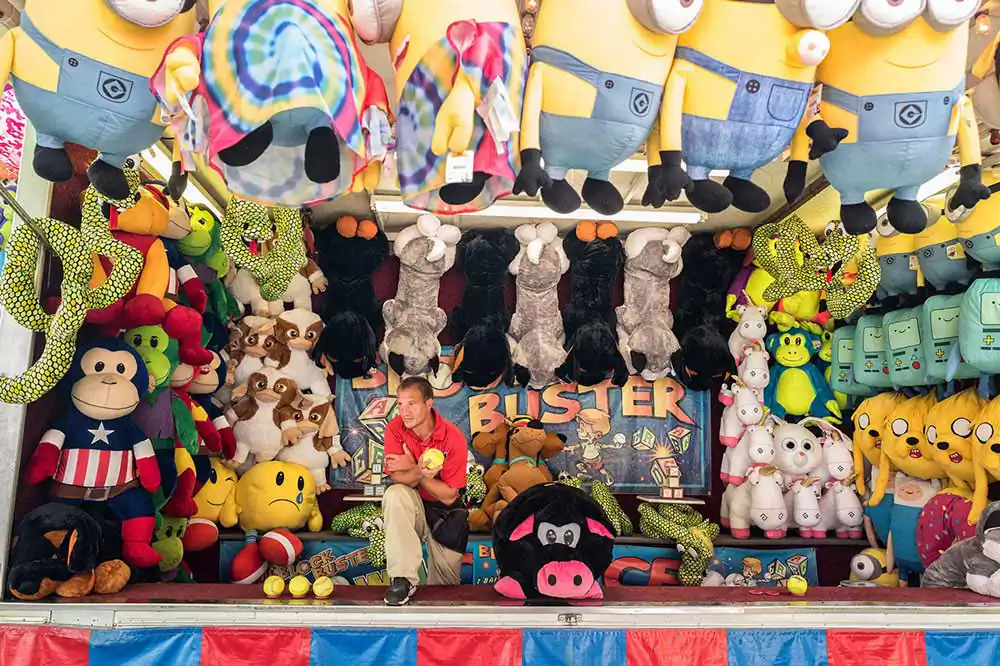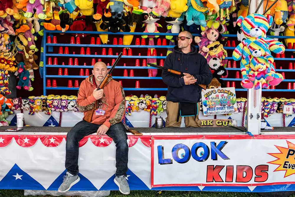 I am drawn to the extraordinary care and pride they take in their trade: the artful, extravagant design of their booths, their endless patter and rich jargon, how they camouflage themselves to vanish into a background of oversized and overstuffed prizes, how they cooperate subtly amongst themselves totarget their “marks” or customers. Many of them have been working these fairs for forty or fifty years; a grueling summer and fall schedule of state and county fairs that takes them the length and breadth of country. If you catch them in the early morning as they are setting up their joints, they are a warm and garrulous lot, generous with their stories, and overflowing with colorful language and opinions. These carneys represent a facet of America that endures in every state and almost every county in the country. It is untouched by fashion, politics, and technology and remains pure in its appeal to the simple lure of the game and the garish prize that “every child wins.”