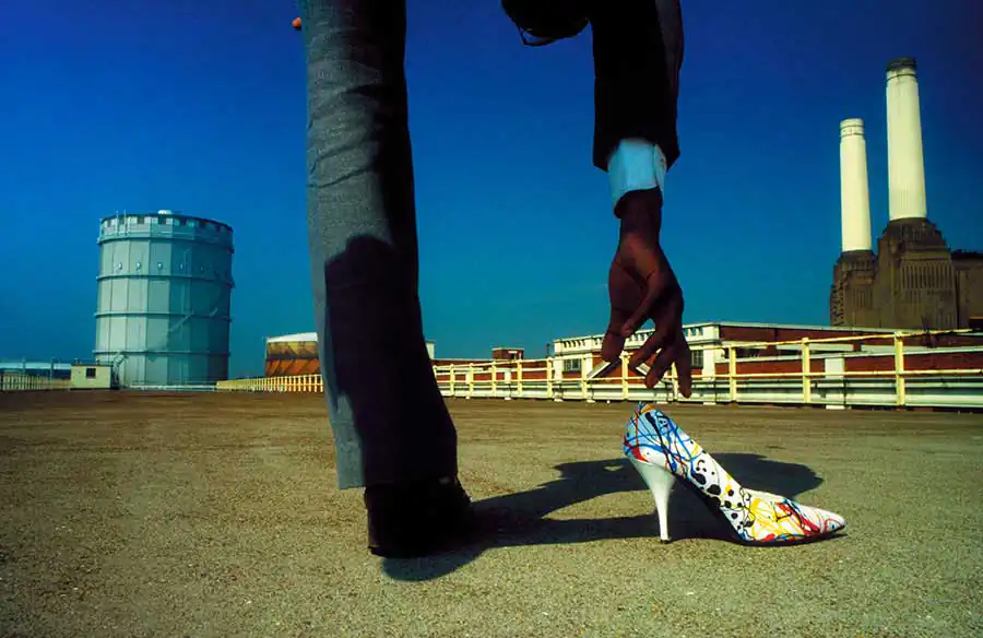 I started sketching out ideas and looking for locations and when I finally went out to take my first pictures it was these three people that were in my head. I thought of an idea of a man on one leg, bending over to pick up an object. I did not know what the object should be until I saw a Pollack patterned shoe in Fiorucci, whose clothes I began to borrow. Bourdin came to my mind and I decided this was the object I needed. I executed the picture on my first surrealist roll of film and it along with two other ideas on the same roll established my style straight away. The pictures kept coming and by the autumn I had 15-20 images for my first portfolio.