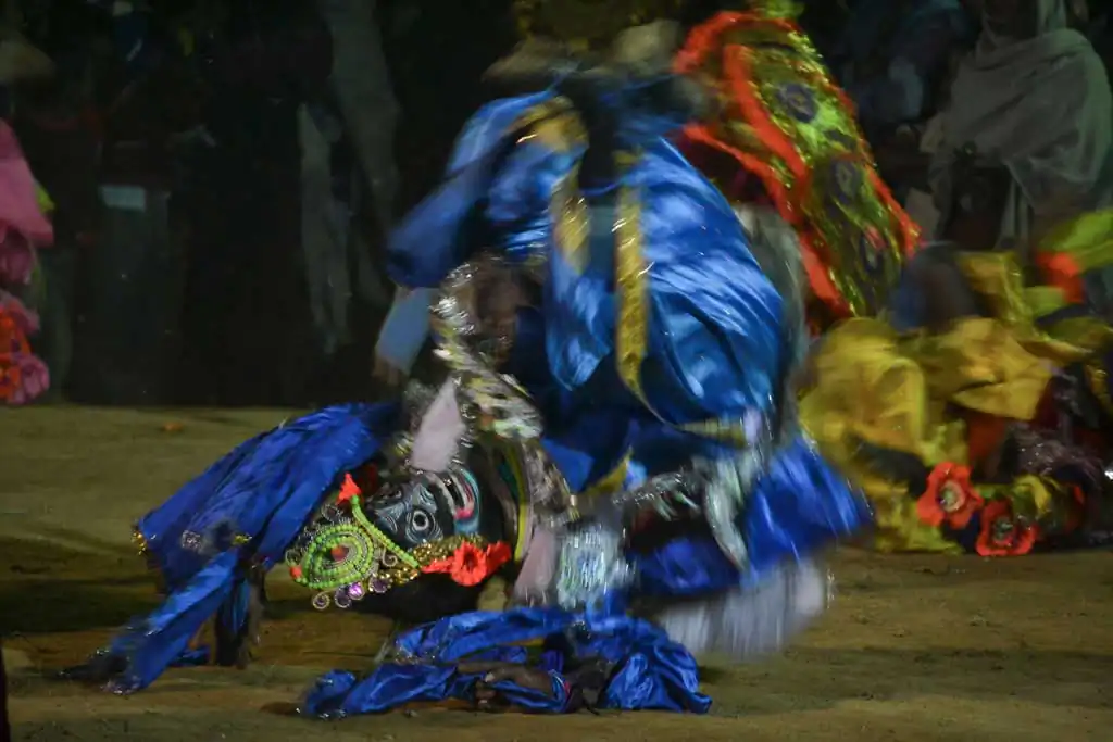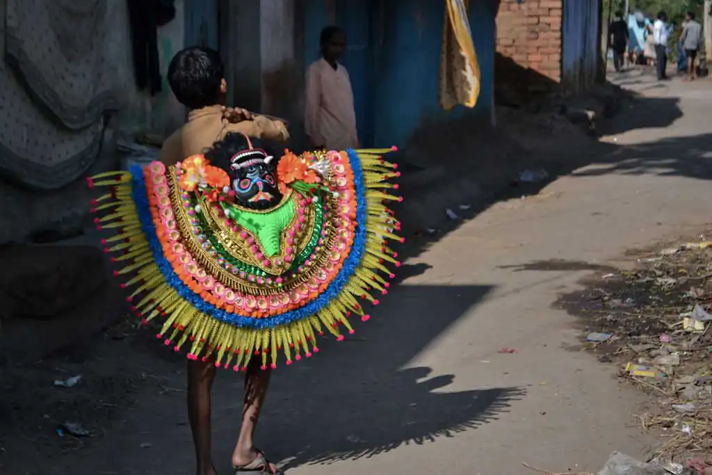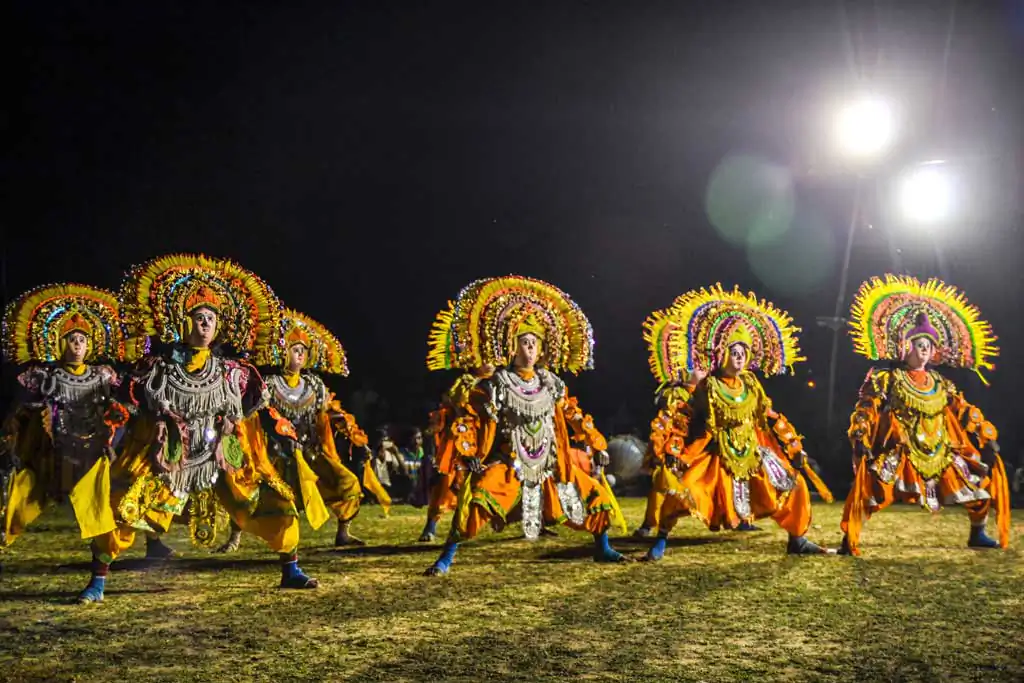 There are three recognized styles of Chau: Purulia Chau of West Bengal, Seraikella Chau of Jharkhand and Mayurbanj Chau of Orissa. It originated as a martial art which was developed by some of the rulers of the region who took interest in this. Since the inception of this form tribes like Bhumij, Mahato, Munda, Ho, Santhal, Oraon, Dom perform this dance. This is an integral part of the Gajan festival that falls in the Chaitra month of Hindu calendar. Chau dancers wear heavy masks of various mythological characters and also different animals.  These masks made by mask makers living in Charida village of Purulia,