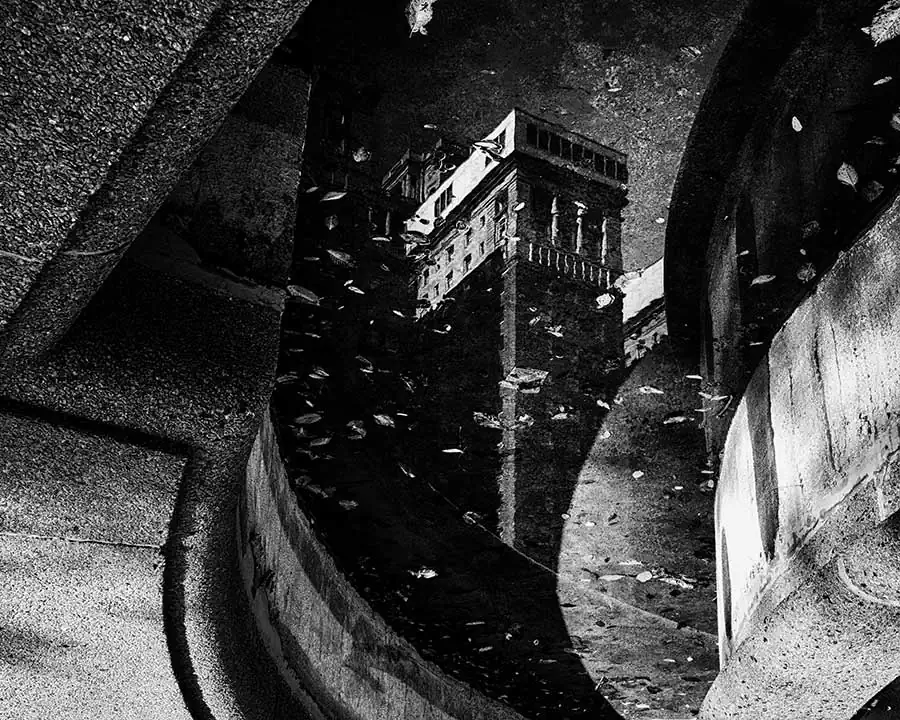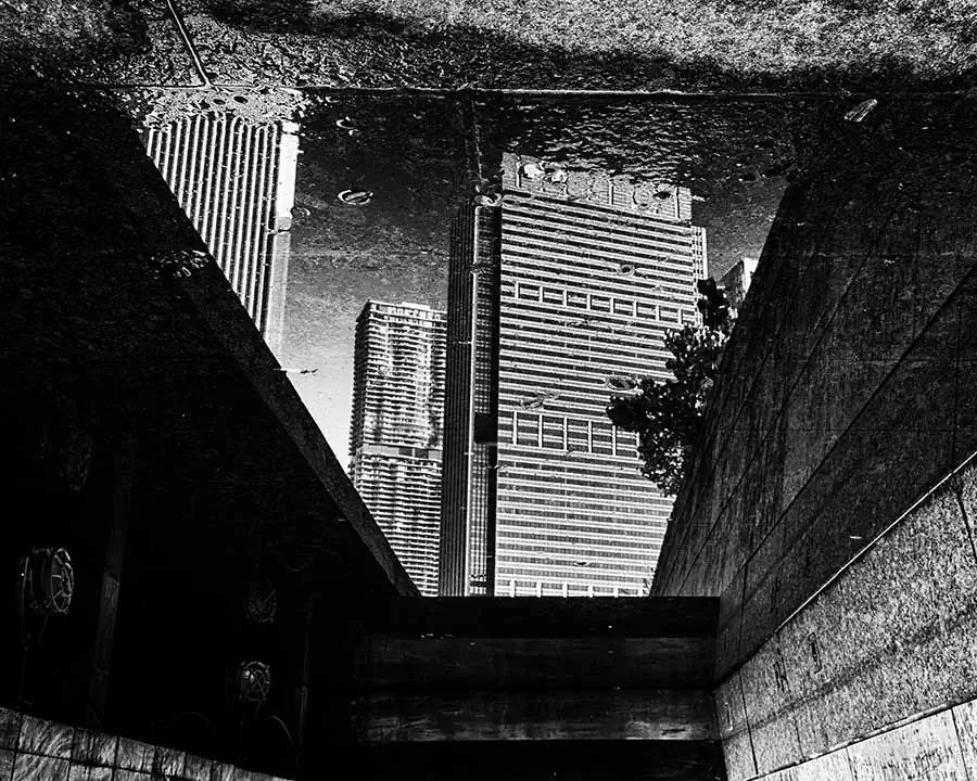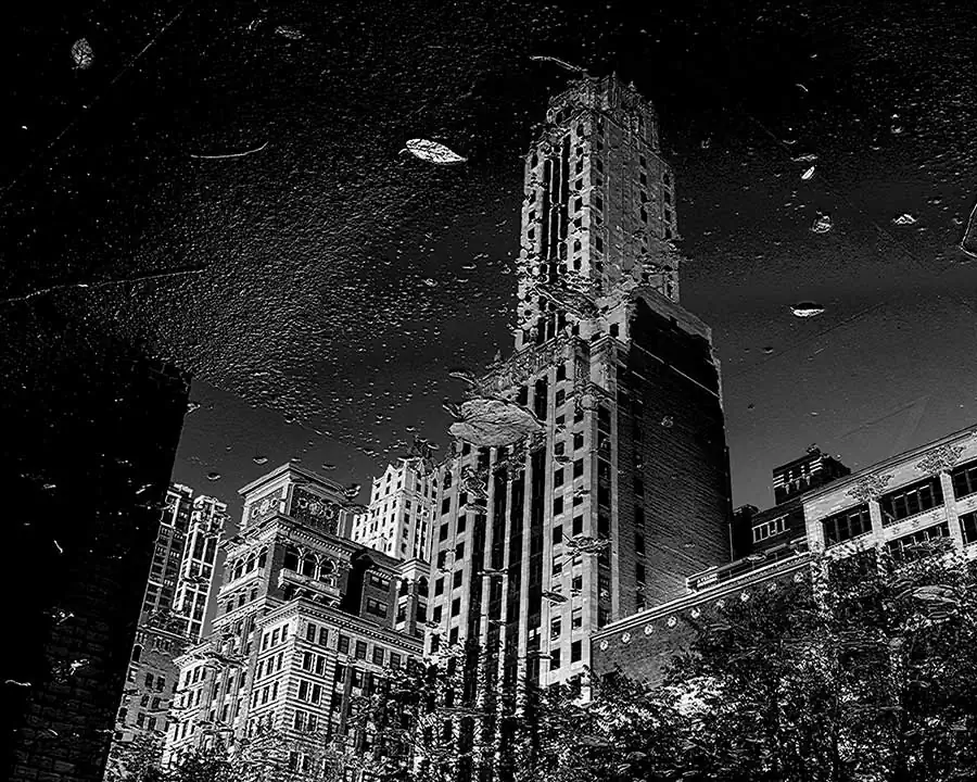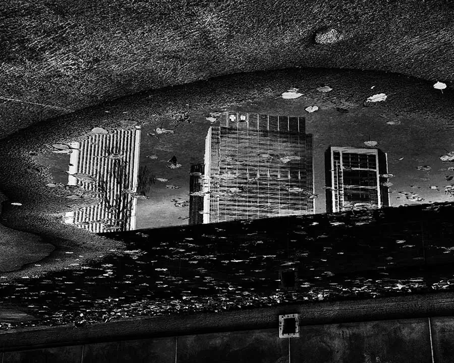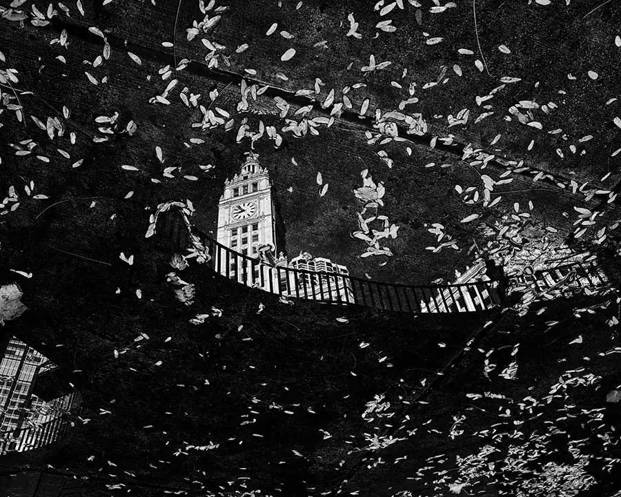 In early 2014 I began to photograph Chicago cityscapes reflected in various shiny surfaces. This led me to think of Lewis Carol’s famous book, and inspired me to reread his wonderful text. Alice’s through the looking glass world is a world of imagination that is filled with those naïve but deep insights that children sometimes have. I thought it would be great to photographically explore my local city, Chicago, using Lewis Carol’s trick of viewing the world through a looking glass. To do this, in Chicago through the Looking Glass, I show the city’s famous architecture reflected in various horizontal surfaces: full and empty pools, puddles, and fountains. The images are flipped vertically, transporting them into the looking glass world. This is a magical world in which down-to-earth things – the pavement, fallen leaves, items of litter – become objects of fantasy floating mysteriously in space. It is a place with a dark and gritty heaven made of pavement textures and tones. If there is a slight breeze, disturbed standing water distorts the reflected images in pools and puddles to produce dreamlike scenes. The looking glass world is a place that looks almost real, and yet is not quite right. It is something we don’t fully understand, which gets us thinking.