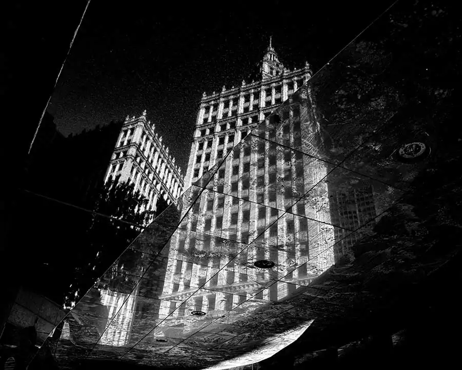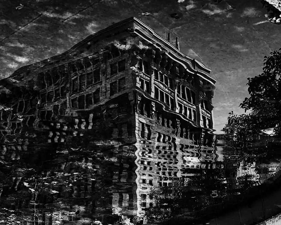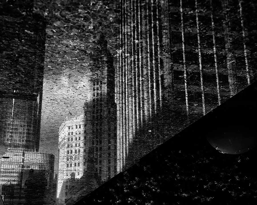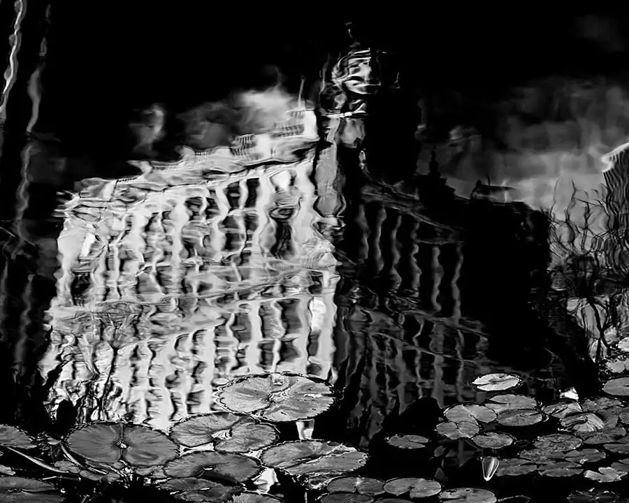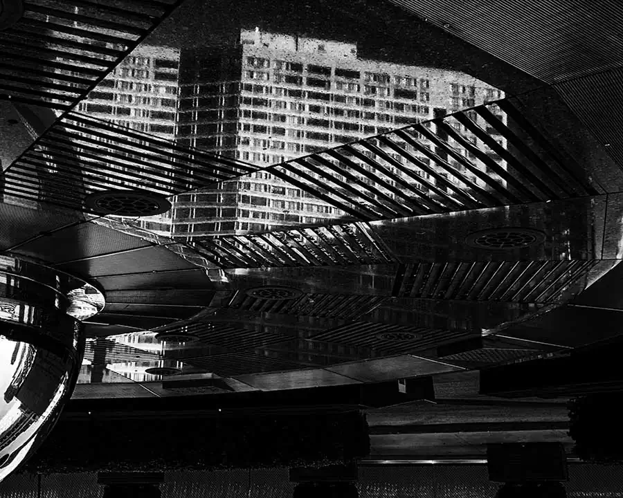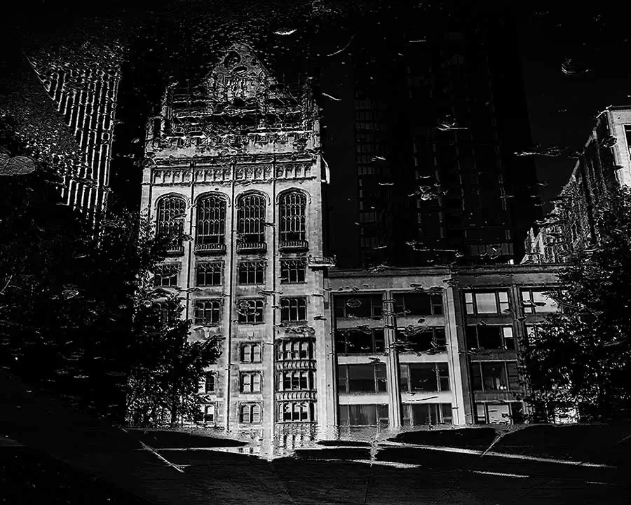 In early 2014 I began to photograph Chicago cityscapes reflected in various shiny surfaces. This led me to think of Lewis Carol’s famous book, and inspired me to reread his wonderful text. Alice’s through the looking glass world is a world of imagination that is filled with those naïve but deep insights that children sometimes have. I thought it would be great to photographically explore my local city, Chicago, using Lewis Carol’s trick of viewing the world through a looking glass. To do this, in Chicago through the Looking Glass, I show the city’s famous architecture reflected in various horizontal surfaces: full and empty pools, puddles, and fountains. The images are flipped vertically, transporting them into the looking glass world. This is a magical world in which down-to-earth things – the pavement, fallen leaves, items of litter – become objects of fantasy floating mysteriously in space. It is a place with a dark and gritty heaven made of pavement textures and tones. If there is a slight breeze, disturbed standing water distorts the reflected images in pools and puddles to produce dreamlike scenes. The looking glass world is a place that looks almost real, and yet is not quite right. It is something we don’t fully understand, which gets us thinking.