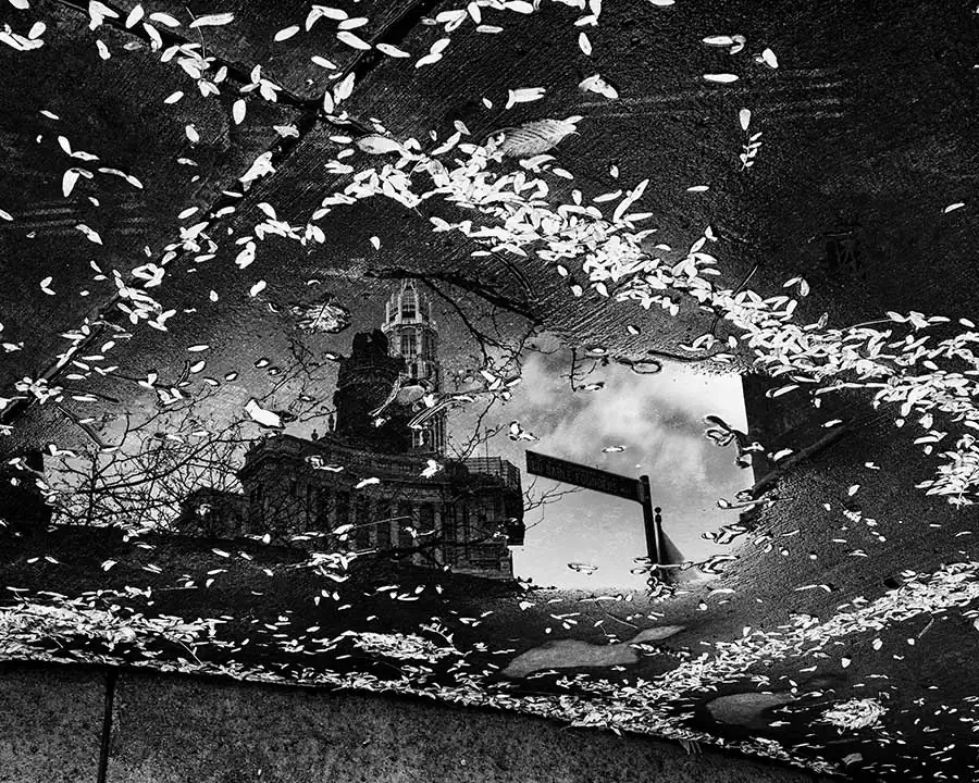 When you enter the looking glass world you cannot escape its logic. Left and right are, of course, swapped, as they are in any mirror. But there are other things that are also muddled. If we look down at a puddle, we perceive the sky in the ground and the ground in the sky. What we are actually seeing is both sky and ground simultaneously, both up and down superimposed. If we look harder, we will see in the looking glass world things that we might overlook in the real world, the urban ephemera – leaves and litter. Since they are floating, and not where they are meant to be, we notice them. The ephemera tell us that the looking glass world is not a sterile place. Within it there is life – plants and people. Strange though these flipped images may seem, apart from minor corrections, no other manipulations have been made in the digital darkroom. Nothing has been added or subtracted. These are documentary images taken within a single square mile of downtown Chicago. The looking glass world is presented as found. [Official website]