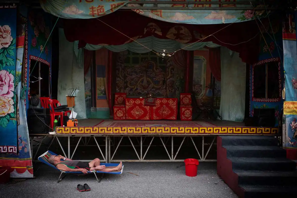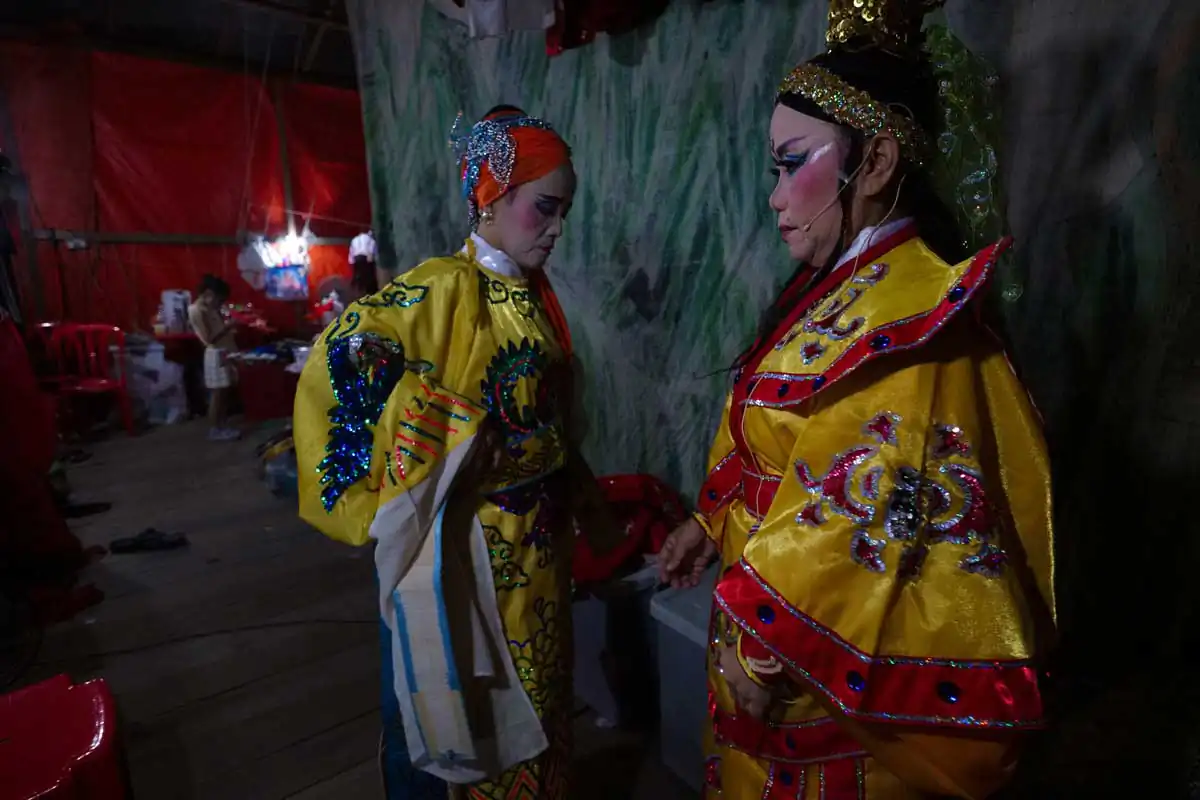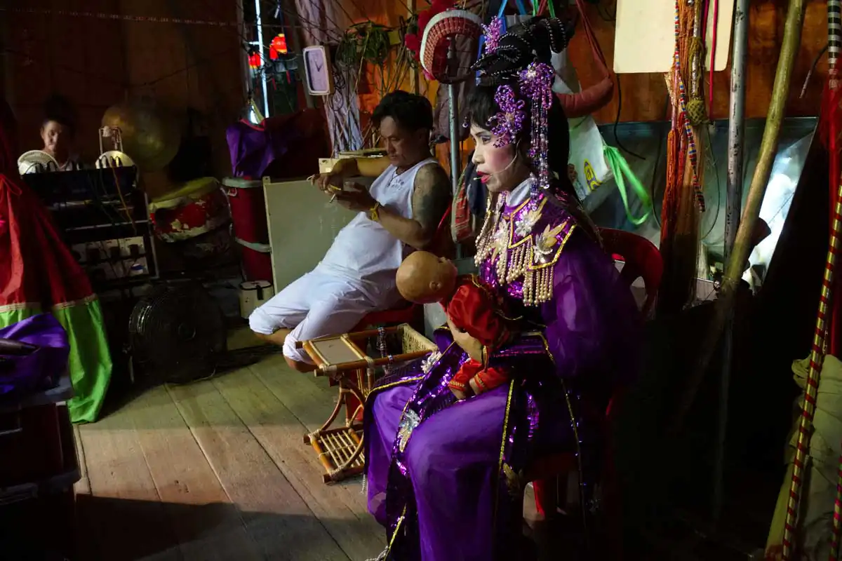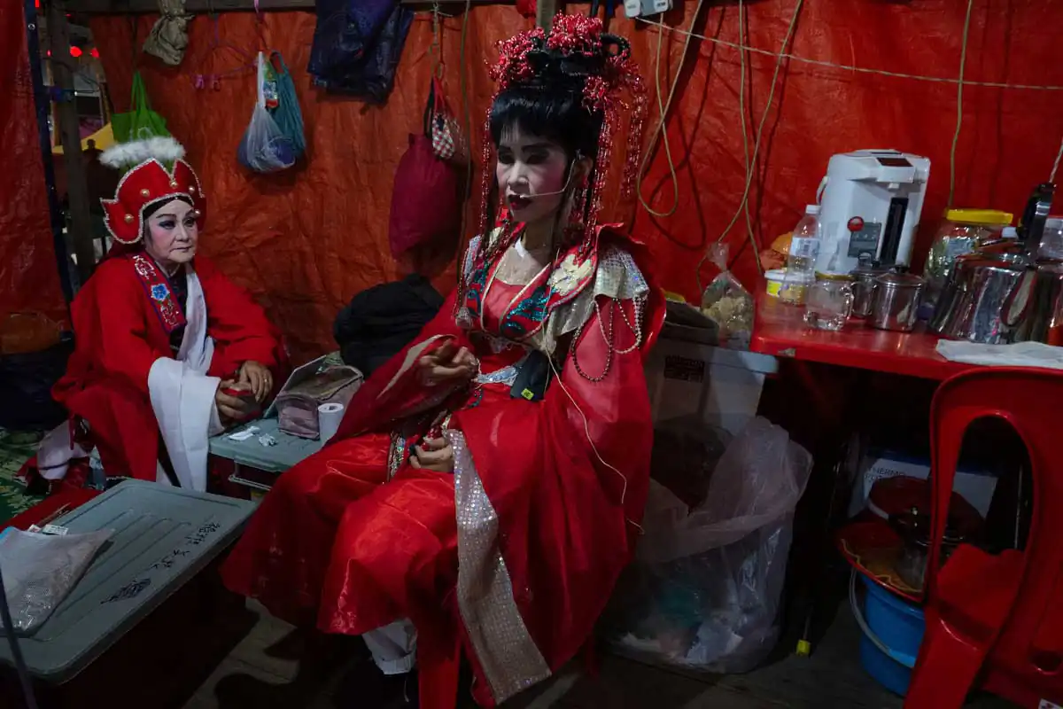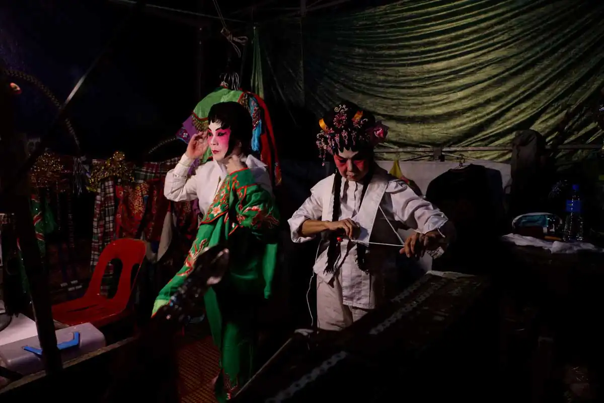 Before and during Chinese religious festivals such as the Hungry Ghosts festival and the Nine Emperor Gods festival, these opera troupes live in the back areas of the stages that are specially erected. Much of the funding comes from business people and/or from temples.I chose to feature photographs made in the backstages. For the most part, the performers willingly accepted my presence despite my getting in their way more than once. I didn’t use artificial lights, and only relied on ambient light to accurately show the backstages as they really are.
