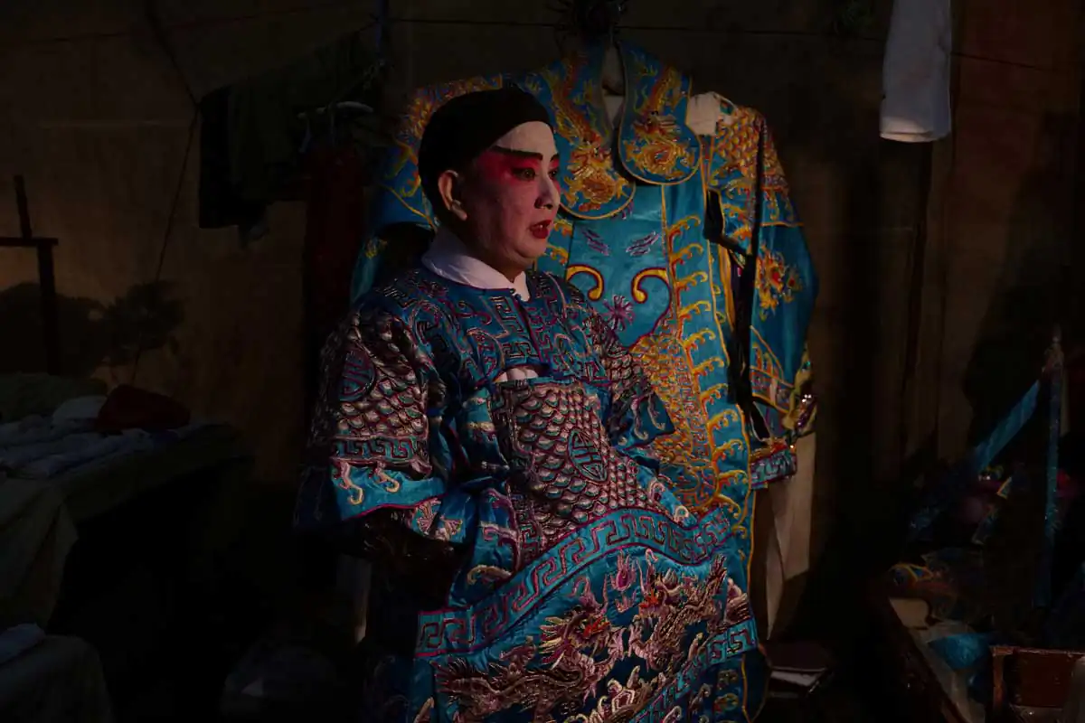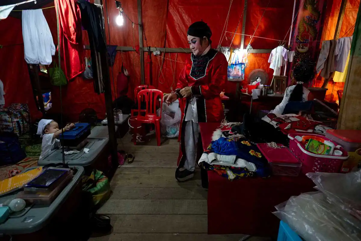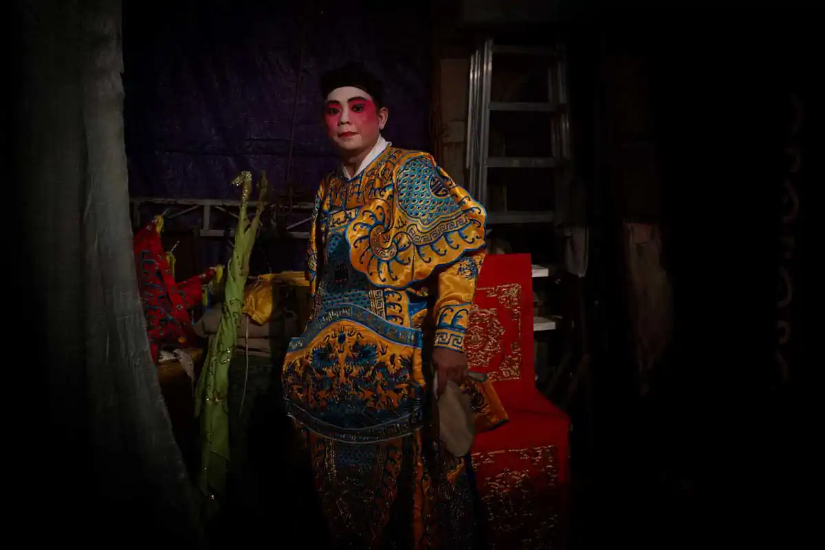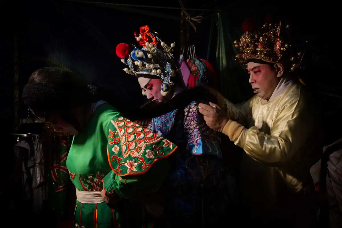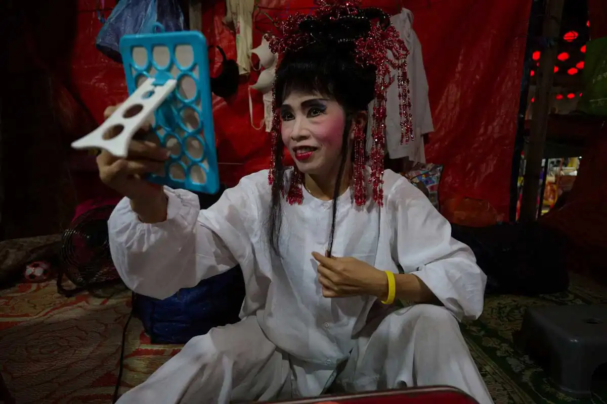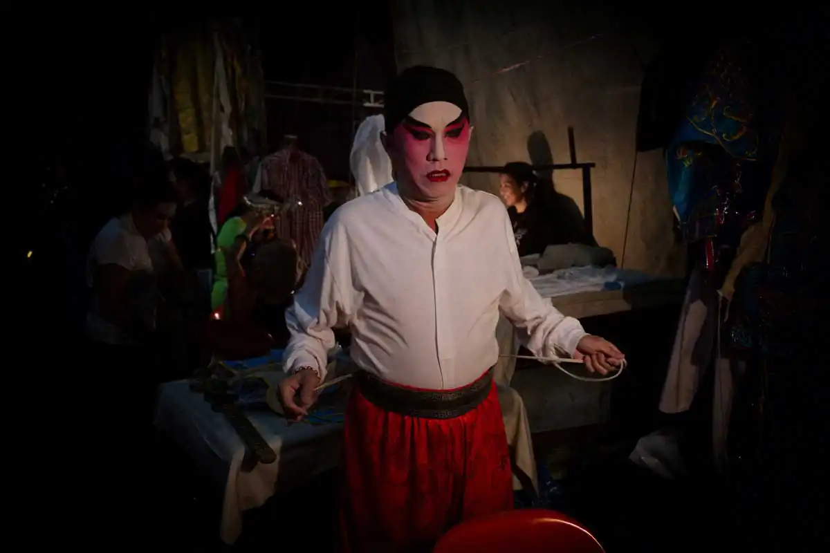 Before and during Chinese religious festivals such as the Hungry Ghosts festival and the Nine Emperor Gods festival, these opera troupes live in the back areas of the stages that are specially erected. Much of the funding comes from business people and/or from temples.I chose to feature photographs made in the backstages. For the most part, the performers willingly accepted my presence despite my getting in their way more than once. I didn’t use artificial lights, and only relied on ambient light to accurately show the backstages as they really are.