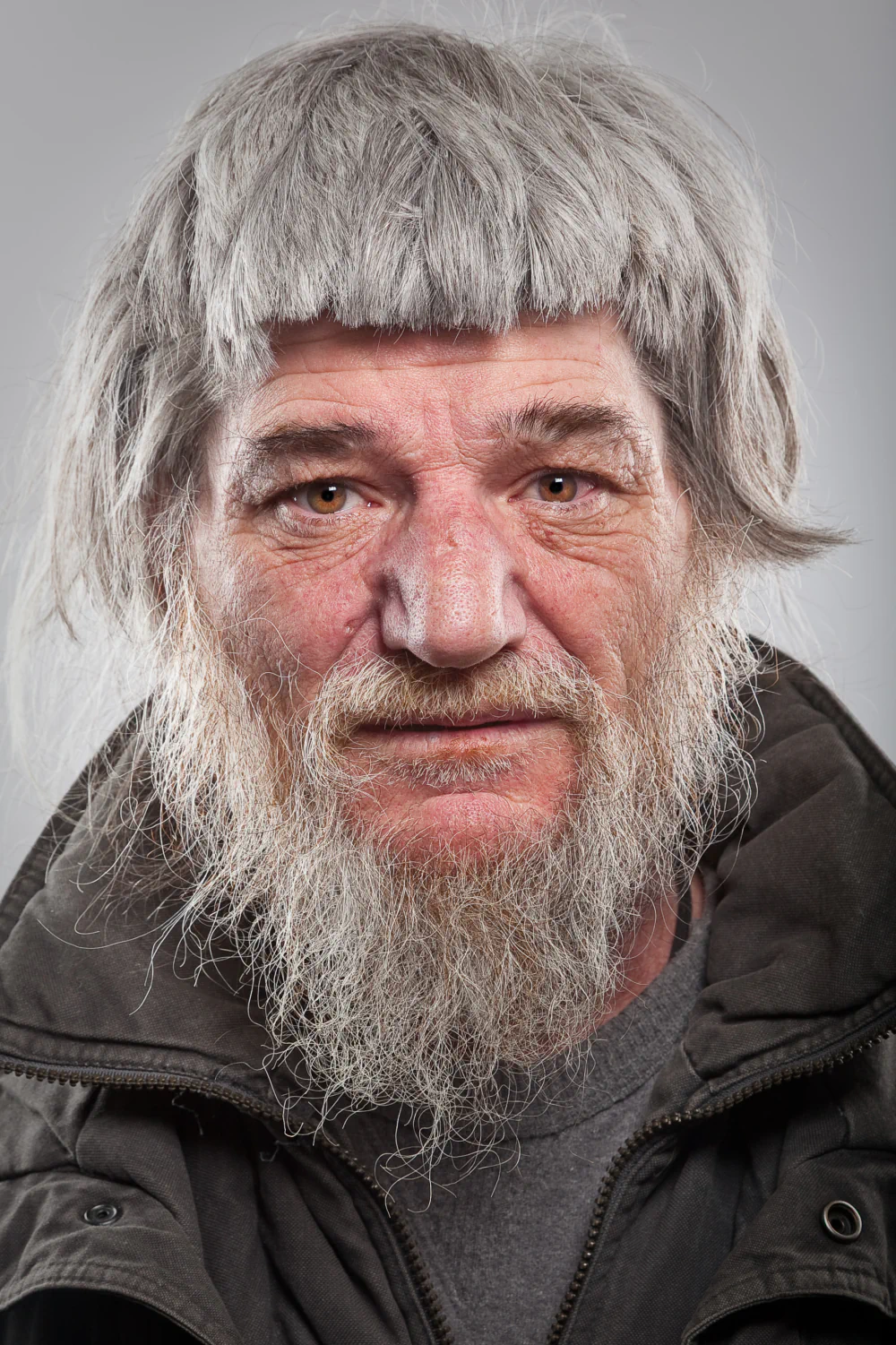 Mitzi suggested their local, gymnasium-sized community soup kitchen, Bean’s Cafe, where up to 300 people received a warm lunch and an opportunity to come in from the cold. He created a portable three-light studio and transported it to the site, where he began persistently encouraging people to pose. Most were very apprehensive, and he later reflected that he might have had better luck offering free root canals. At the end of the day, he had convinced only six people to participate.