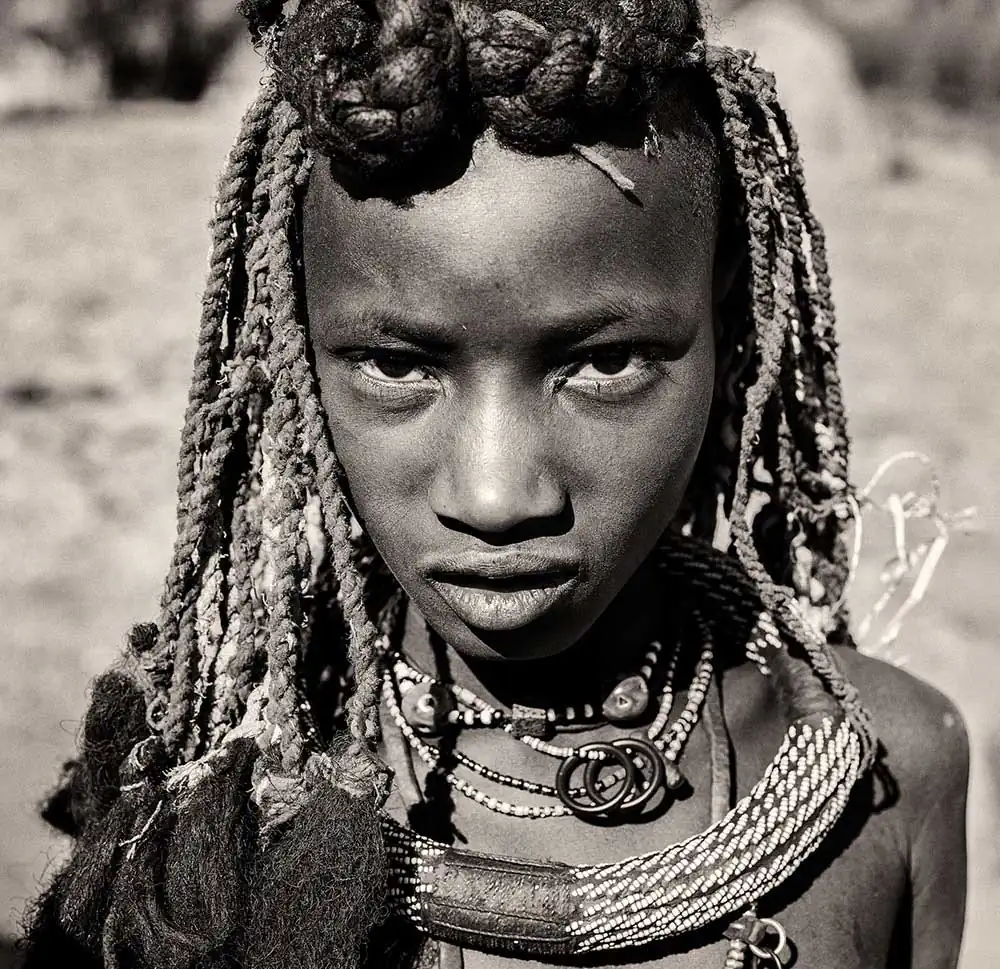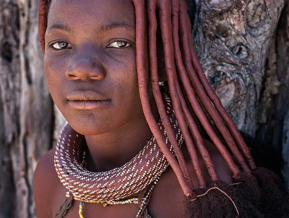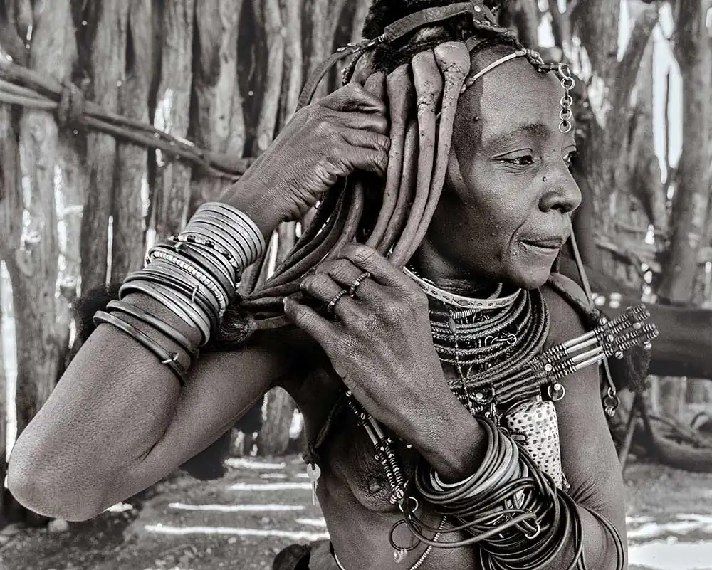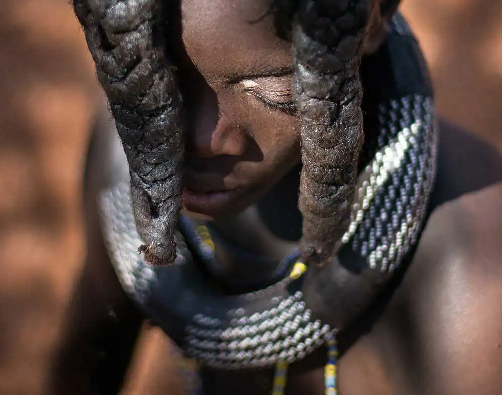 From the time a Himba girl is born, her hairstyle will identify her place in society, indicating age, clan and marital status of a woman. The hair is first lengthened with straw woven together with hair extensions to create dreadlocks, which are then covered in otjize and finished with goat hair, added to give the distinct pom-pom look.