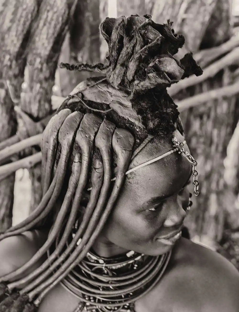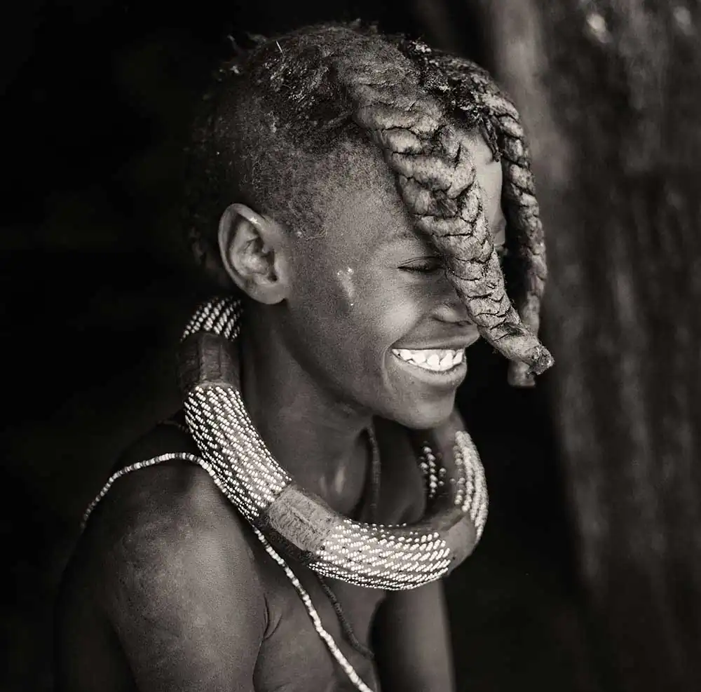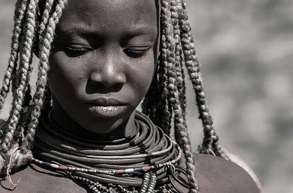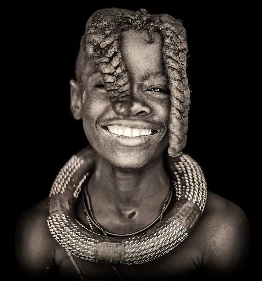 From the time a Himba girl is born, her hairstyle will identify her place in society, indicating age, clan and marital status of a woman. The hair is first lengthened with straw woven together with hair extensions to create dreadlocks, which are then covered in otjize and finished with goat hair, added to give the distinct pom-pom look.