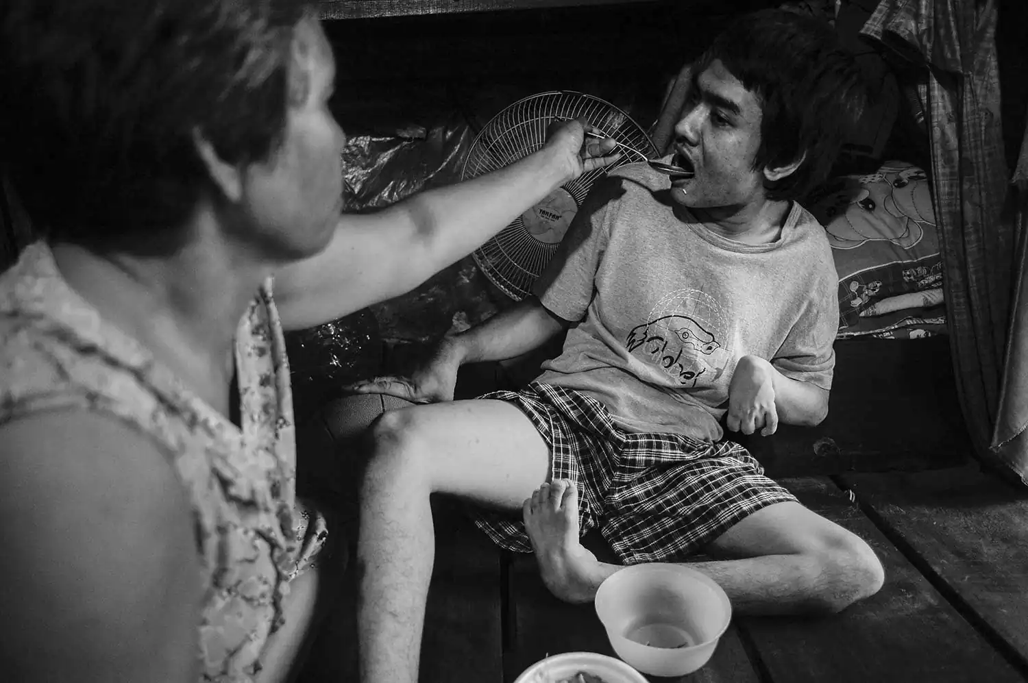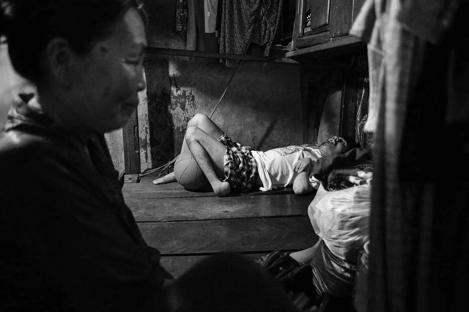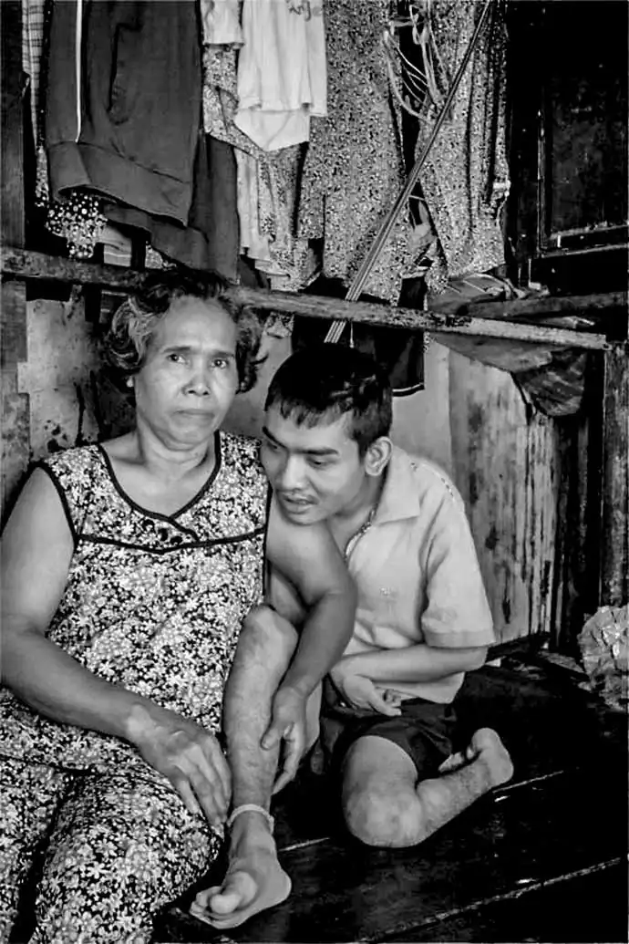 Brain damaged, both eyes blind, paralyzed, Dai is tied up to the bed while his mother is selling lottery tickets on the streets.