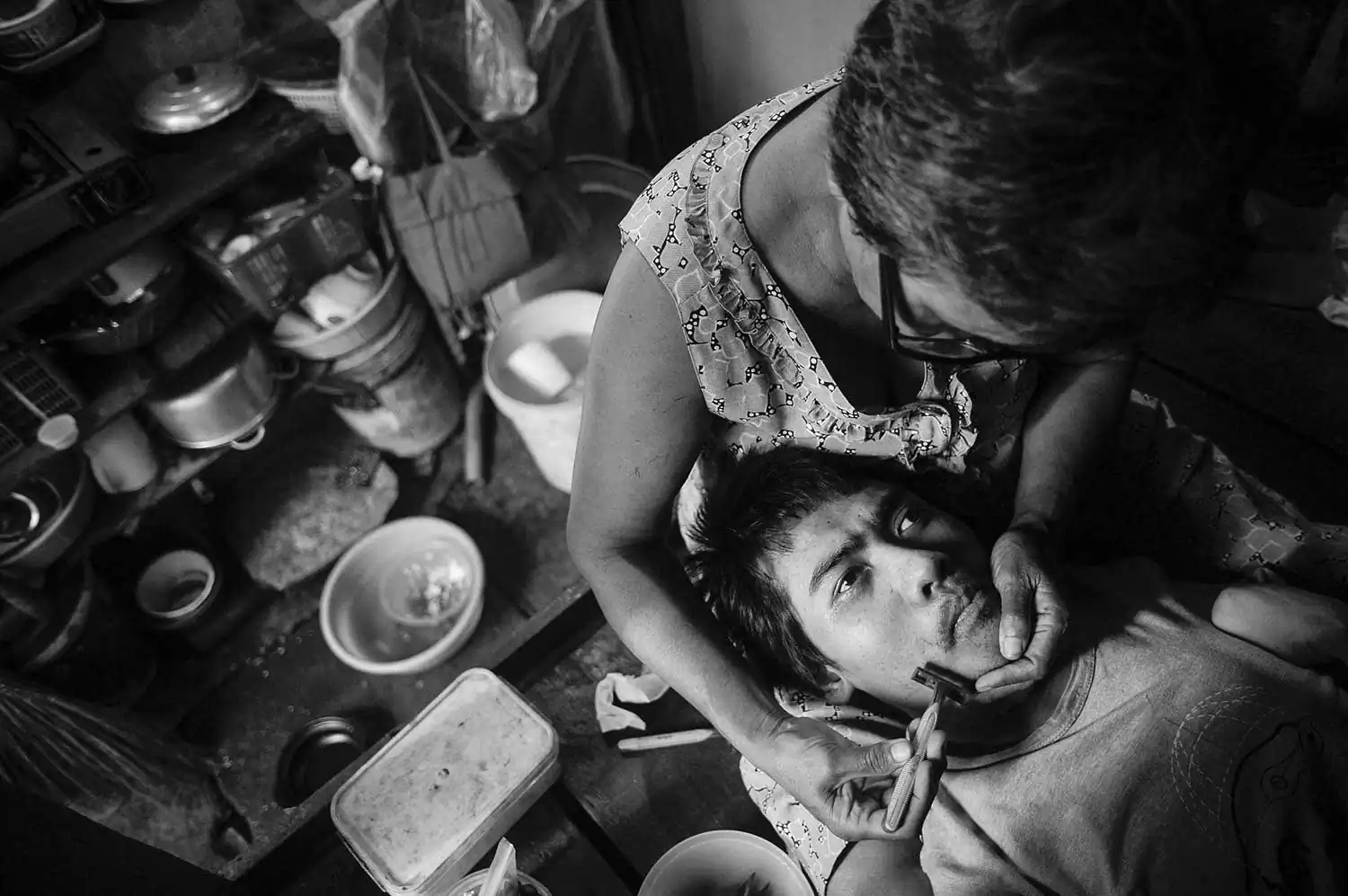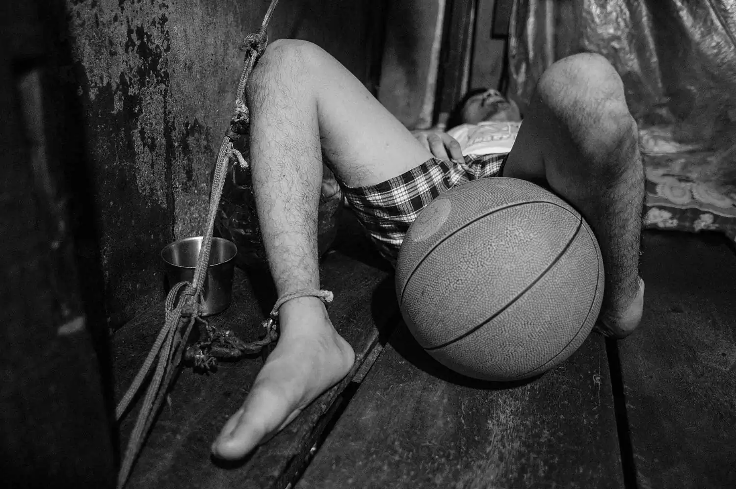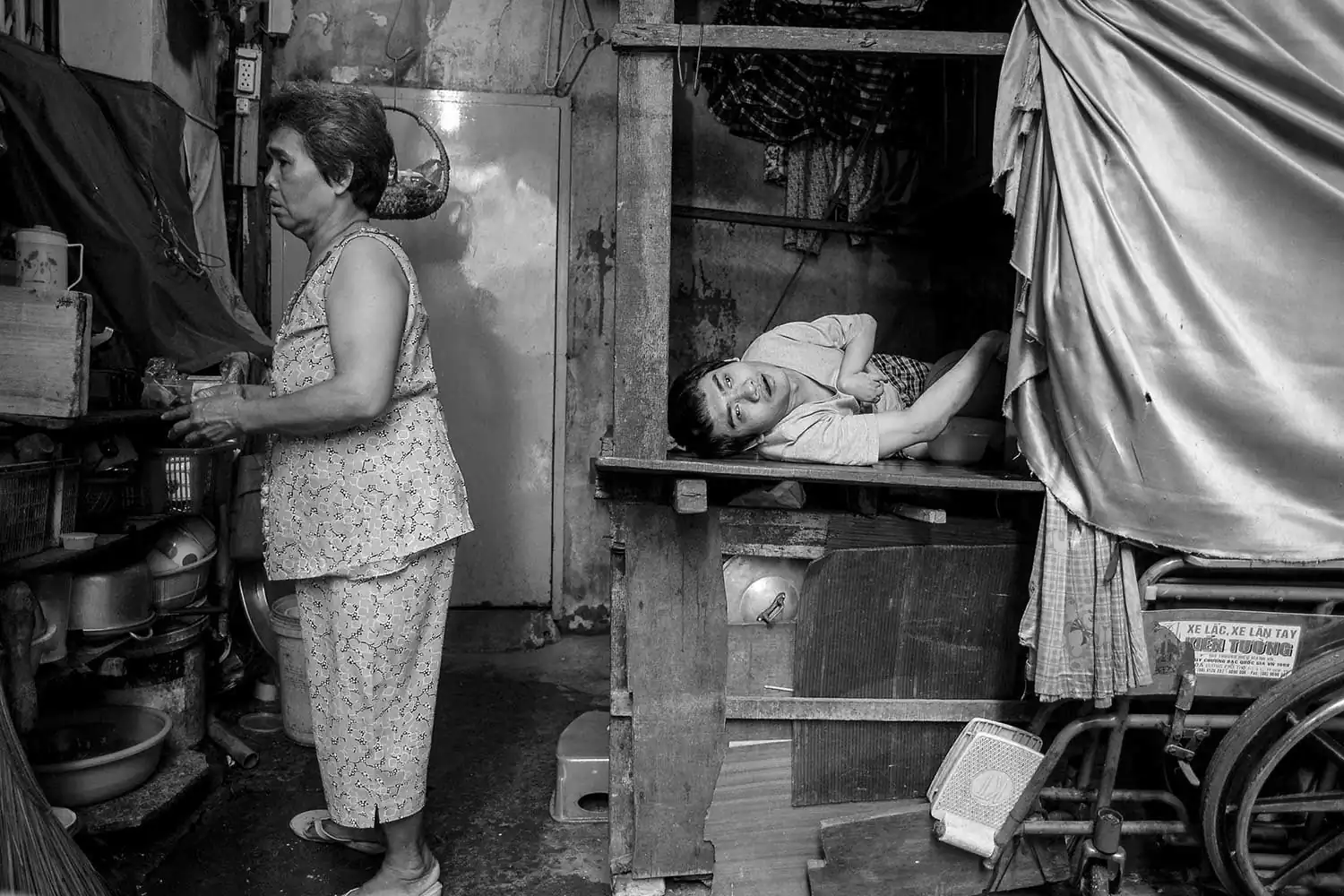 Brain damaged, both eyes blind, paralyzed, Dai is tied up to the bed while his mother is selling lottery tickets on the streets.