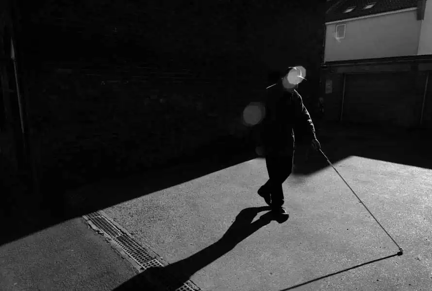 “When I was first blinded, in the hospital, I was begging them for a stick as I’d remembered this experience of being made to understand blindness, without a stick, when I was a child and when you have a stick, you can hold it out in front of you and tap away, feeling for obstructions in front and around you as you go.”