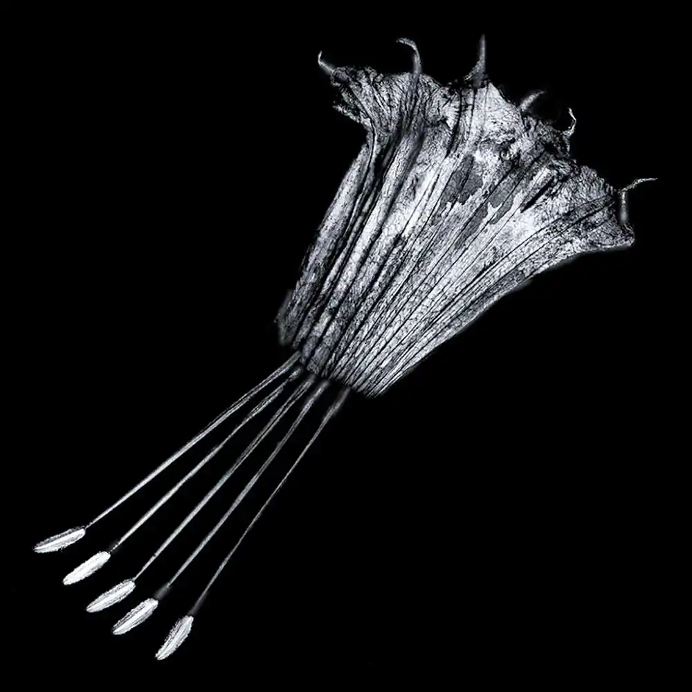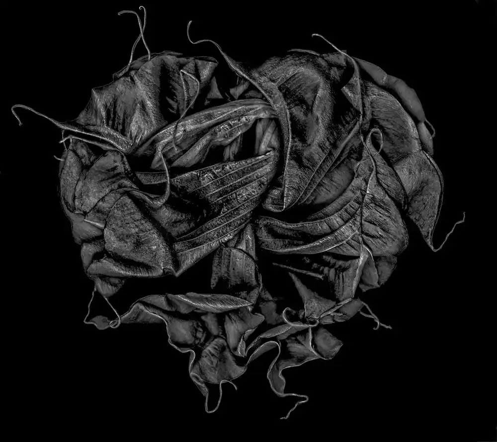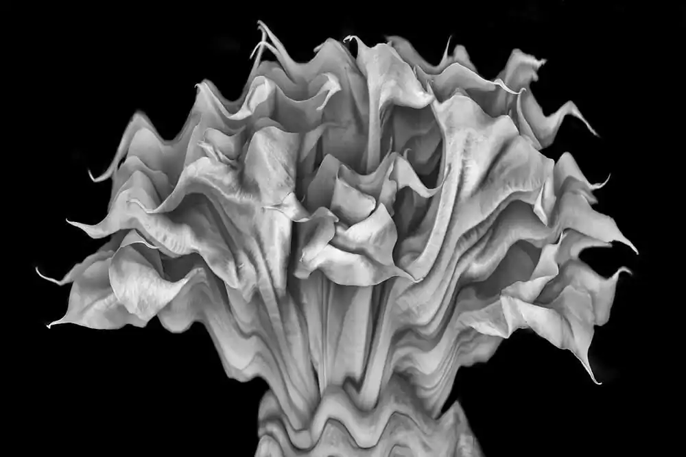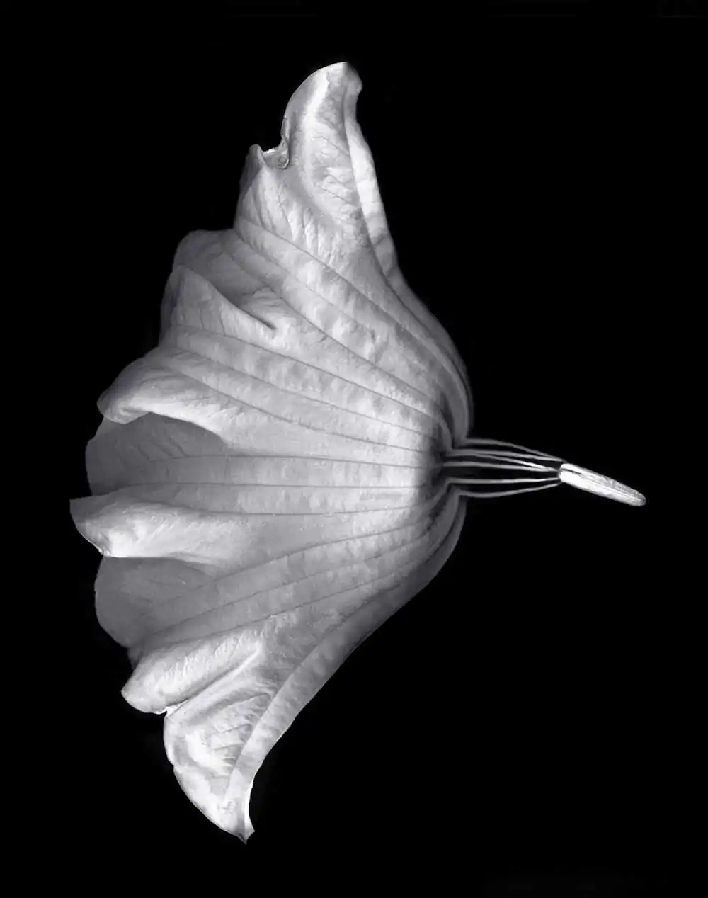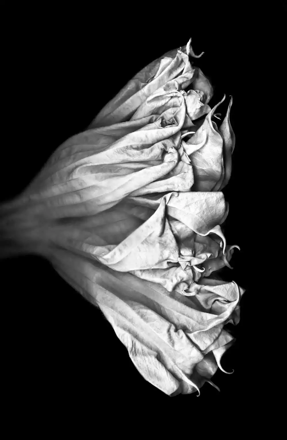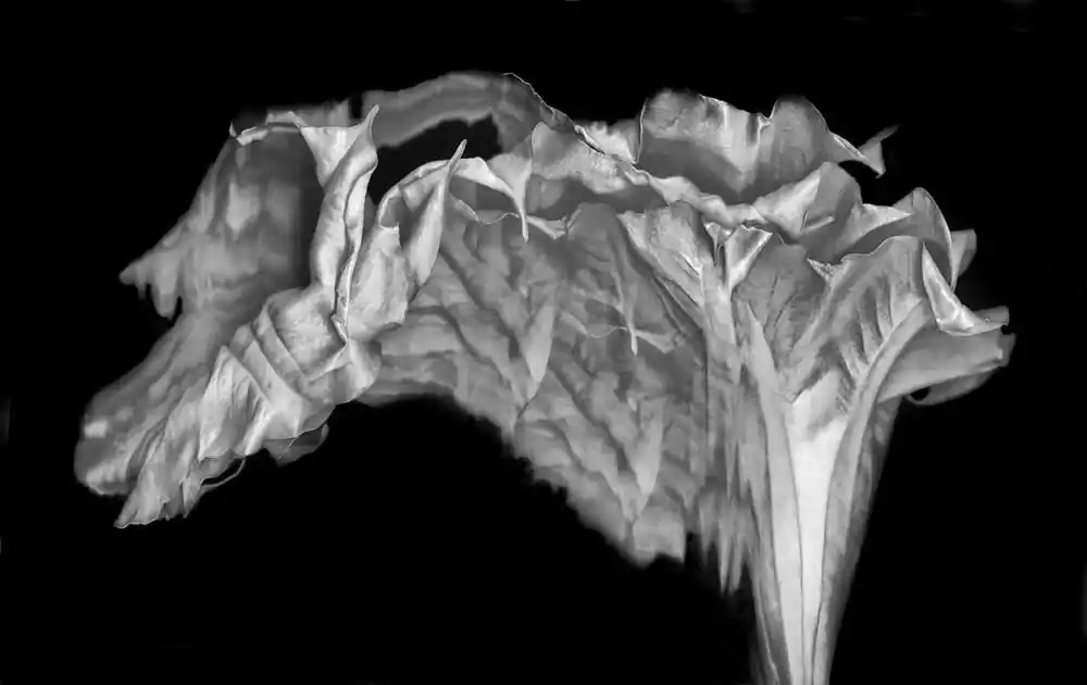My passion for close-up studio botanicals, particularly the common brugmansia, has everything to do with the capacity of its 3D form to morph into seemingly endless 2D variations.  The surfaces at various stages of aging can sometimes be teased into a glow, shine, or unique texture.  Surgical alterations are always fair play, as are radical movements on the large industrial scanner, desaturated lumen prints, and photograms.