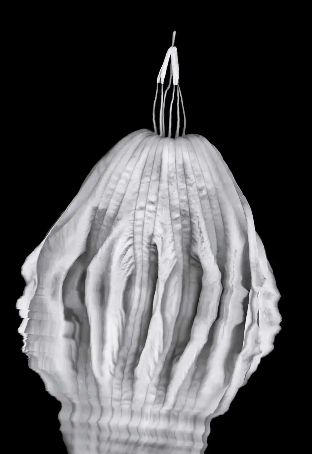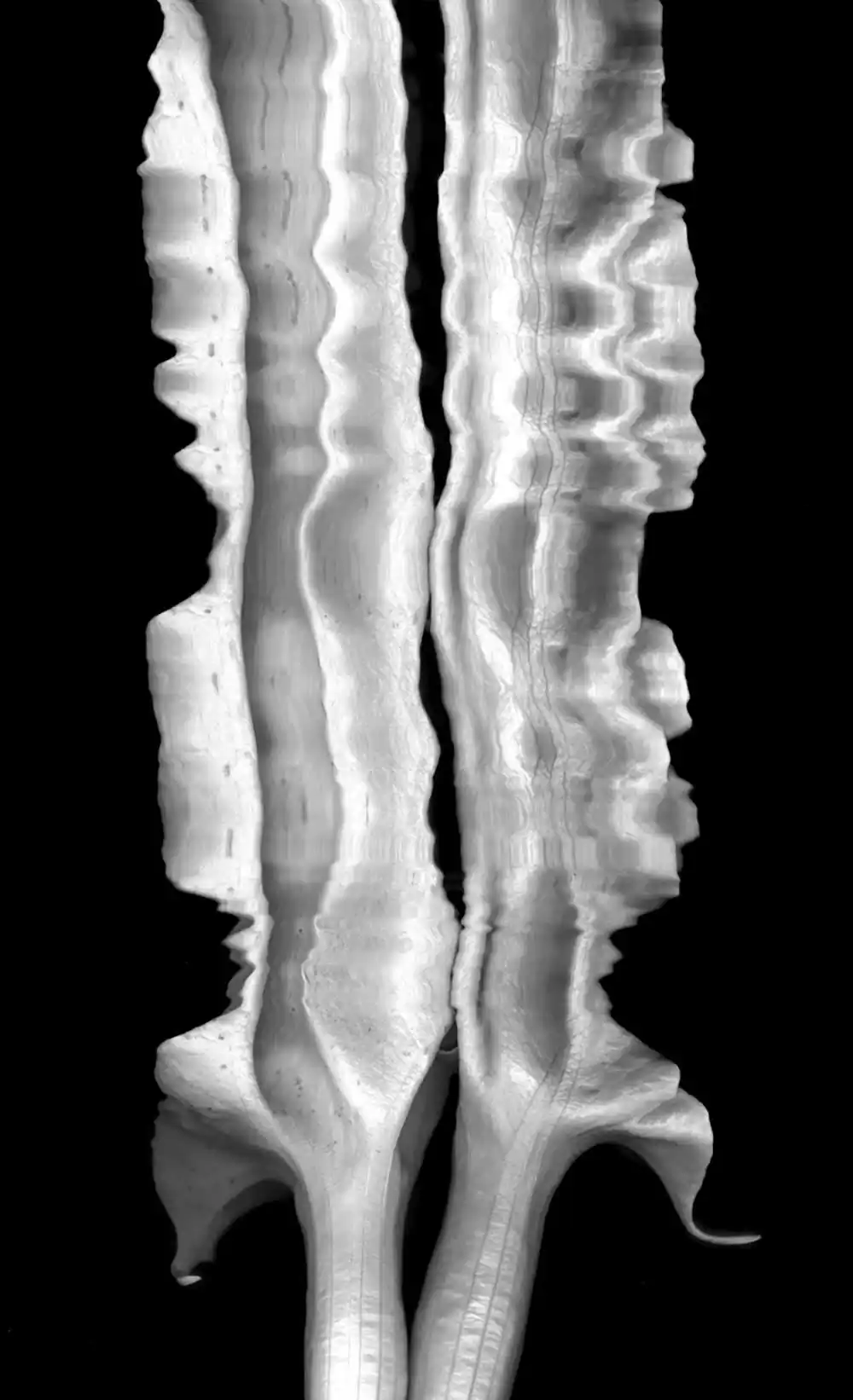 Our garden produces a great number of these “angel’s trumpets”.  From time to time I show up to the studio with the wish to create a new form, having no clue how to make a unique one; they seem to respond to intuition and a driving fierce persistence.  Photo software enables cleanup but never changes what actually gets recorded in the motion images or the stills, always a single frame, always brugmansia.