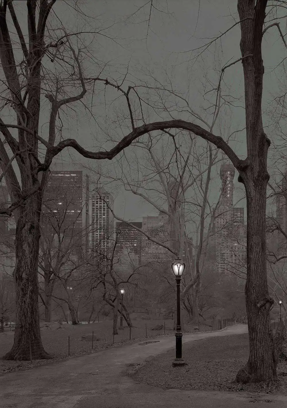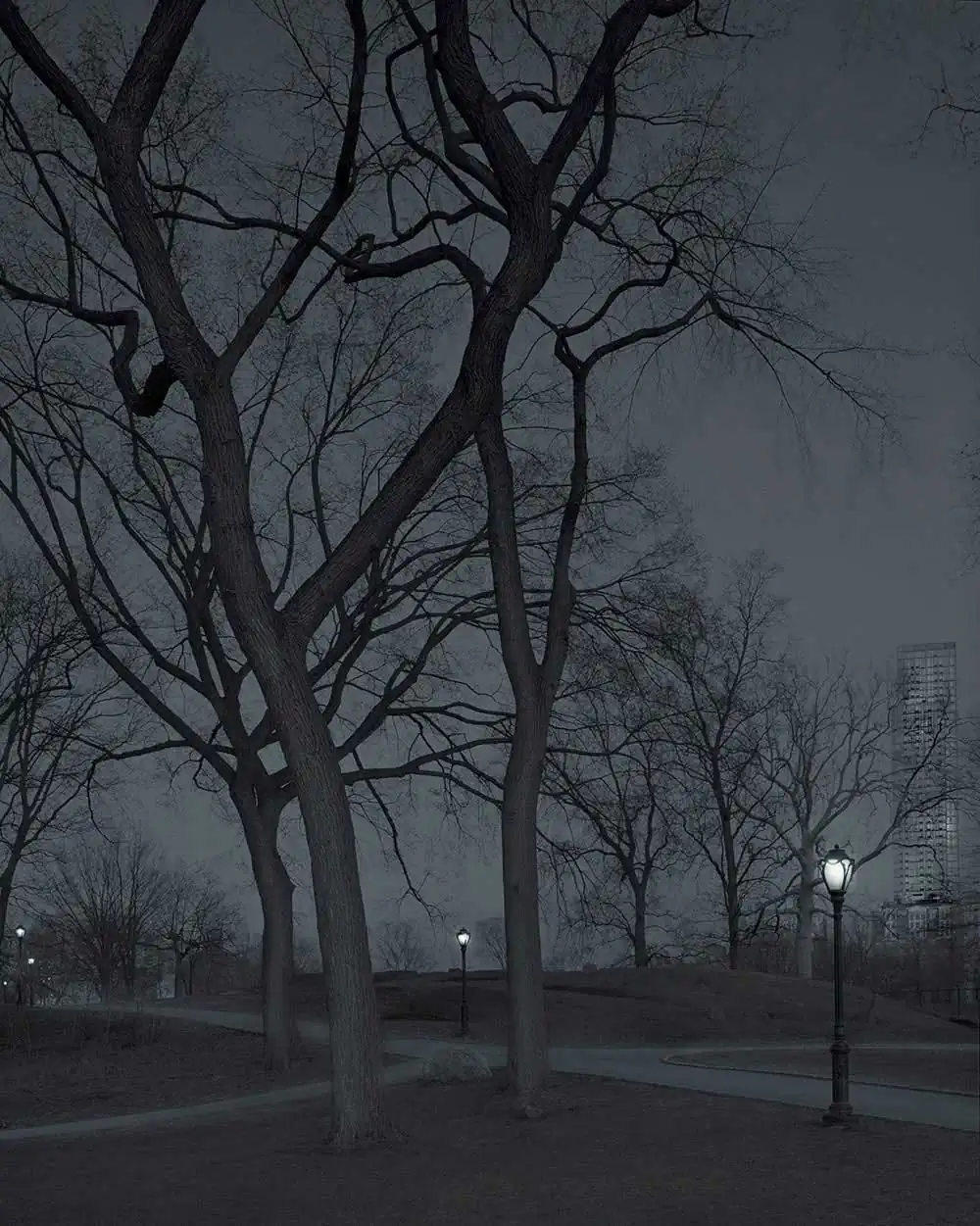 I would commonly take long walks at night, and the park always seemed to be calling me in. I set out to document the park at its most vacant, isolating, and at times, haunting moments. The park appears to go through a period of metamorphosis during those late night/early morning hours, and I was determined to capture it. All of the images are captured using 8×10, 5×7, 4×5 view cameras, slow black and white film developed in a variety of staining developers, and the final prints are split toned gelatin silver prints. I work alone, and I’m the sole craftsman in every step of the process.