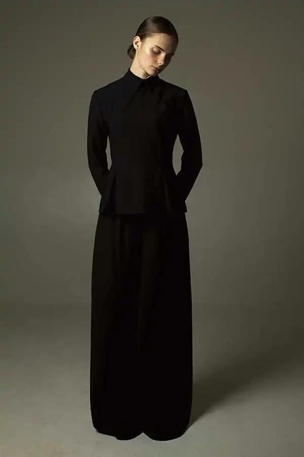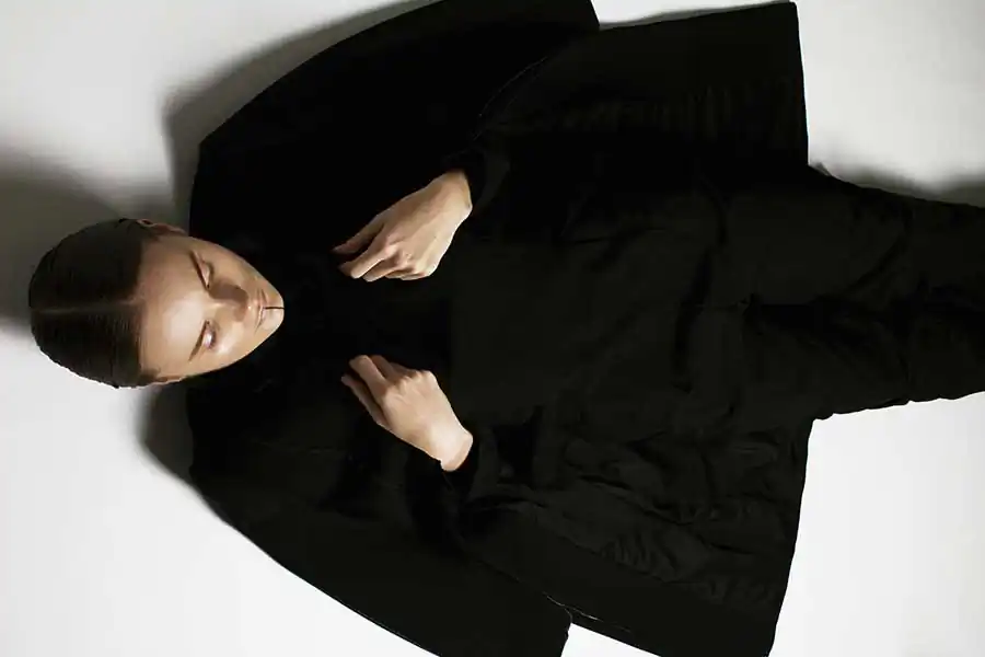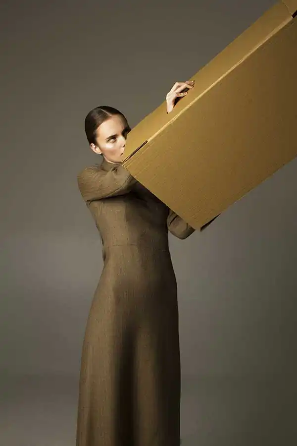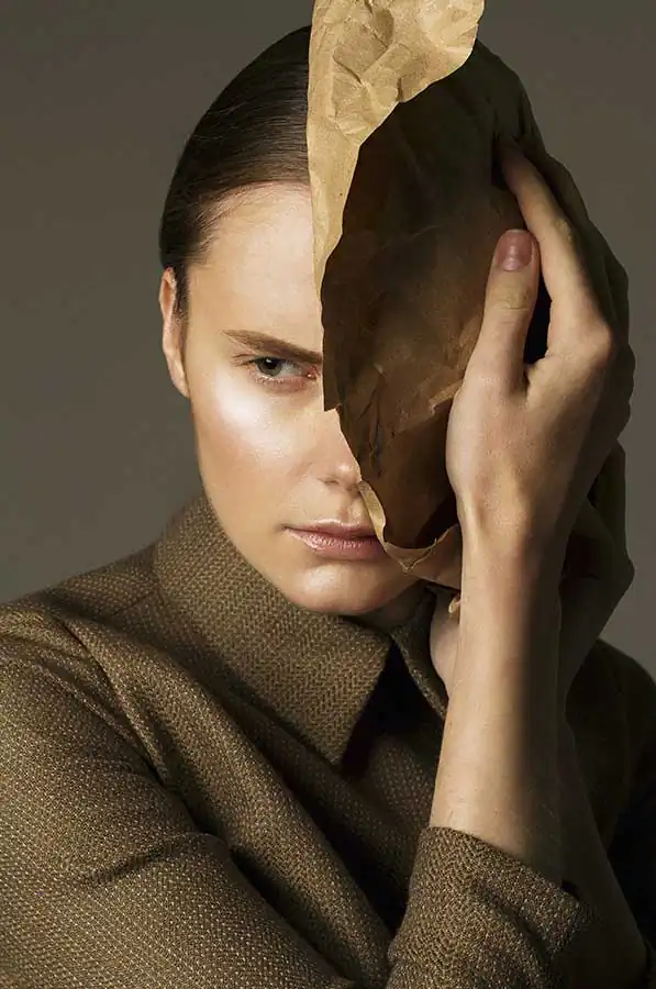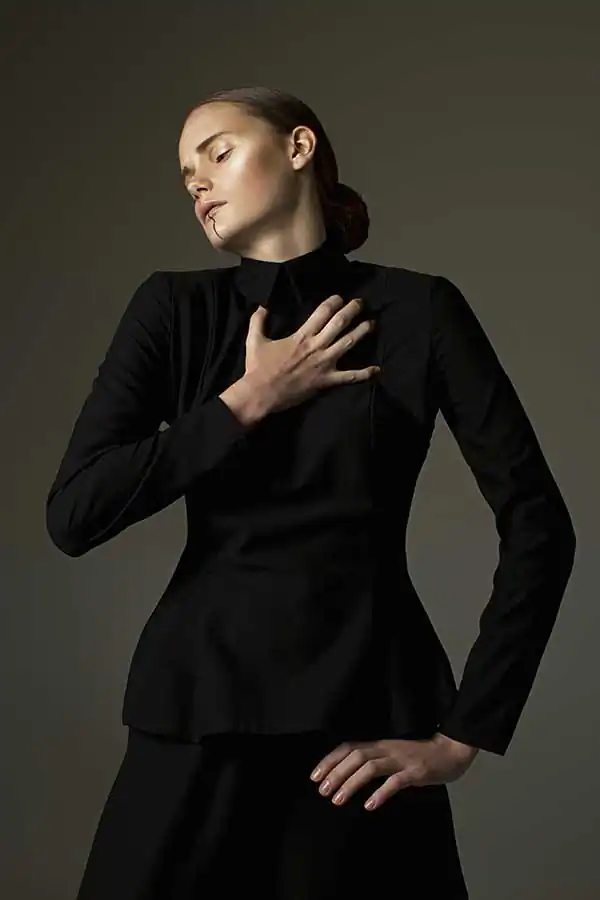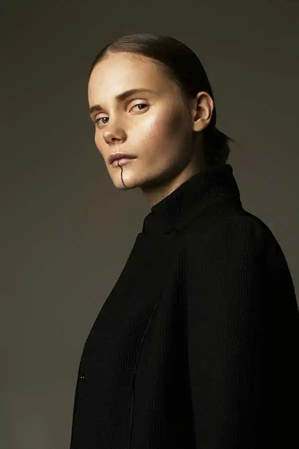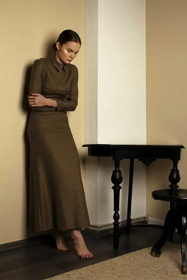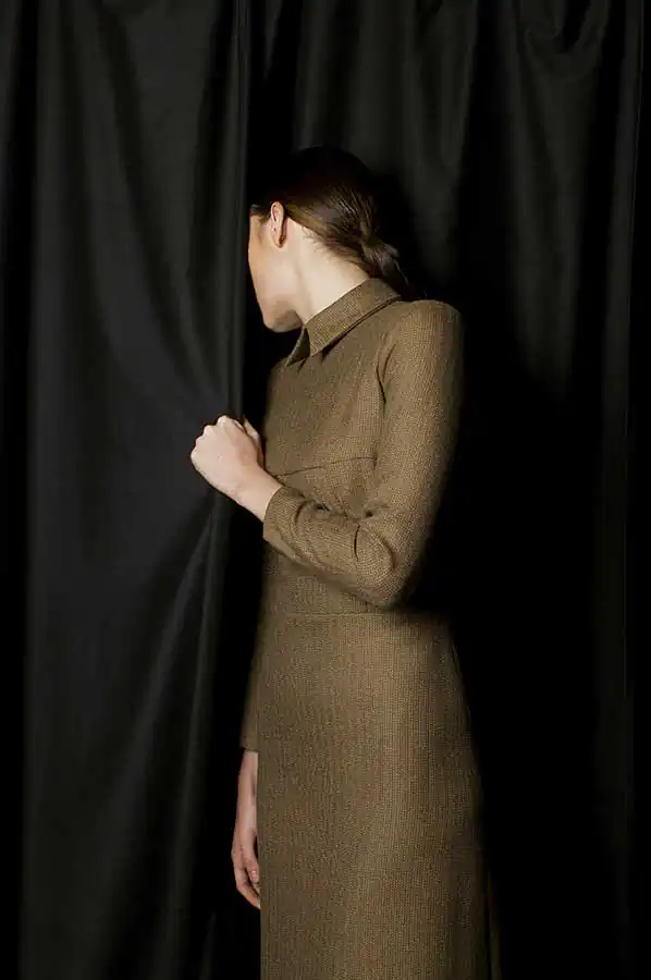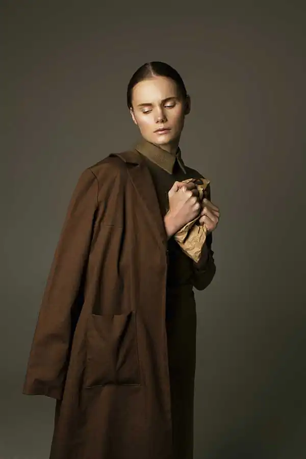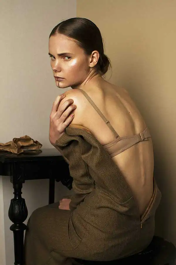 Style shooting is sustained in muted colors of clothing that is both as studio light consisting of two soft boxes – emphasizes the drama of the image. The two studio locations separated by a black curtain that on a plan contributes to a sense of the existence of an intermediate character. Like the protagonist of Kafka it is immersed in himself and his experiences are not interested in the outside world, but constantly feeling their own guilt before him. How are naked among dressed. [Official Website]