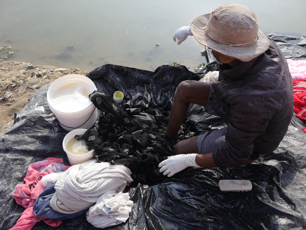 The final phase of Chikankari embroidery includes washing the garments once the handicraft work is complete. A shallow pit is dug where the clothes are first washed by hand and foot.
