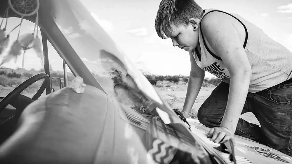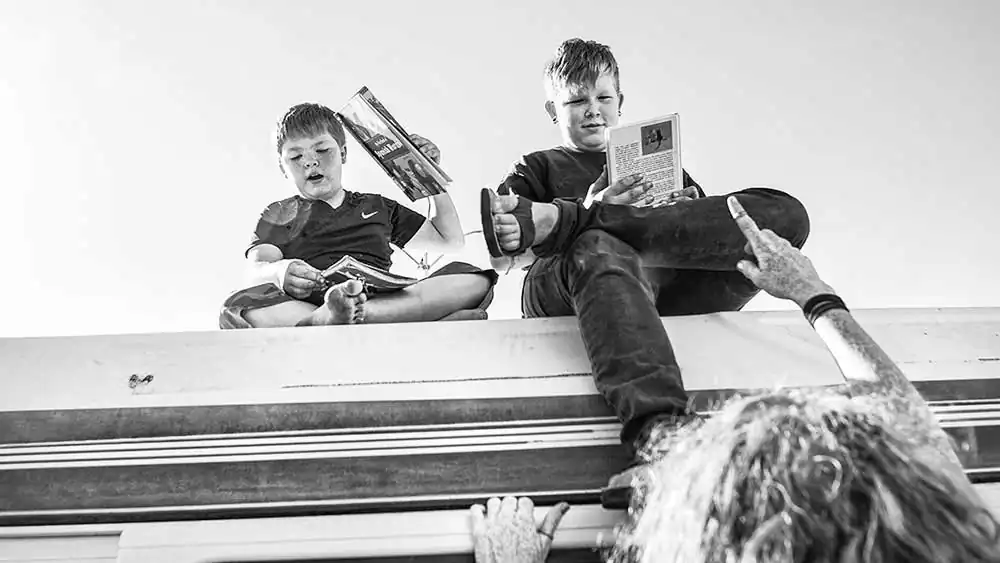 Dia & Sons _ Blowin’ in the Wind “Prepared for nothing. Ready for it” Who has ever experienced that feeling of wanting to pack up everything and leave? To slam the door and take the tangent? To say, «Screw it! » once and for all and finally live their dreams? We all thought about it one day but alas, the routine, the comfort or the fear of the unknown brought us back reason. But not her. One day, Dia decided to ditch everything to achieve her biggest dream: take the road and live in a van with her two sons, Jagger and Bishop.