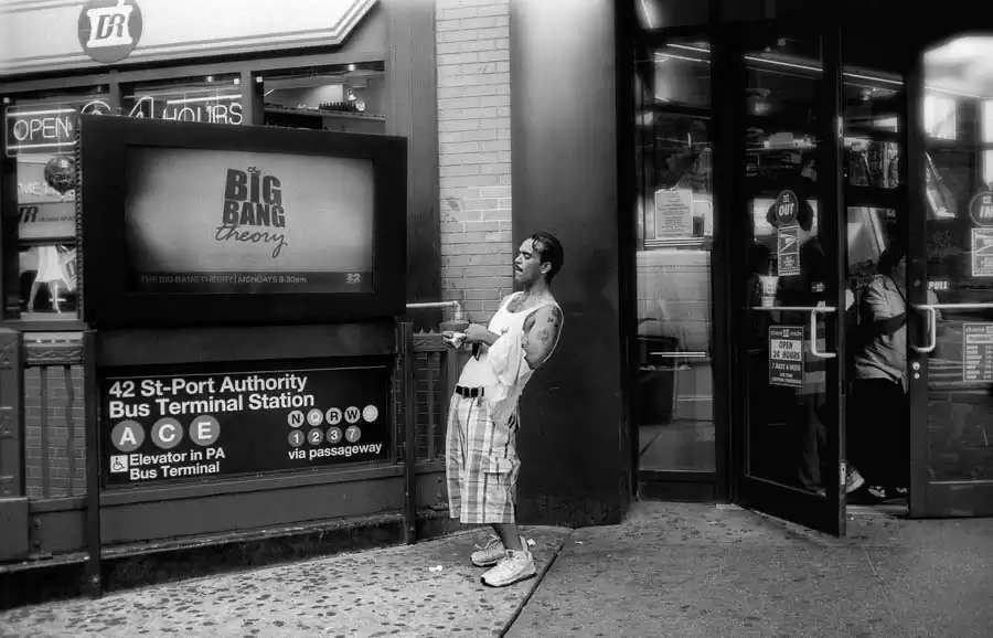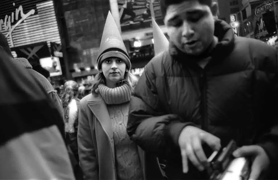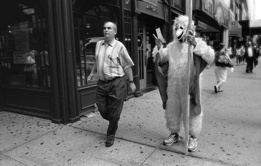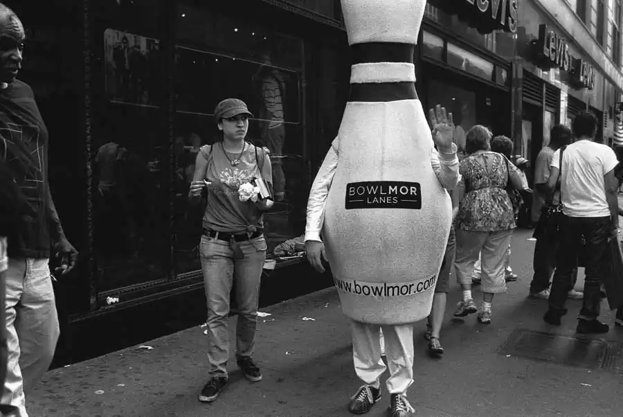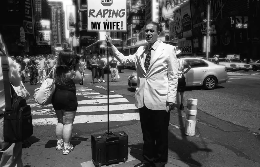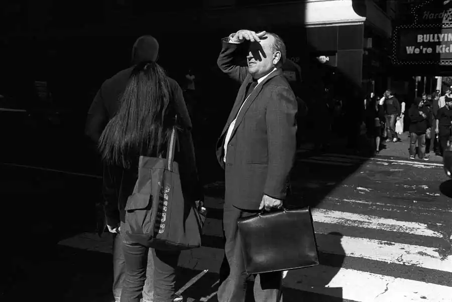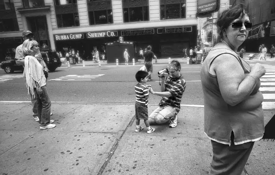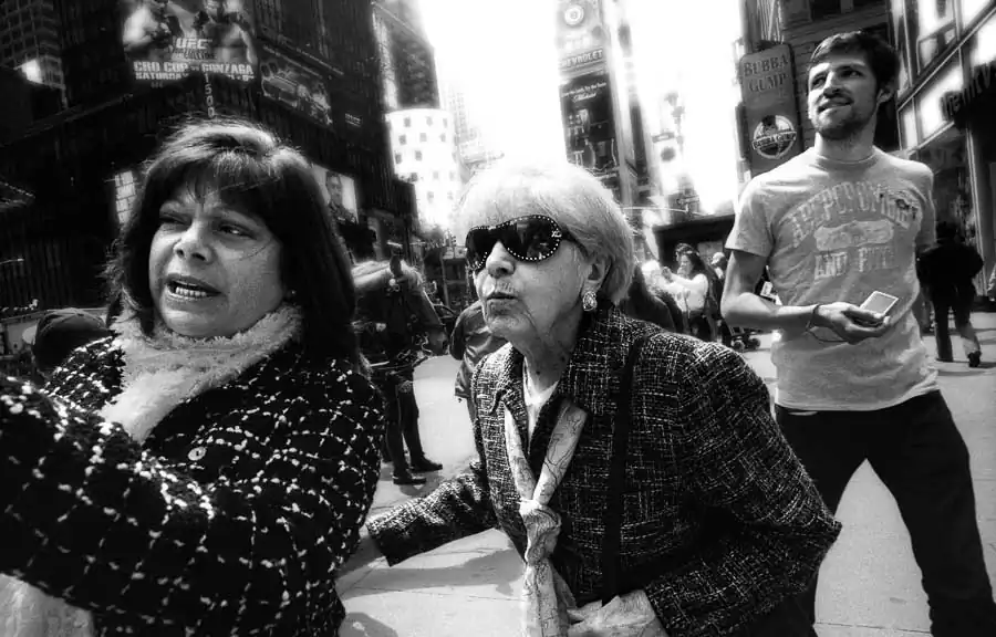 Times Square and it’s surrounding Midtown area is so congested that by itself presents uniques oppertunities. You can stick a camera in someones face with nary a blink. I favor wide angle lenses, usually 28mm to 35mm. So filling the frame requires me to move in as close as possible, one of the perks of the crowded urban landscape.