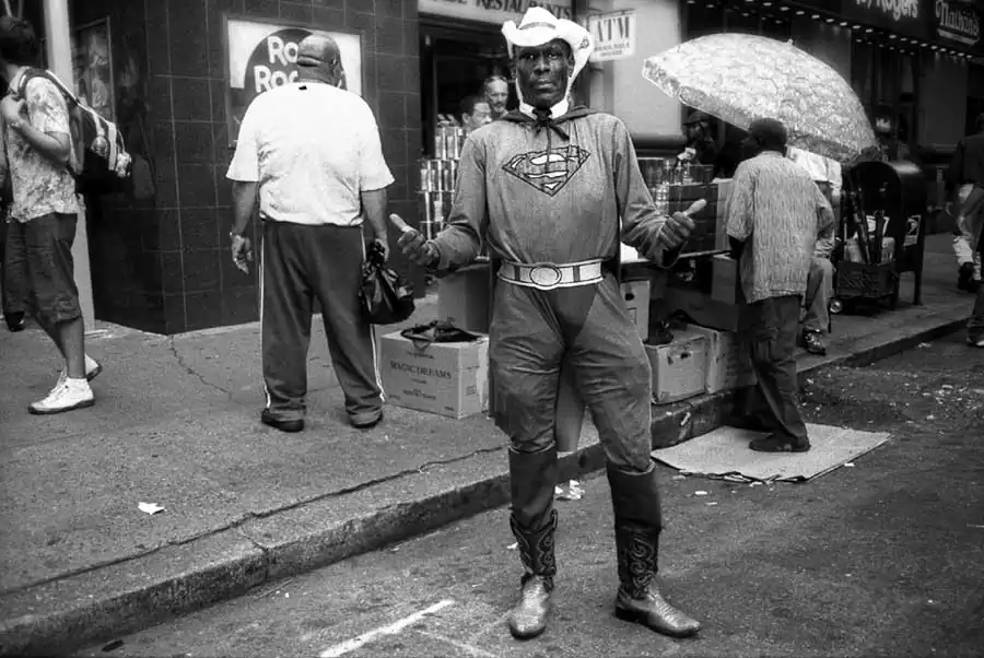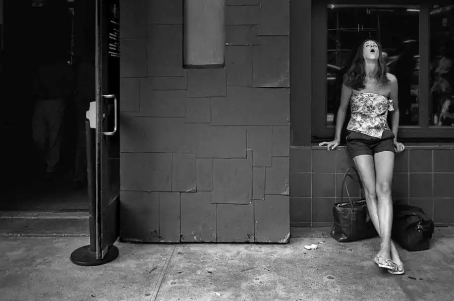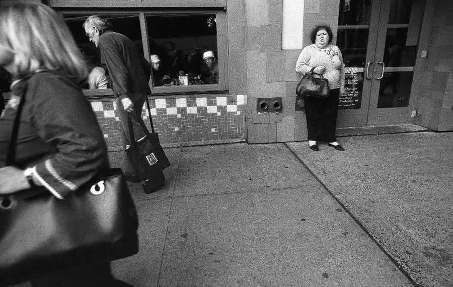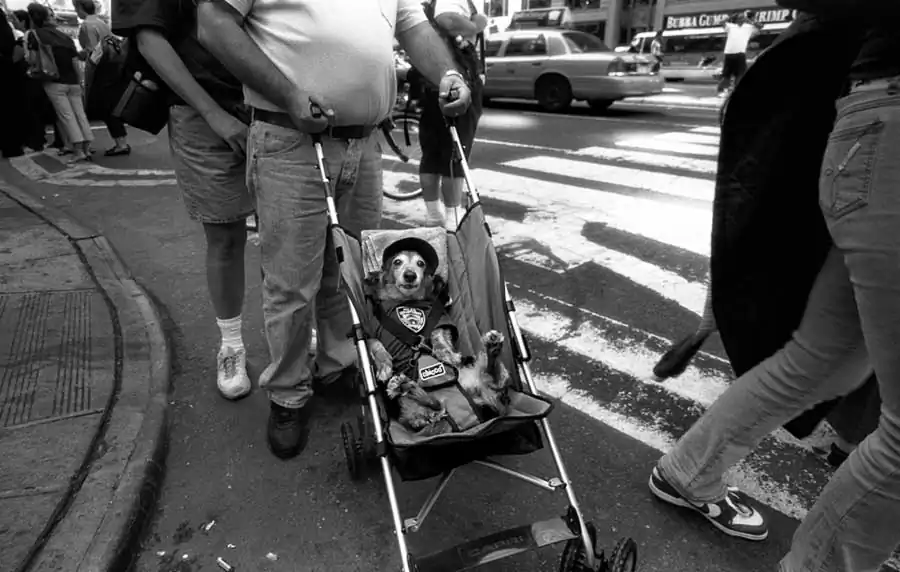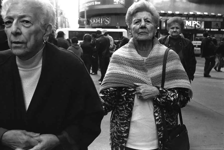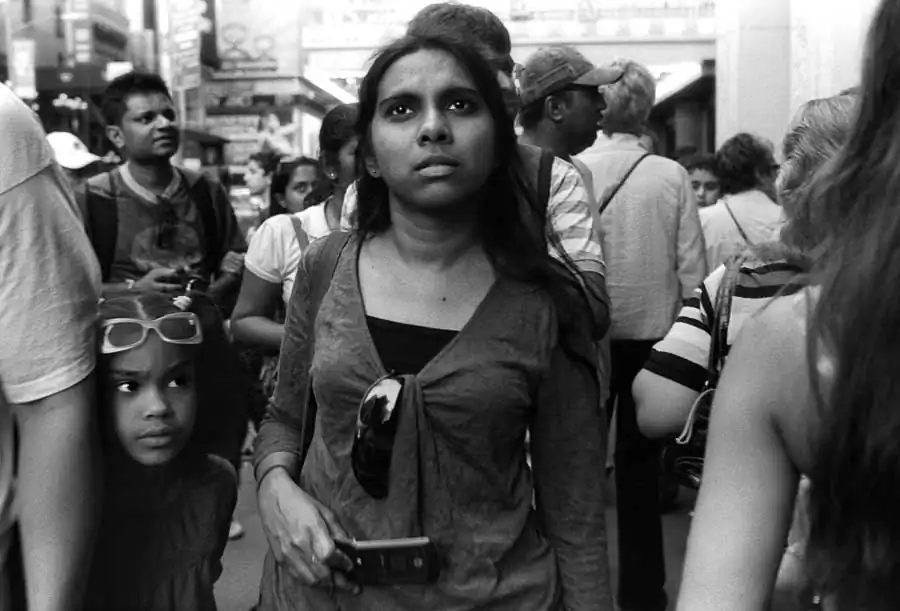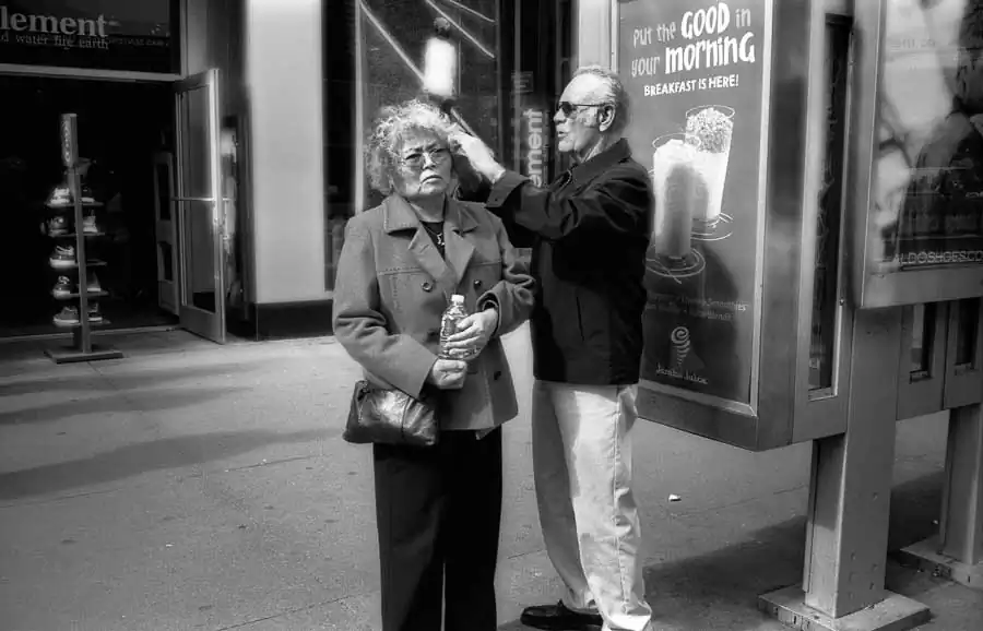 Times Square and it’s surrounding Midtown area is so congested that by itself presents uniques oppertunities. You can stick a camera in someones face with nary a blink. I favor wide angle lenses, usually 28mm to 35mm. So filling the frame requires me to move in as close as possible, one of the perks of the crowded urban landscape.