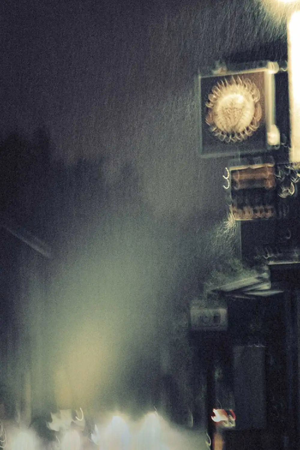 At night, another transformation unfolded. Darkness consumed the streets, leaving only fragments of life visible: the glow of headlights from passing cars, the solitary lamp on the bridge. Many of my frames contain only one light, placed deliberately. That light became symbolic, carrying memory and dream.
