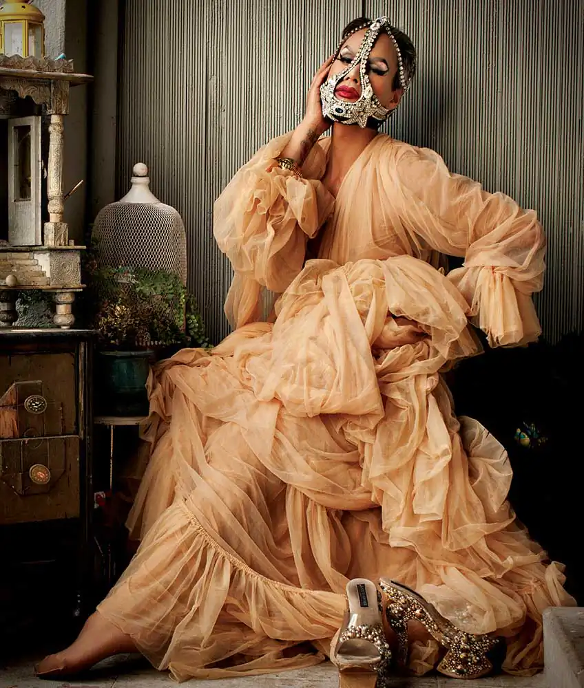 ‘Or if I have a specific idea, I cast the queen in my mind and invite her to come and play in my studio. Drag queens are used to playing with masks, to hiding and revealing themselves, so they’re much more relaxed in front of the camera than other subjects’