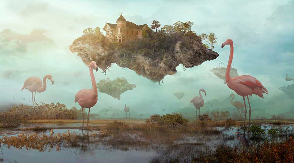 It is hard to see what is becoming of nature because of people’s negligence. By placing the scenes inside natural environment, I like to show magical situations in nature which happen when we are not looking. The scenes have cinematic feel, like some movie that is happening with actors such as elephant, flamingos, giraffes.. Although this time they are not in their natural habitat, but in some other fantasy world.