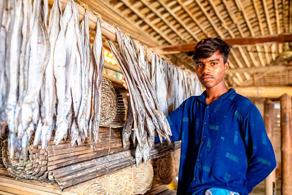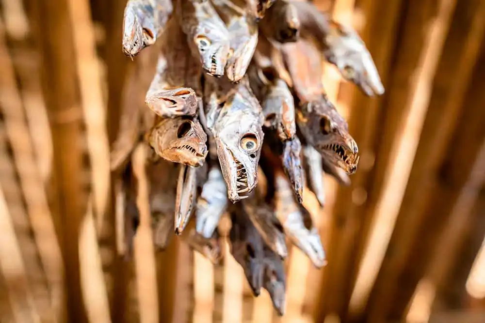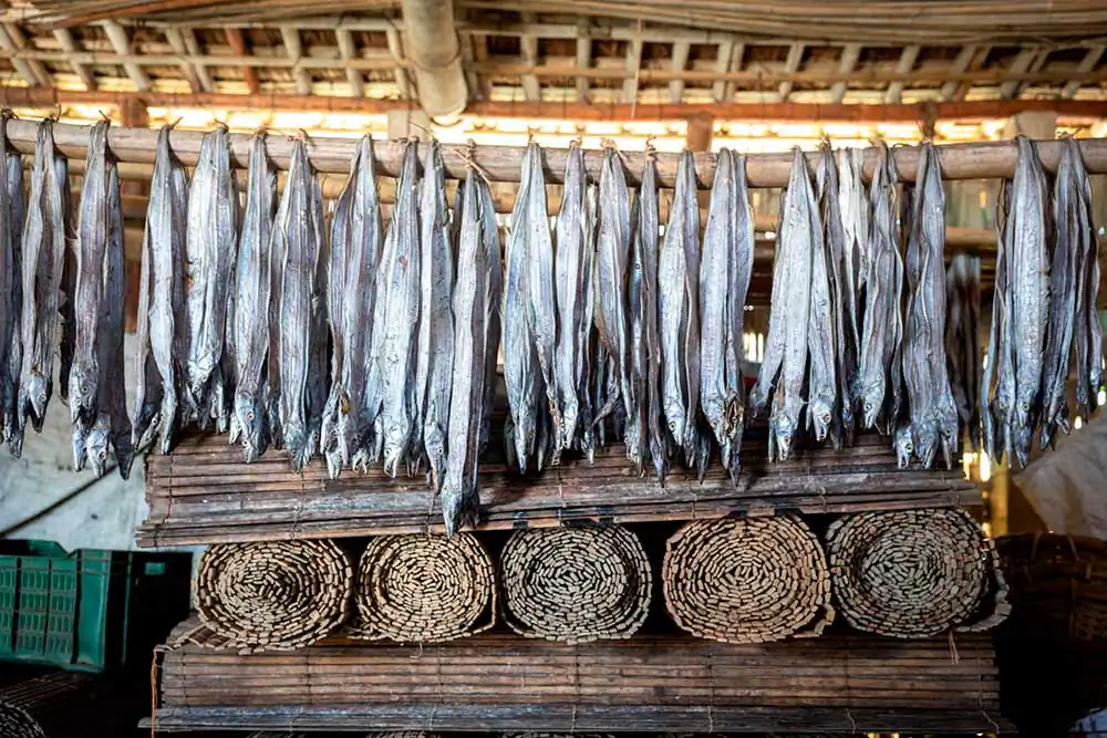 The smell of dries fish is hanging in the air, as the entire village is involved. After sun drying and line drying the fish, the wholesalers are coming to buy the catch of the day. From there onwards the fish is distributed over the whole country.