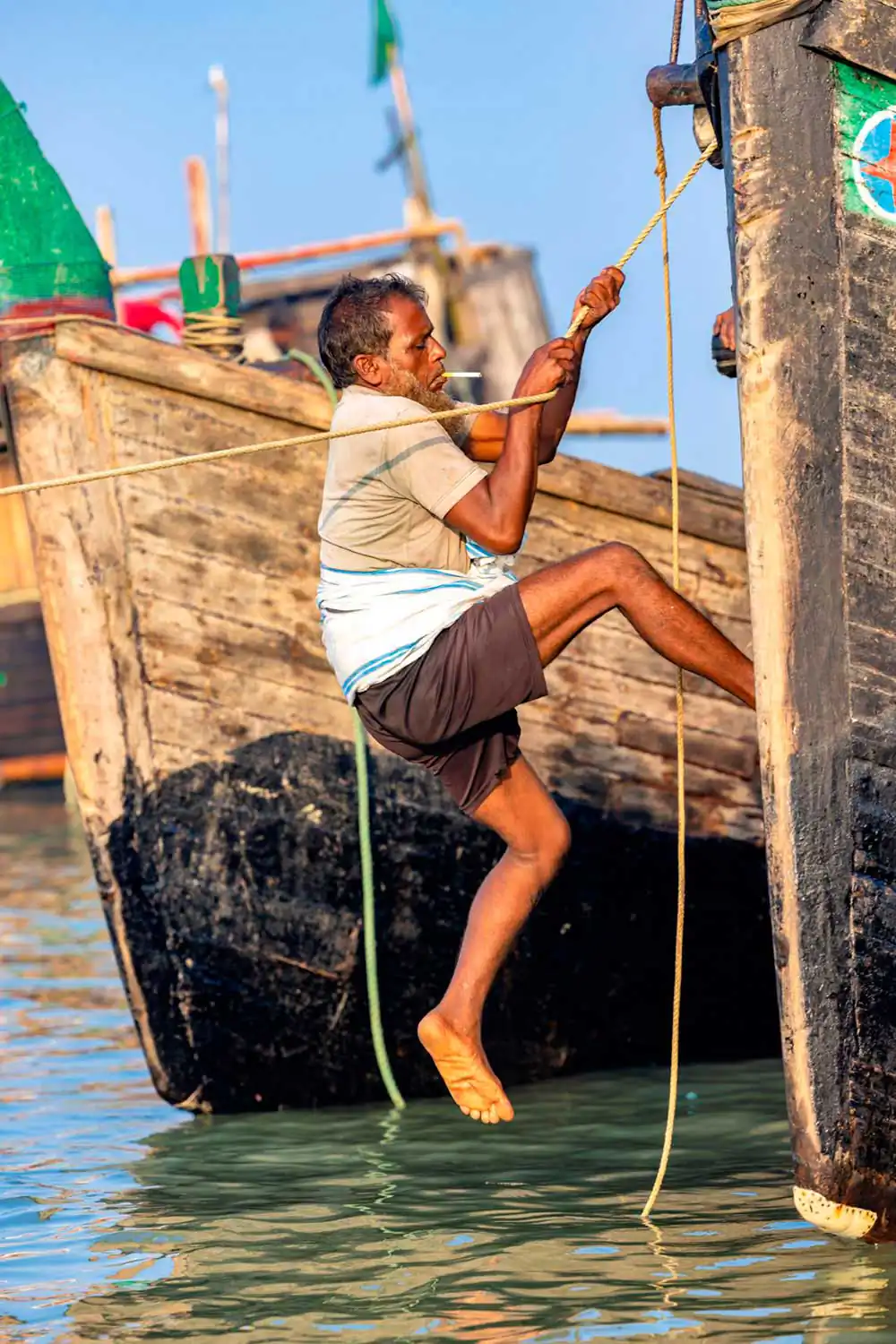 Late evening the fishermen, a trade passed on from generation to generation, are leaving the village in their wooden fishing trawlers. The average crew consist of about 15 team members, and during the night they try to catch as many fish in their nets as possible.