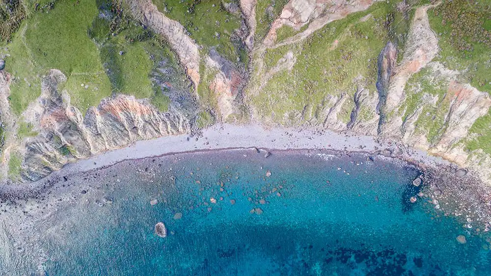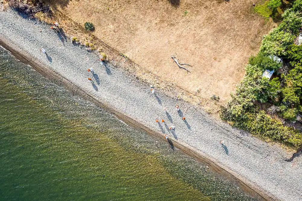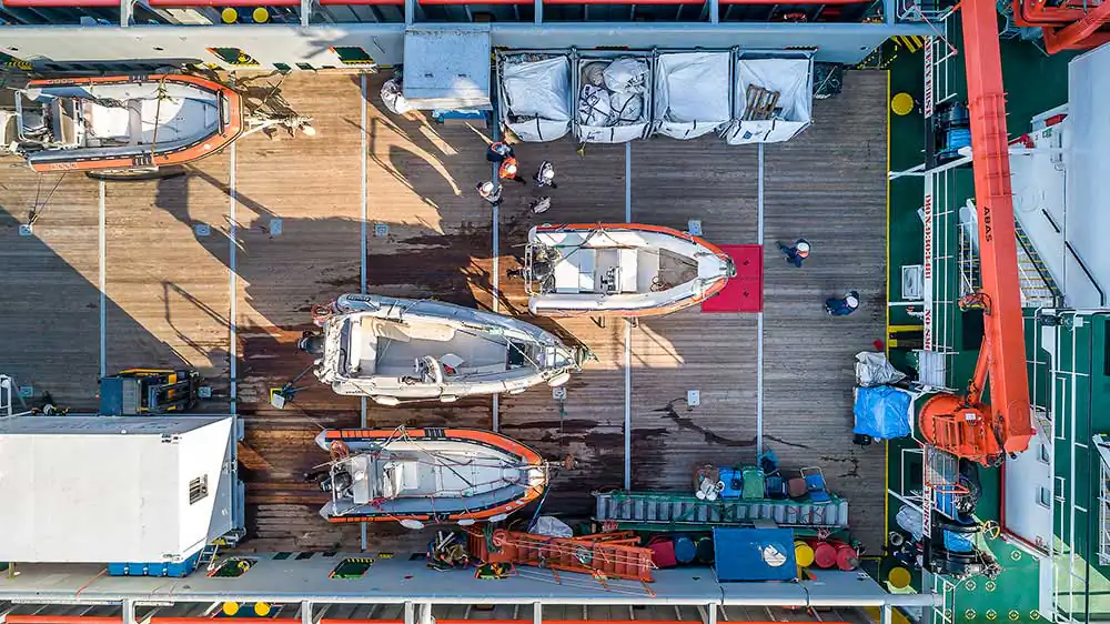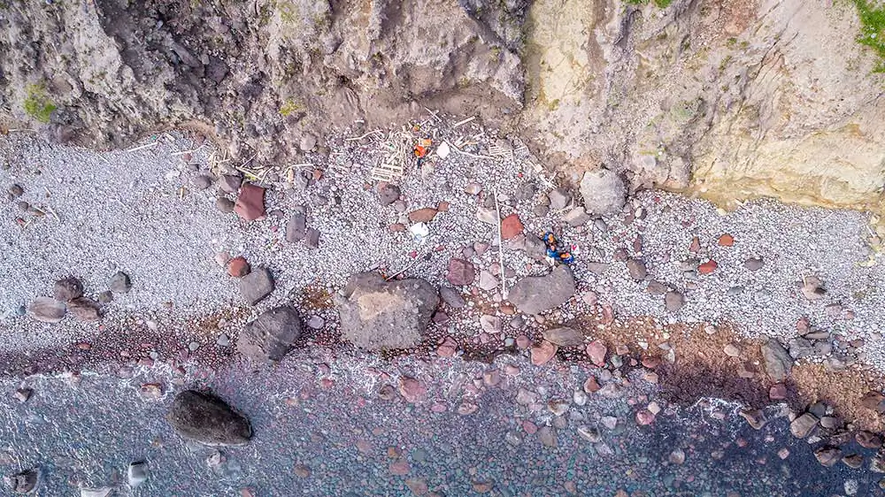 Following the crew’s schedule and living onboard the Typhoon vessel, the visited shorelines were photographed during the cleaning operations. The daily schedule consists of two shifts – morning and afternoon – with an intense routine to maximise the available time, given the heavy-duty conditions of cranes lifting the zodiacs, carrying various equipment and difficulties approaching beaches due to terrain and weather while maintaining safety protocols. Emphasis is given to remote locations difficult to approach by land, for which 3 zodiac type boats along with a crew of approximately 20 people collect litter to be taken onboard the vessel for separation and storage management before their final recycling destination in specialised processing facilities on land. The coordinates, shoreline mileage, weight and type of garbage are recorded as well as the before and after condition of the beach.