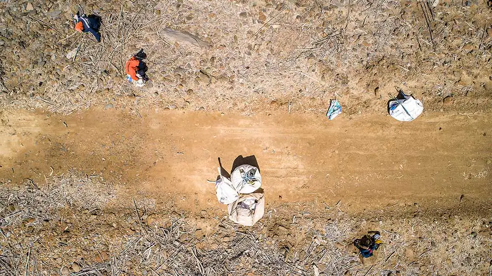 The photographic approach was a multi-perspectival one, using various types of photography to provide a comprehensive coverage, include and portray multiple perception modes. Reportage was used to capture the actions of the crew in closeups to emphasise the work and in wider frames to also present the scale of the landscapes in candid moments. Panoramic images take this farther with stitched images that open the vistas and the human element becomes less dominant, allowing the locations to become the main subject. Long exposure photography with neutral density filters was used when appropriate. This effect adds an extra layer to the passage of time and strips the scene from distractions towards more fine art representations. Drone photography was also used to capture aerial images of the extended locations and broaden the scale even farther. Extra attention was given to planar aerial images that are a product of a more meticulous and intuitive investigation of the terrain. Such images looking straight down from different heights capture the scope of the operations in various scales, while at the same time bring out the formalistic elements of the surrounding environment. They also ended up providing a subliminal connection across the variety of visited locations, creating a series of images that can stand alone as iconic pieces. This multi-perspectival approaches has lastly accompanied with videography using footage shot in real time and in time-lapse and hyper-lapse passage of time.