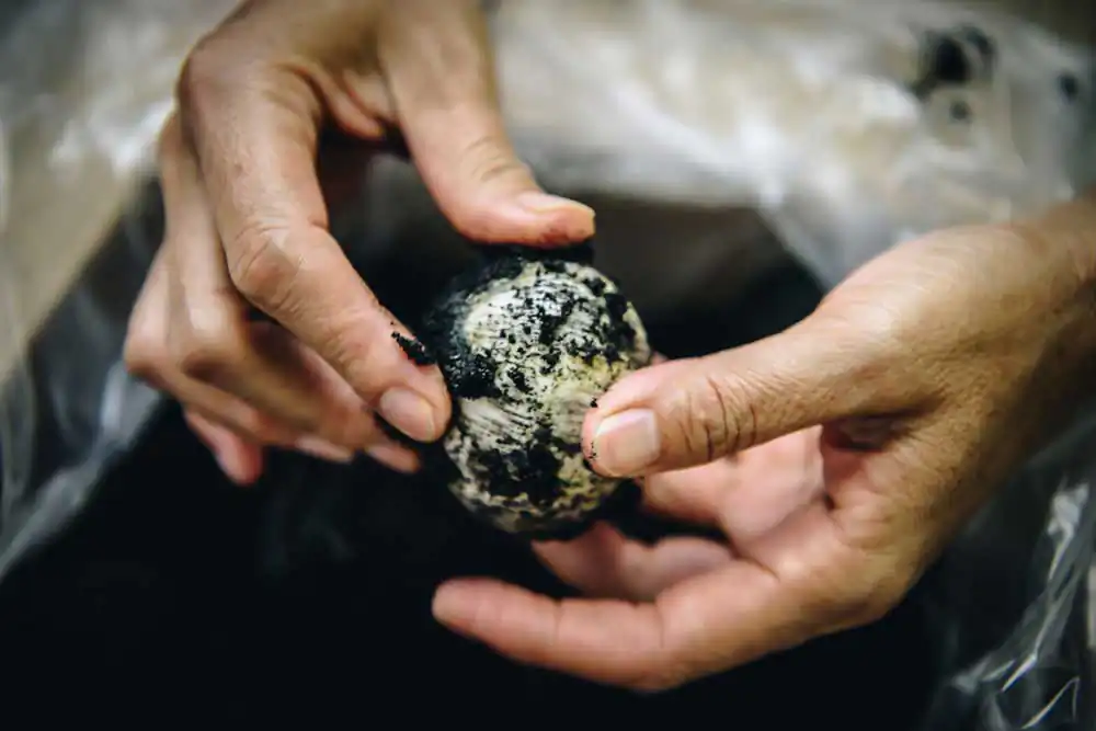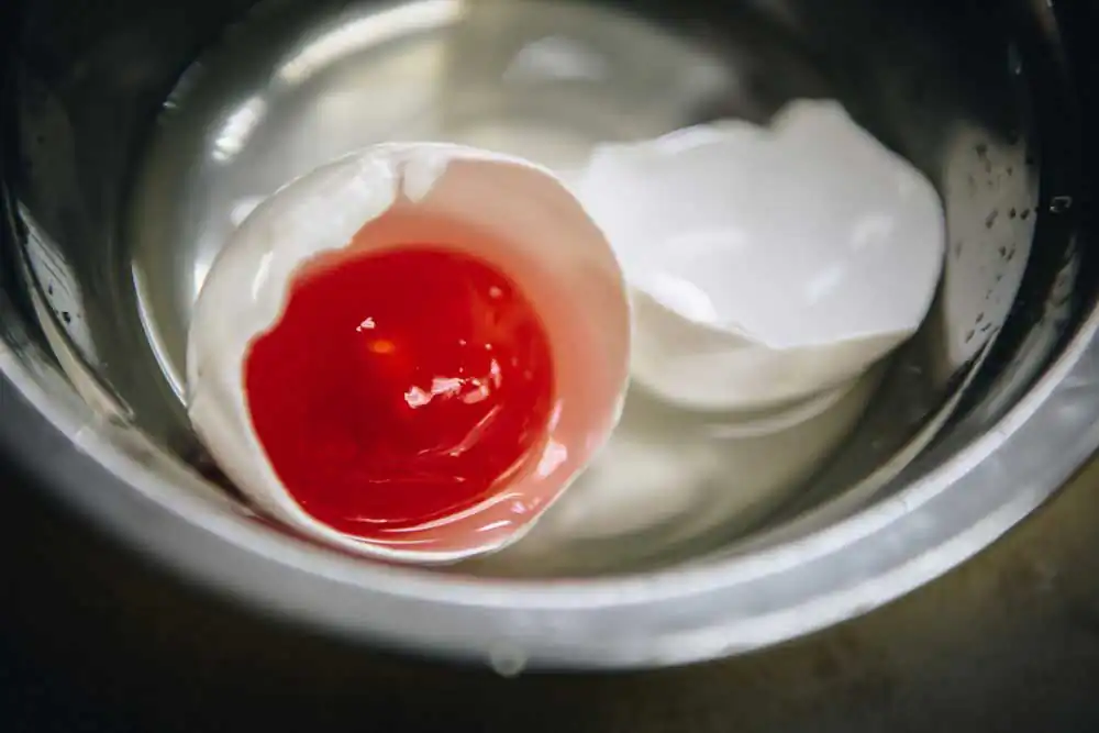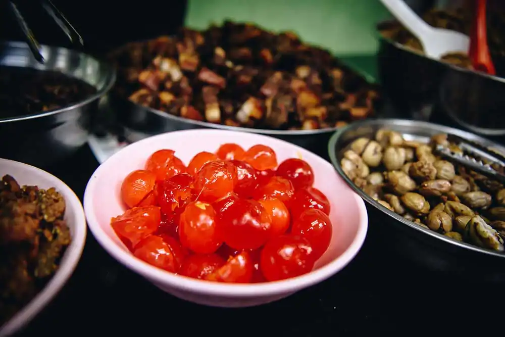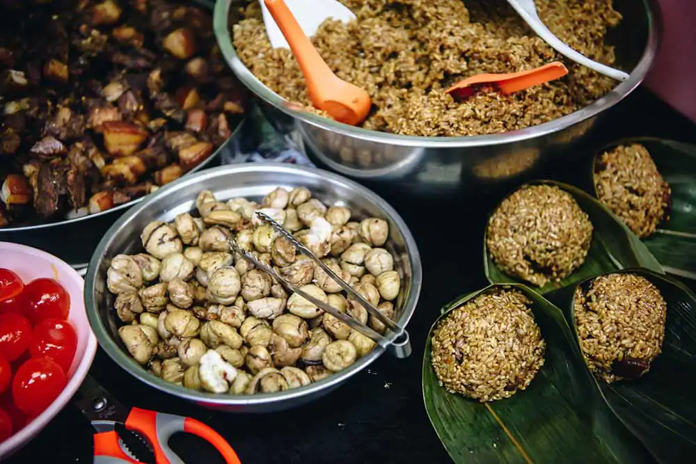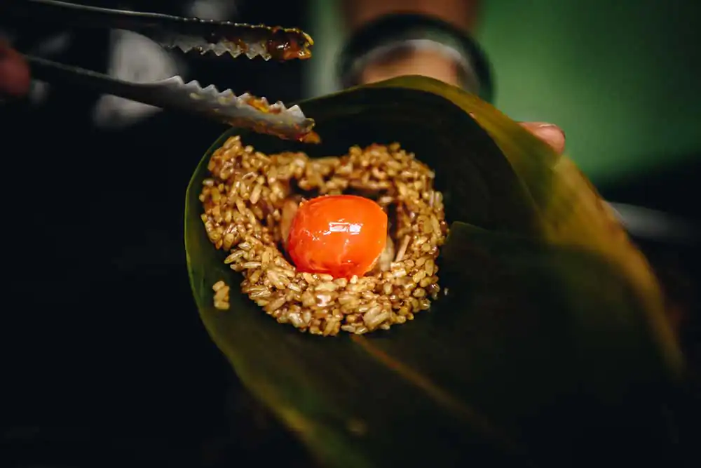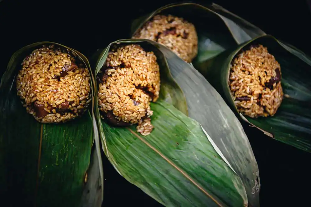 These savoury Bak Chang are made from sticky rice filled with diced pork marinated for two weeks, chopped shiitake mushrooms, dried shrimps, chestnuts, a mixture of spices, and bright orange salted duck egg yolks put in the middle of the bamboo cone. Marinated pork and chestnuts add texture and a bit of sweetness and give the rice a dark brown appearance. Made by soaking duck eggs in brine or packing them in damp, salted charcoal paste, rich and fatty salted duck eggs yolks add a touch of colour and particular flavour. Similar to Nyonya Chang, they are wrapped in bamboo leaves and steamed.