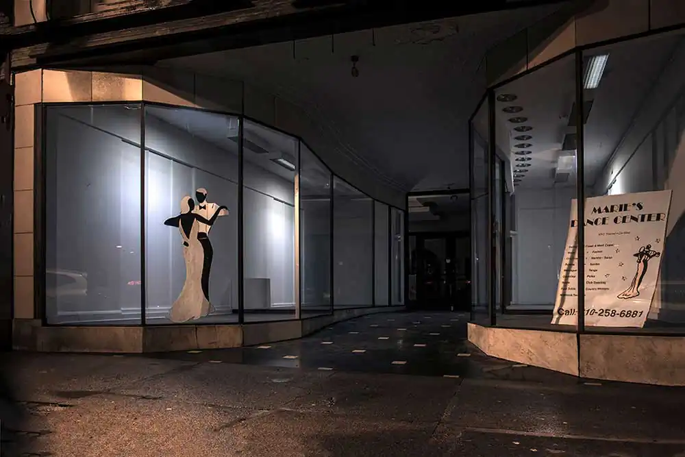 The exercise soon evolved into an obsession, not just with the night or night photography, but with stages and places which we all create and where we act every day. The night spotlights, isolates and minimalizes what we see; and stripped of its makers, our fabrications awake with an animism, which  hypnotizes, fascinates and engages. It does not reveal the macabre often associated with the night, but a beauty and elegance of our man made environment.  Sweaty Toyotas take precedent over Cadillacs; signs and poles lean in soft repose, and a plastic rubbish can takes on sculptural importance that would make R Mutt proud.  Its’ geometry, complexity, and layers built on layers, are all intended to contain, protect and organize, while the street lighting spotlights our doors which seem as portals to other worlds. The scattered words act like endless Edward Ruscha paintings, sometimes humorous, sometimes serious, but always telling. It is a world painted with its own color wheel, visually rich and virtually endless; this is our creation.
