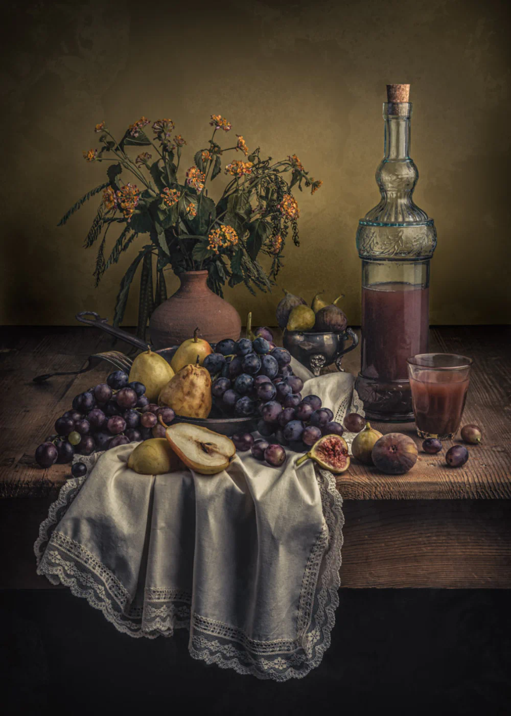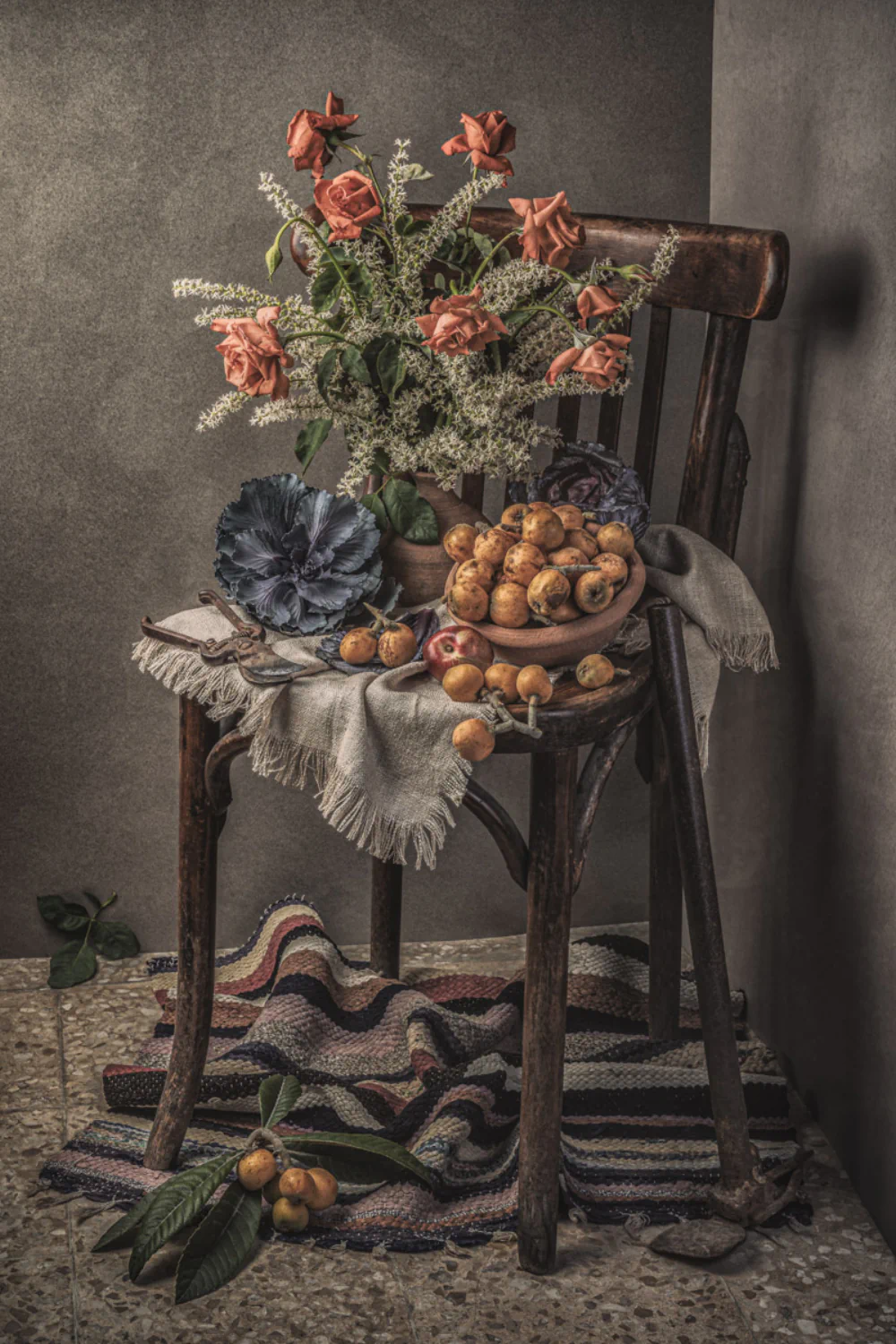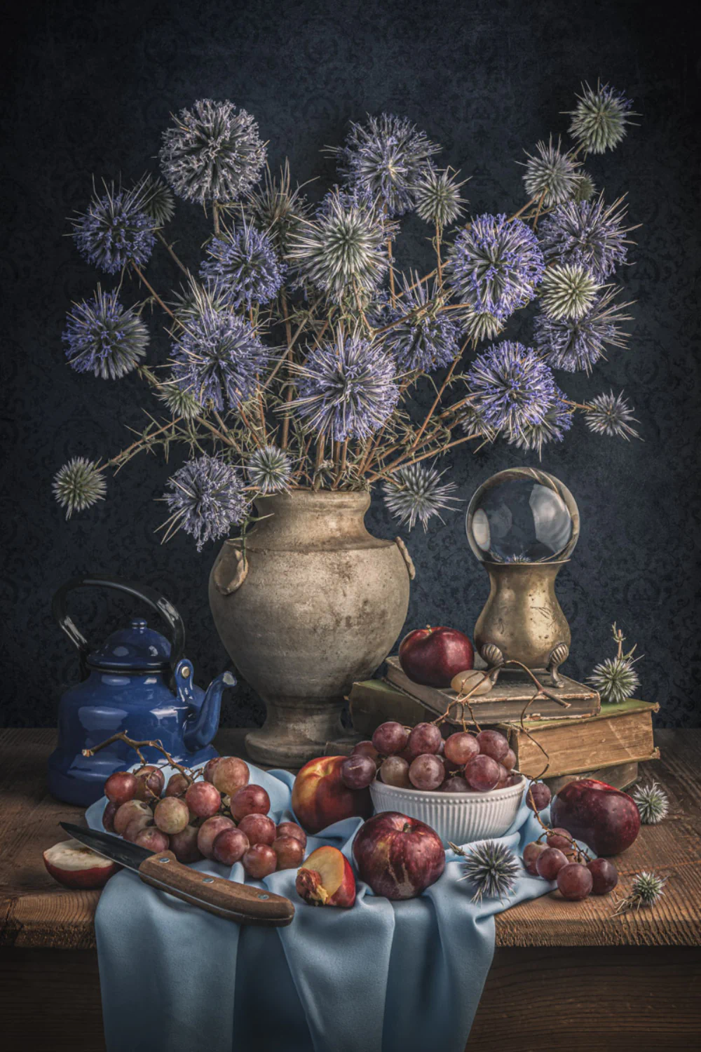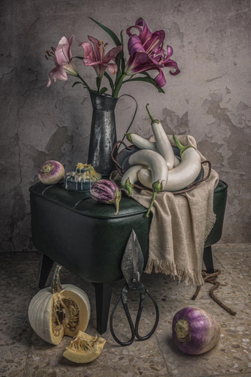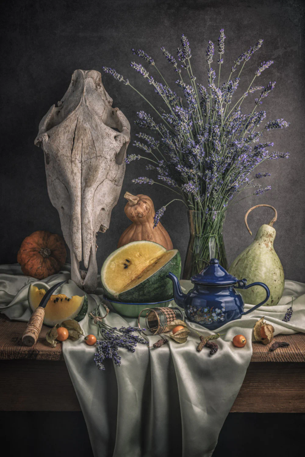Digital editing is an essential part of the creative process. Through post-production, the original photographic image evolves toward a painterly aesthetic inspired by the visual traditions of Renaissance and Baroque painting. The intention is to create images that evoke the feeling of classical still life artworks, blurring the boundary between photography and painting.