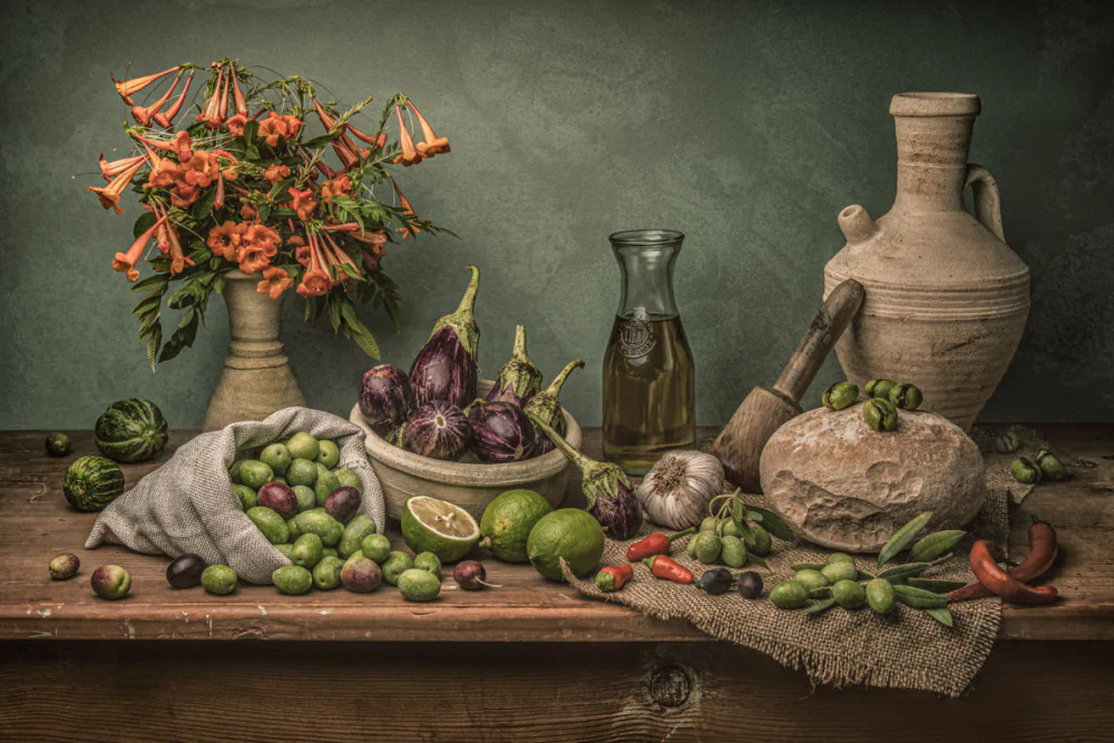 Working primarily in still life photography, Sleiby creates carefully staged compositions inspired by the aesthetics of Renaissance and Baroque painting. His images often combine locally sourced fruits, vegetables, flowers, and vintage household objects that reflect elements of traditional Jordanian culture and everyday life.