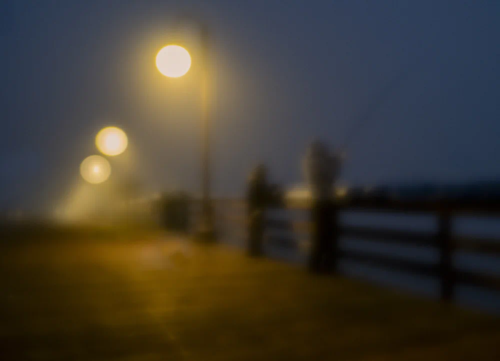 Color plays a central structural role in the work, particularly the dialogue between yellow and blue. Yellow appears as a diffused warmth, the glow of streetlights in mist, the fading trace of sunset, or the trembling reflection of light on water. It suggests invitation, vulnerability, and the delicate warmth of human connection. Blue, by contrast, introduces distance and quietude through fog, early morning light, and open expanses of water or sky. Together, these two colors establish a visual rhythm between warmth and solitude, familiarity and uncertainty.
