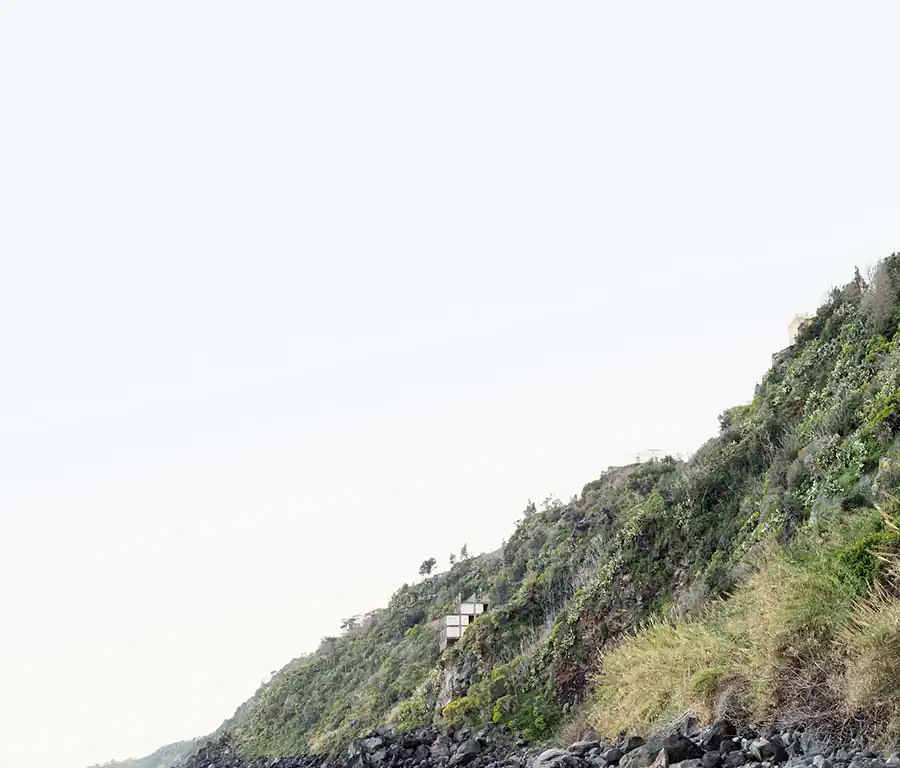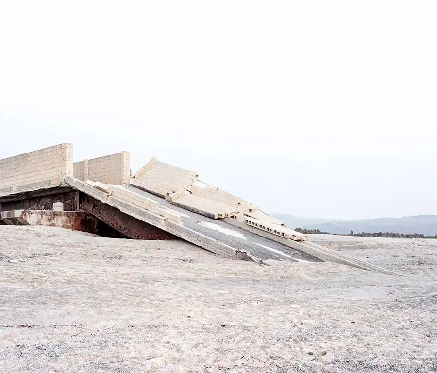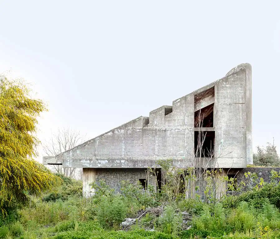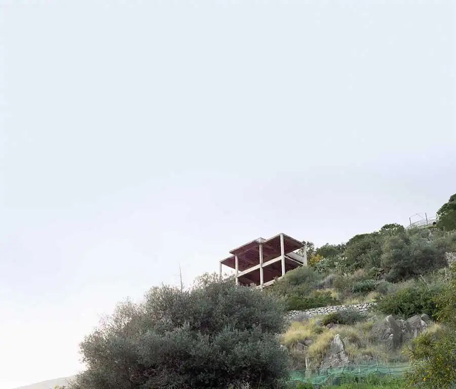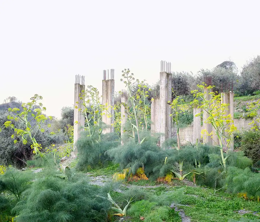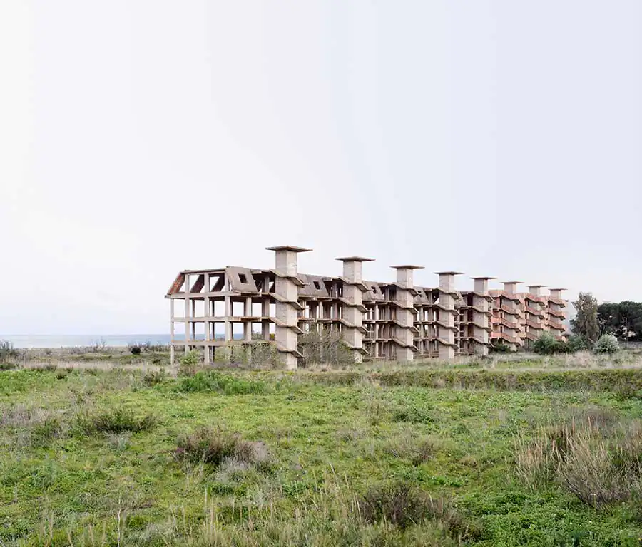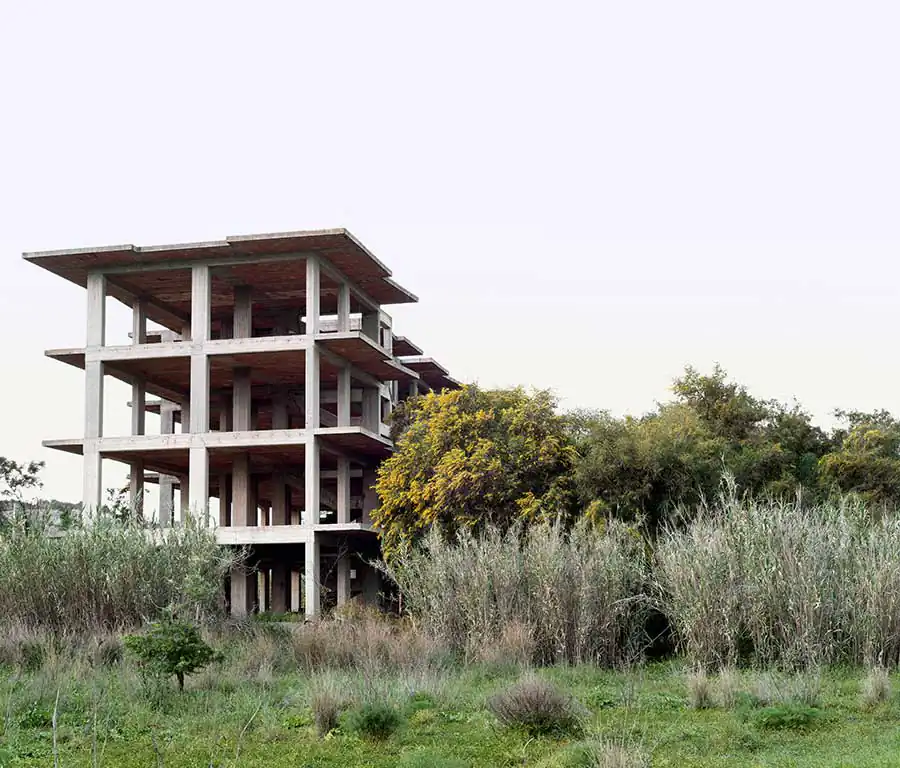 « On each photographs, emanates a disquieting strangeness: unfinished villa, ghost dam or building left as skeleton, all architectures refect a real estate disaster. Their concrete body, naked and disarmed, accuse also a premature aging, cracks overgrown by vegetation or first signs of crumbling: the ruin threatens, especially palpable in a vitality lush greenery seizing, coniferous forest erected on a mountainside, palm trees and passion fruits, tall fennels with yellow fowers. In the manner of ancient ruins, these human constructions which seem to getting back to nature, to be reabsorbed by the environment they emerged one day. »1 Concrete skeletons of major projects remained pending, of unfinished buildings, recurring patterns of our time afected by socio-economic upheavals, become also, because of their incompleteness, interstitial spaces of indeterminacy, conducive to a photographic quest, exploring the possibilities of a singular reinvestment of the world: they are proving to be, spaces and indefinite forms that have, due to their incompleteness, a «becoming-other» that the design of the initial project had dedicated them.